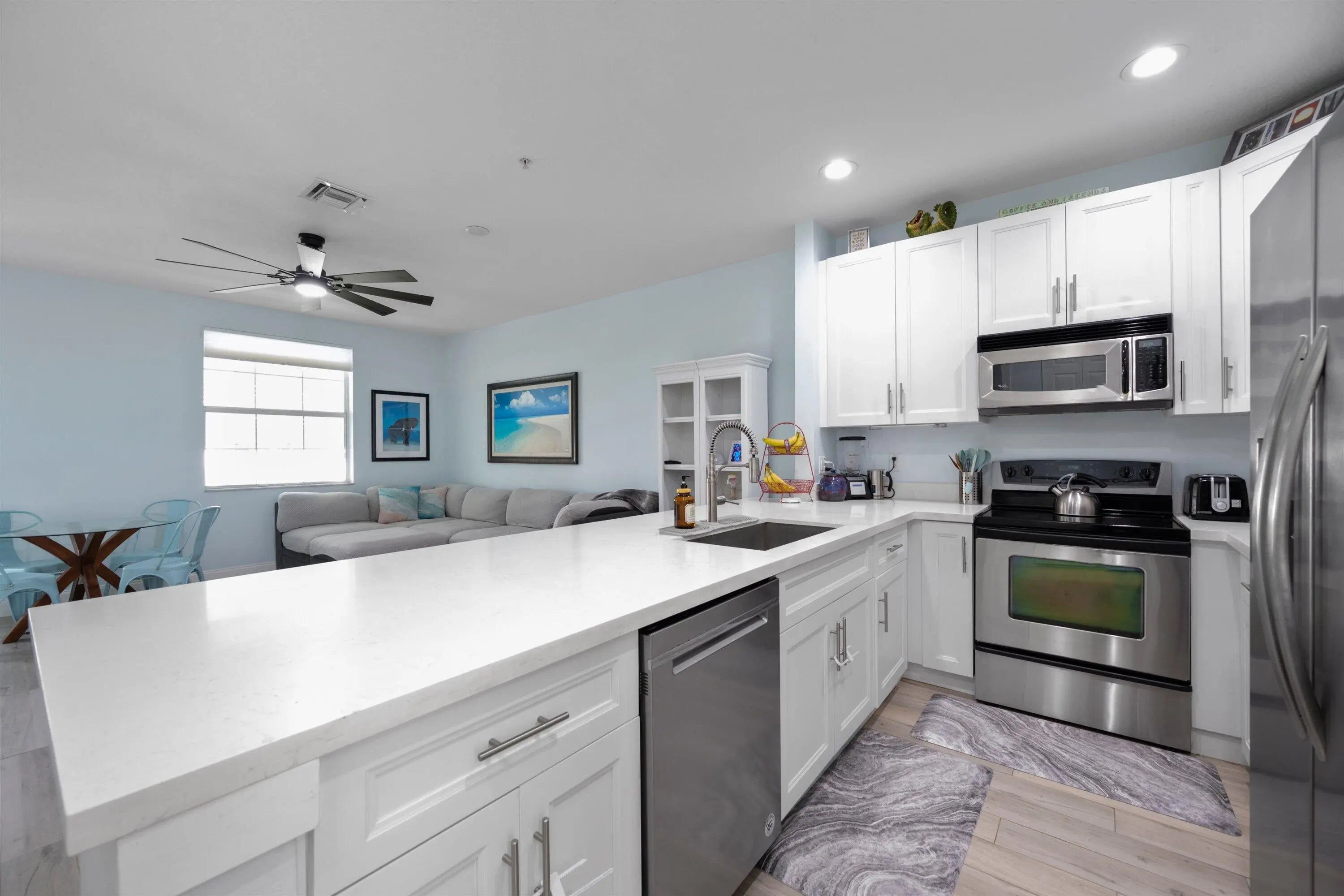 Experience vibrant downtown living in the heart of Abacoa Town Center with this stunning and spacious three-story townhouse overlooking a charming courtyard. This updated residence offers 3 large bedrooms, 3.5 bathrooms, and a versatile bonus room that can serve as a fourth bedroom, home office, or playroom. The 2-car garage includes built-in storage for added convenience. Inside, you'll love the recently renovated kitchen featuring modern cabinetry, quartz countertops, and new laminate flooring. The interior has been freshly painted, and the upstairs bedroom carpets are less than 2 years old. First floor: Spacious flex room with half bath Second floor: Kitchen, living room, one bedroom with full bath, and a covered balcony with lovely courtyard views Third floor: Primary suite with walk-in closet, double-sink vanity, walk-in shower, and separate soaking tub, plus an additional bedroom with an en-suite bath. Other highlights include hurricane panel coverage, tons of natural sunlight, and a low HOA fee of just $315.30/month. Leasing is allowed (up to twice per year, 6-month minimum), and up to two pets are welcome. Located just steps from everything — downtown Abacoa, the amphitheater, shops, restaurants, Roger Dean Stadium, parks, basketball courts, putt-putt golf, and the Abacoa Golf Course. Residents also enjoy the HOA clubhouse and community pool, with top A-rated schools within walking distance. Schedule your viewing of this gorgeous townhome and begin your downtown living experience today.