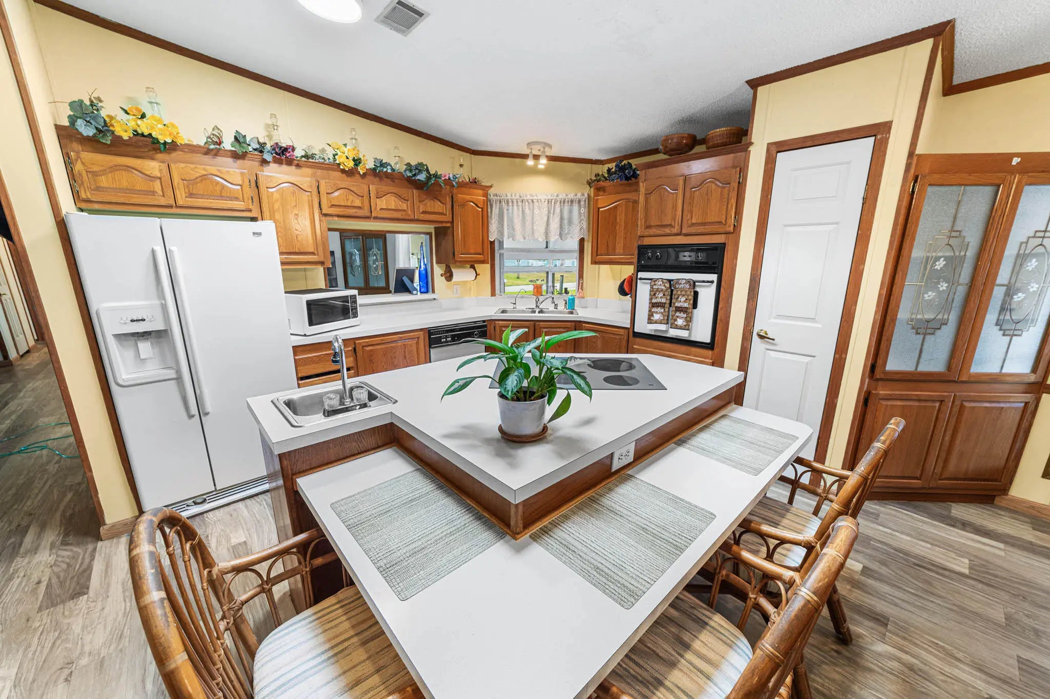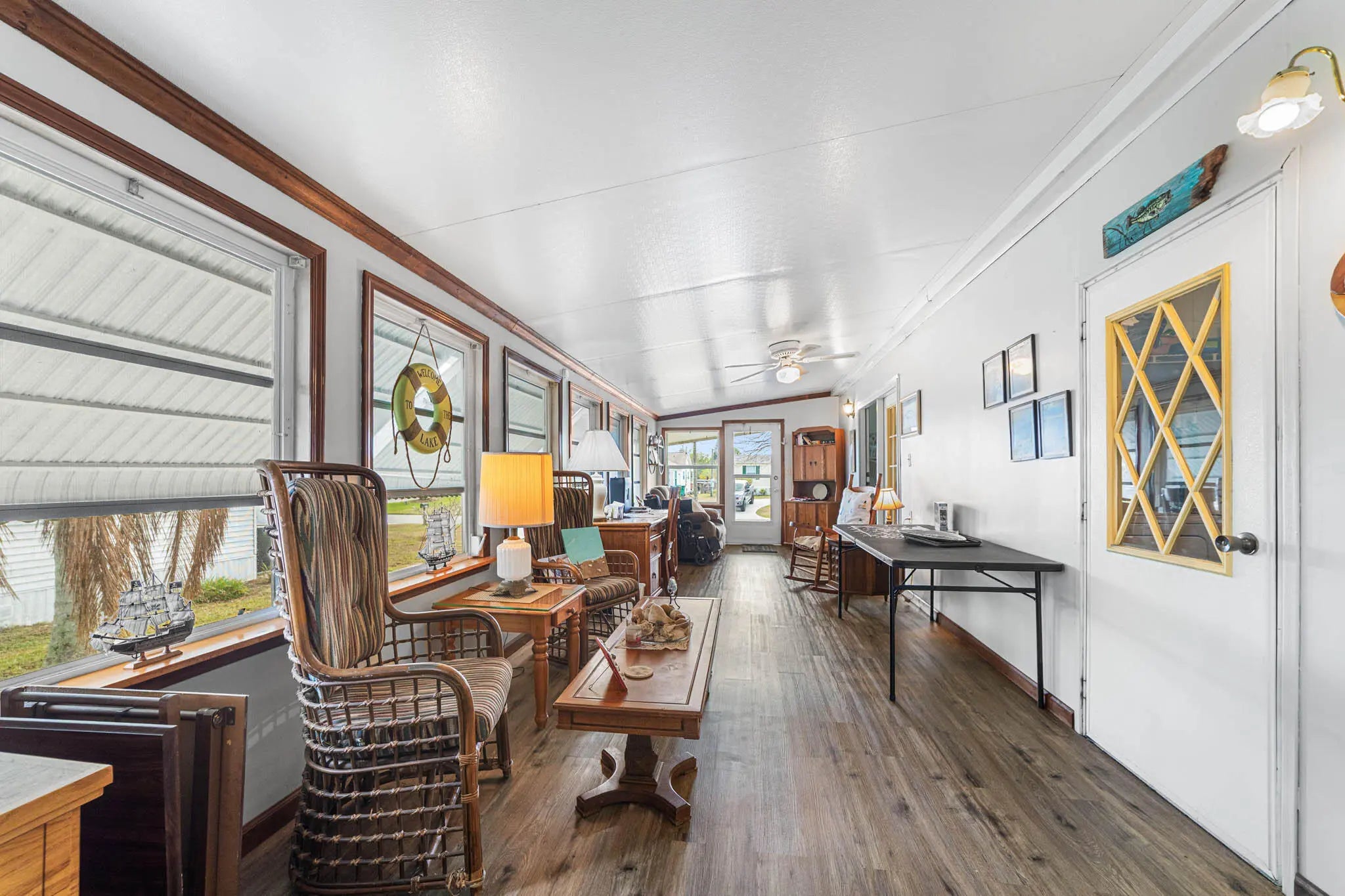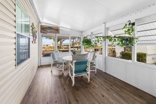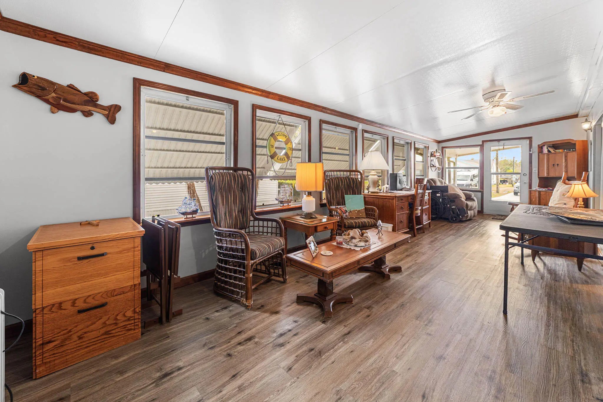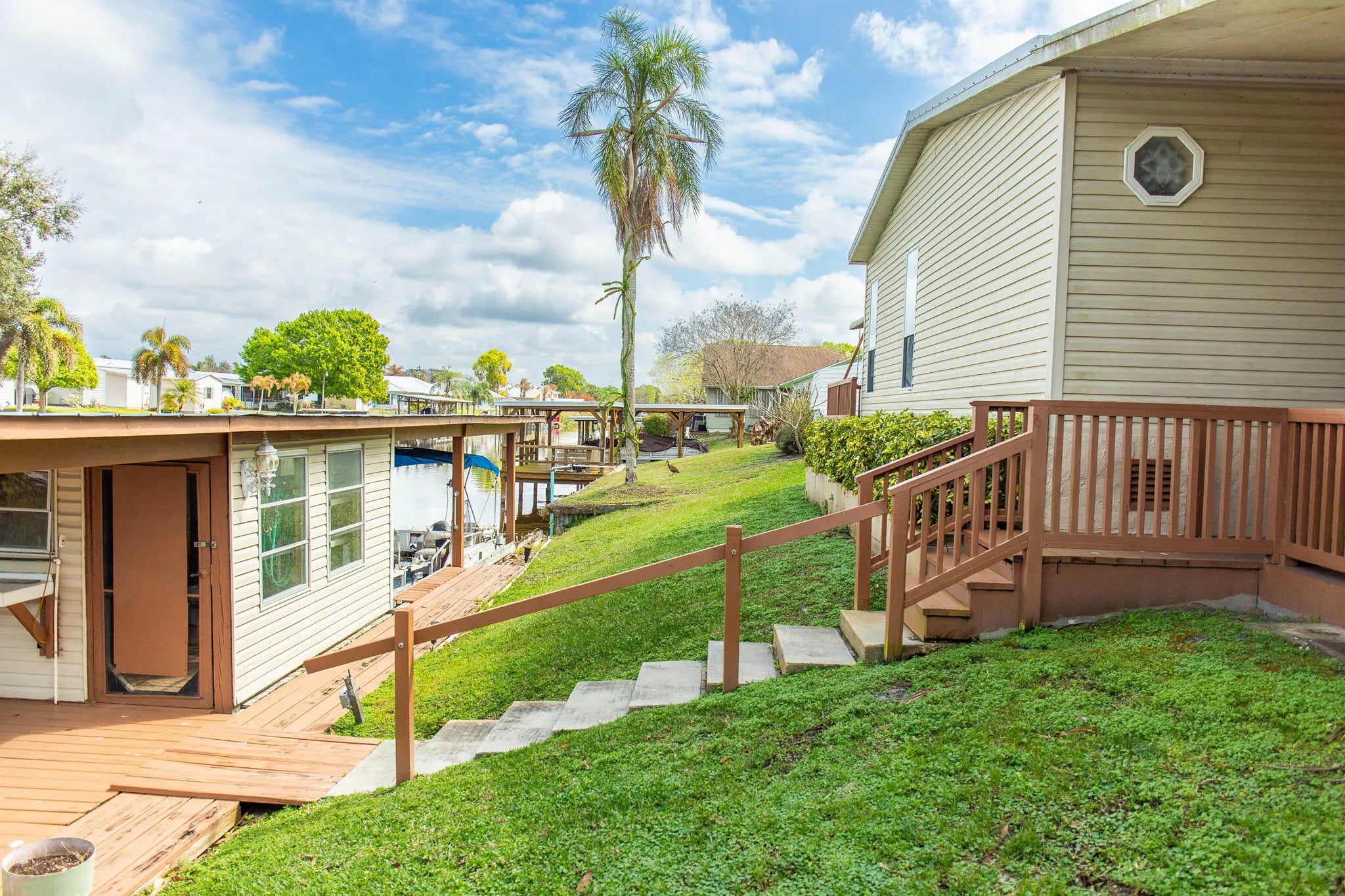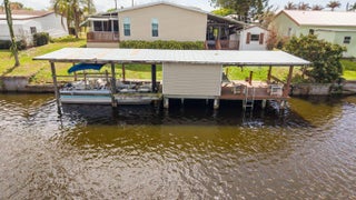 Taylor Creek Isles- Lake Okeechobee Access 3 Bedroom / 2 Bath Manufactured Home with spacious Florida room, updated laminate flooring throughout, a large kitchen island and master suite with en-suite. Enjoy outdoor living with two screened rooms, two carports, an insulated workshop, a boat house, a dock with a hoist-perfect for boating and fishing lovers.