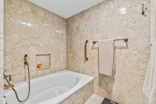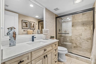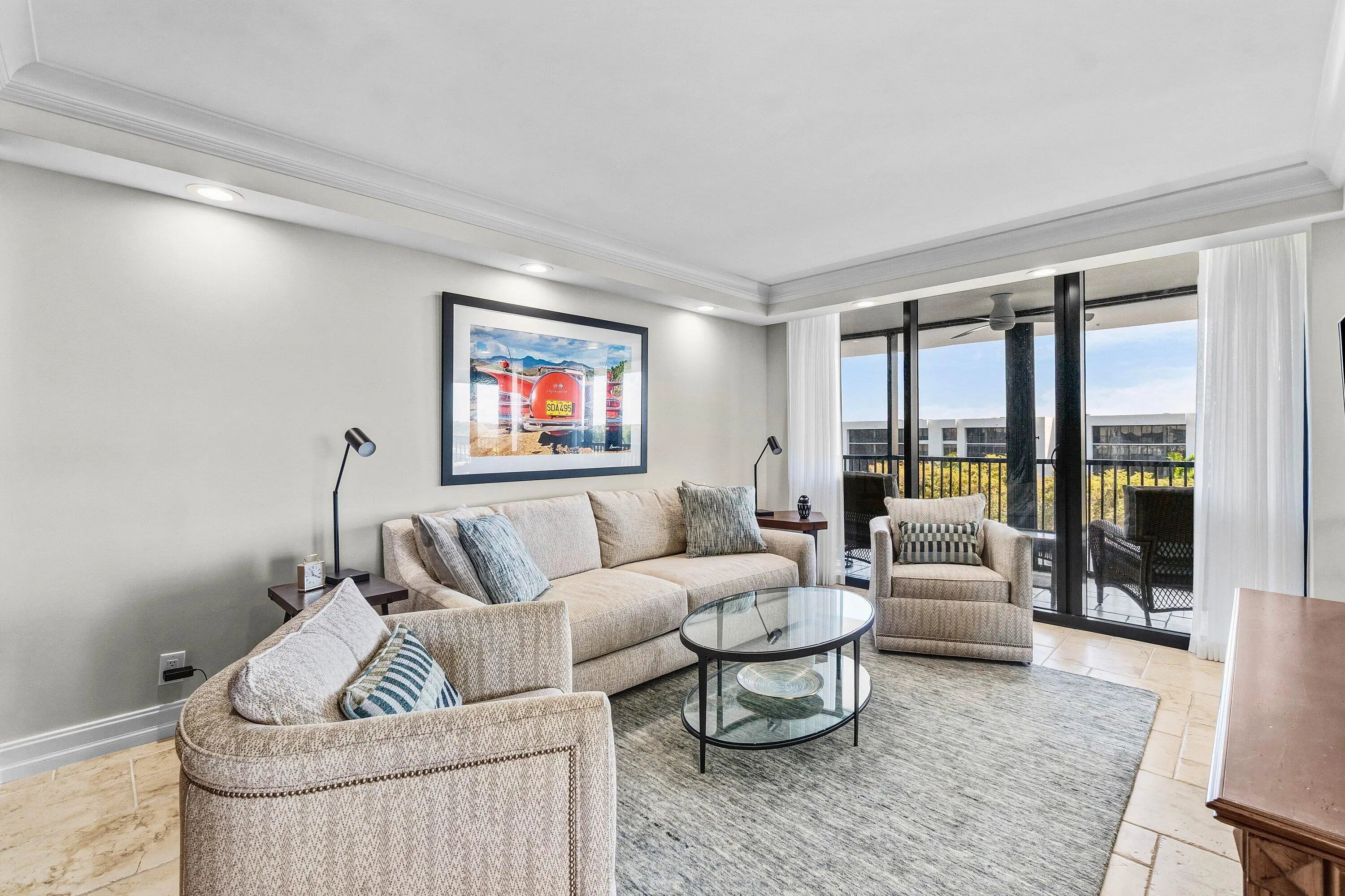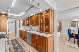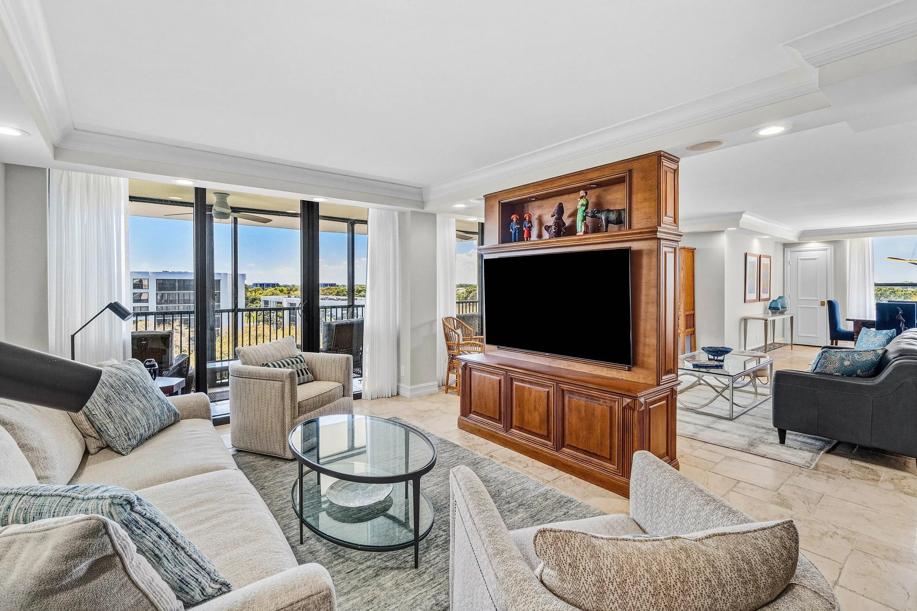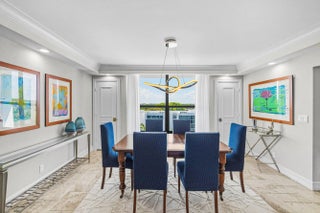 This beautifully renovated 3-bedroom, 2.5 bath top-floor condo has been updated with the finest materials and thoughtful design throughout. The home is light and bright, featuring tile flooring in the living areas and custom wood built-ins. The kitchen offers quartz countertops, a stone backsplash, and stainless steel appliances. The third bedroom has been opened to the living area to create additional space, though the wall can easily be replaced if a separate bedroom is desired. Additional highlights include extra closets in the primary bedroom and dining area, plus a large custom pantry. All sliding glass doors and windows are impact-resistant, and the patio also has additional hurricane shutters, allowing outdoor furniture to remain in place during storms.