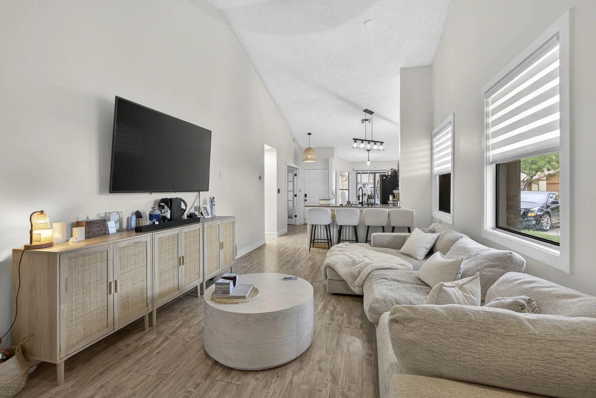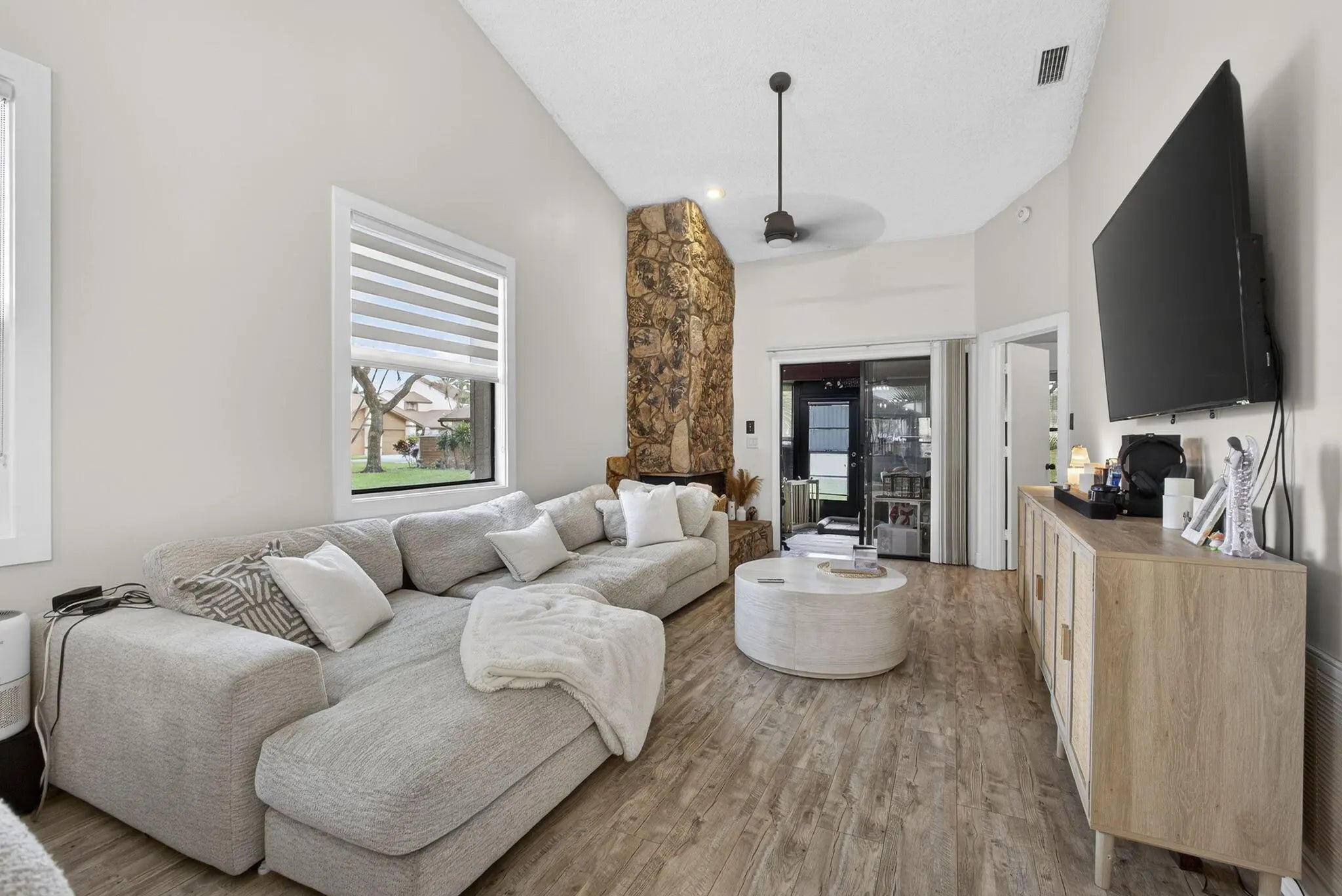 Light and Bright with Vaulted Ceilings, Spacious Kitchen with Stainless Steel Appliances, Breakfast Bar, Open Floorplan, Great Room, Stone Fireplace, Den, Primary Suite Features Walk In Closet, with Updated Spa Bathroom, Large Shower, Designer Second Bathroom with Shower, Open Patio, Washer and Dryer, One Car Garage, End Unit, Move In Ready, Must See, The Community is going thru a wood restoration project and the unit ( exterior garage and fence will be freshly painted, Great Location Close to Downtown West Palm Beach, Schools, Restaurants, Shopping, and International Airport