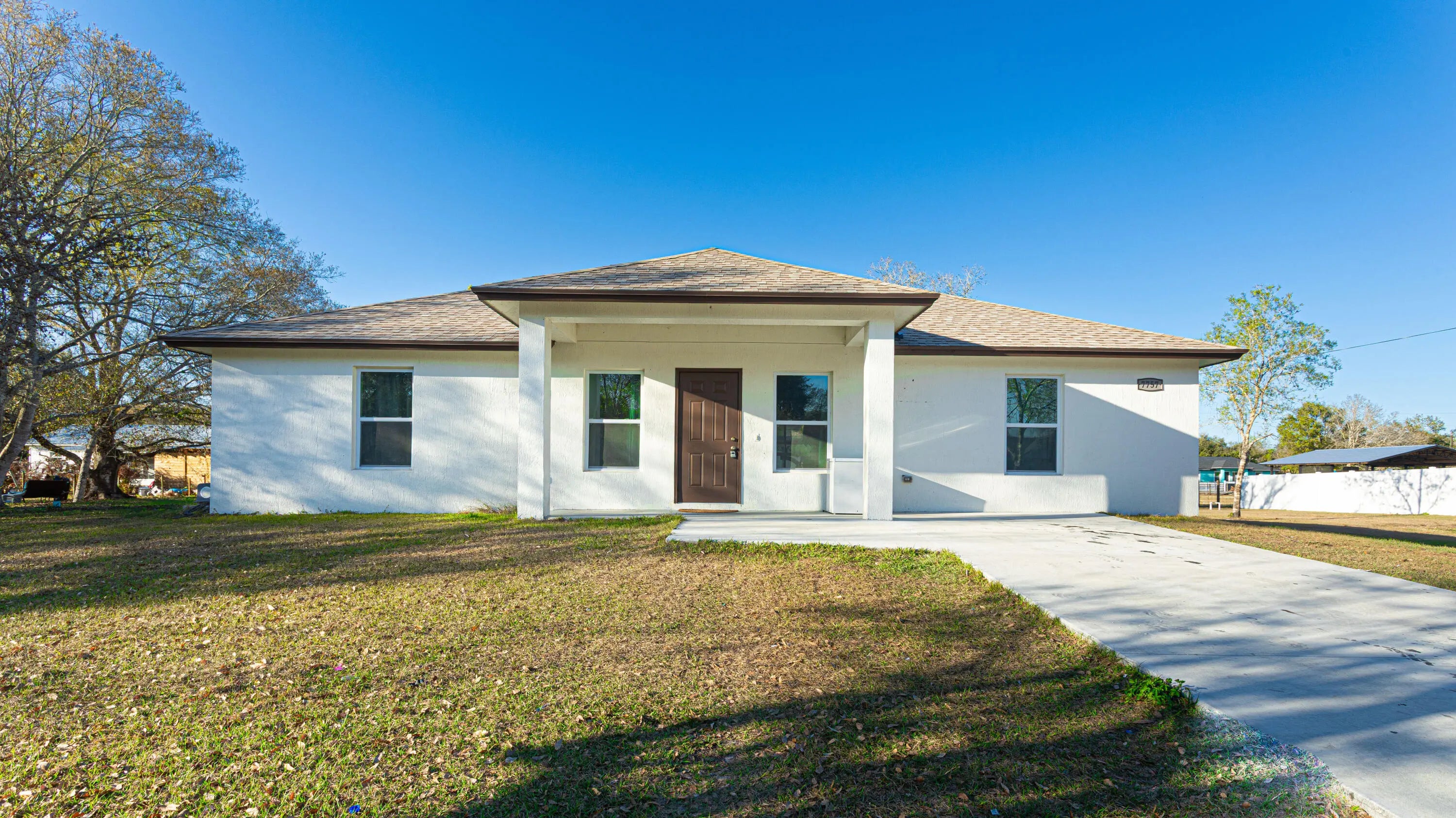 This beautifully maintained 3-bedroom, 2-bathroom new-construction home, completed in 2023 and situated on an oversized 0.36-acre lot at 7757 NW 82nd Court in Okeechobee, FL, offers 1,400 square feet of modern living in a peaceful community setting. Featuring an open split floor plan with stunning tile flooring throughout, high tray and vaulted ceilings, impact-resistant windows, and upgraded built-in closet systems in every bedroom, the residence showcases a gourmet kitchen with stone countertops and stainless-steel appliances, along with elegant stone-topped bathrooms complete with tiled showers. The master suite includes a tray ceiling and private ensuite, while a dedicated laundry room, covered front and rear porches, paved driveway, central air, block-and-stucco construction, and well/septic utilities complete this move-in-ready gem—ideal for families seeking upgraded finishes, ample yard space, and effortless one-level living in excellent condition.