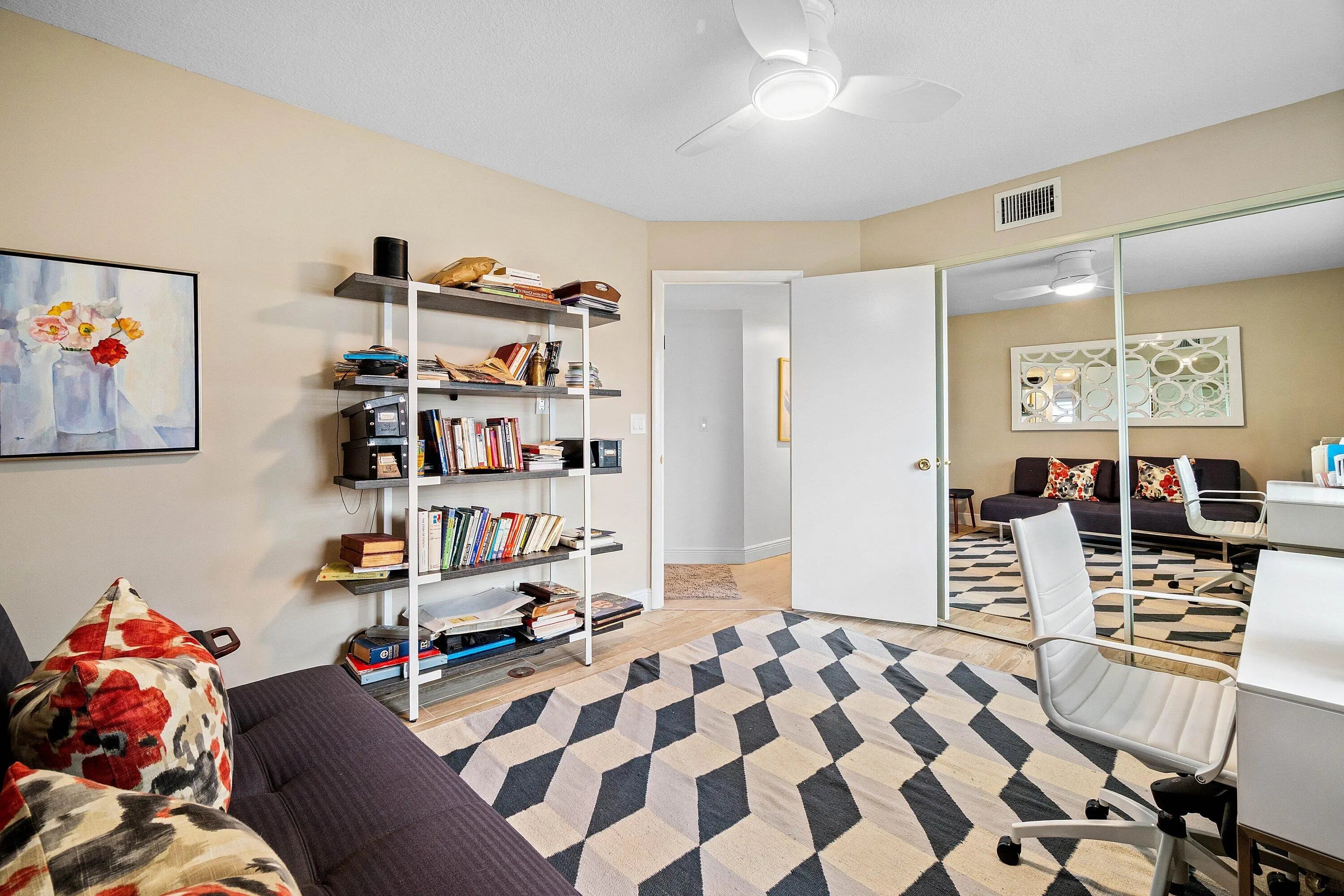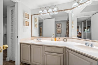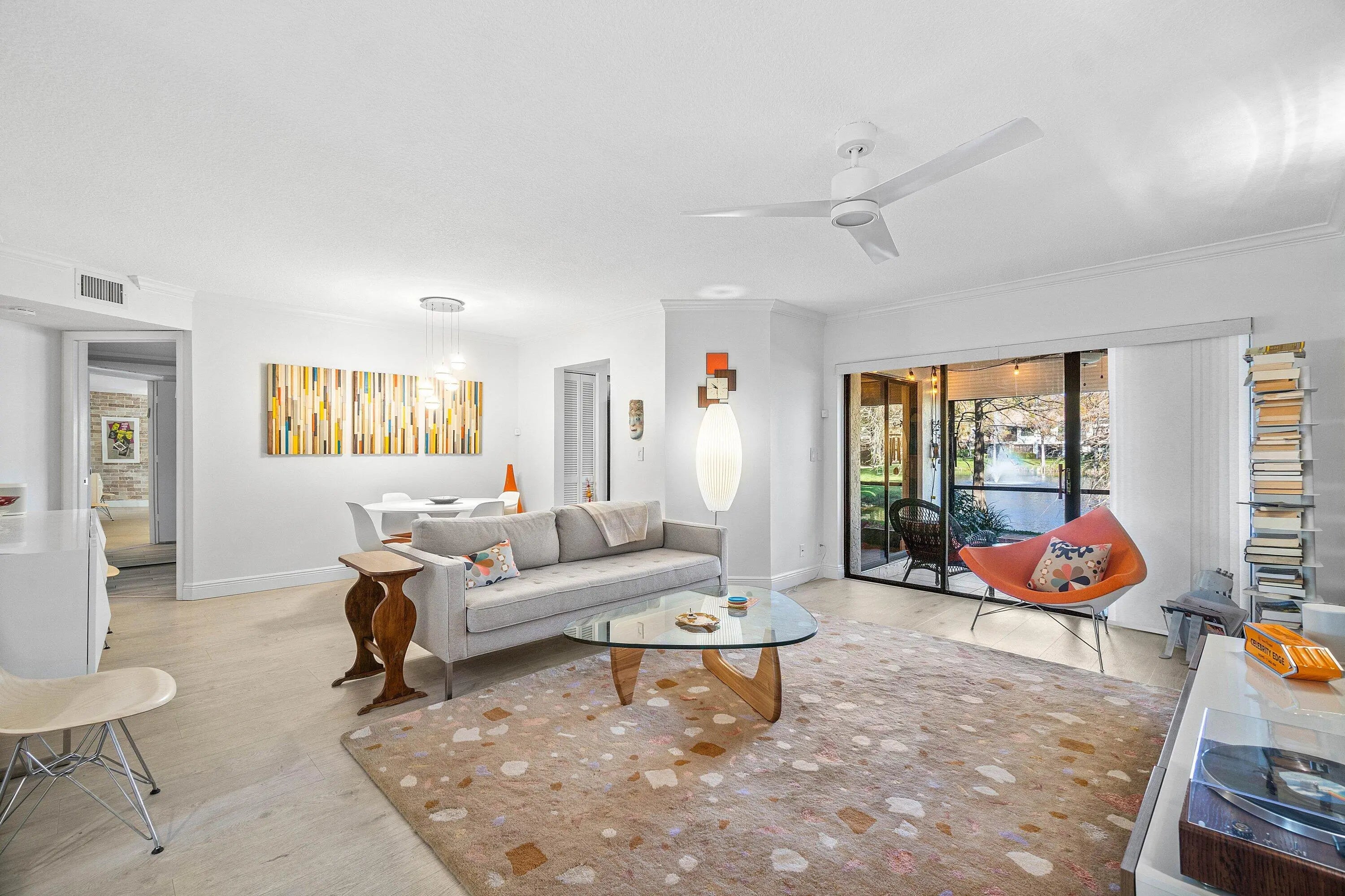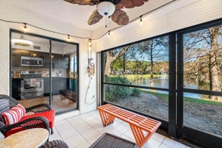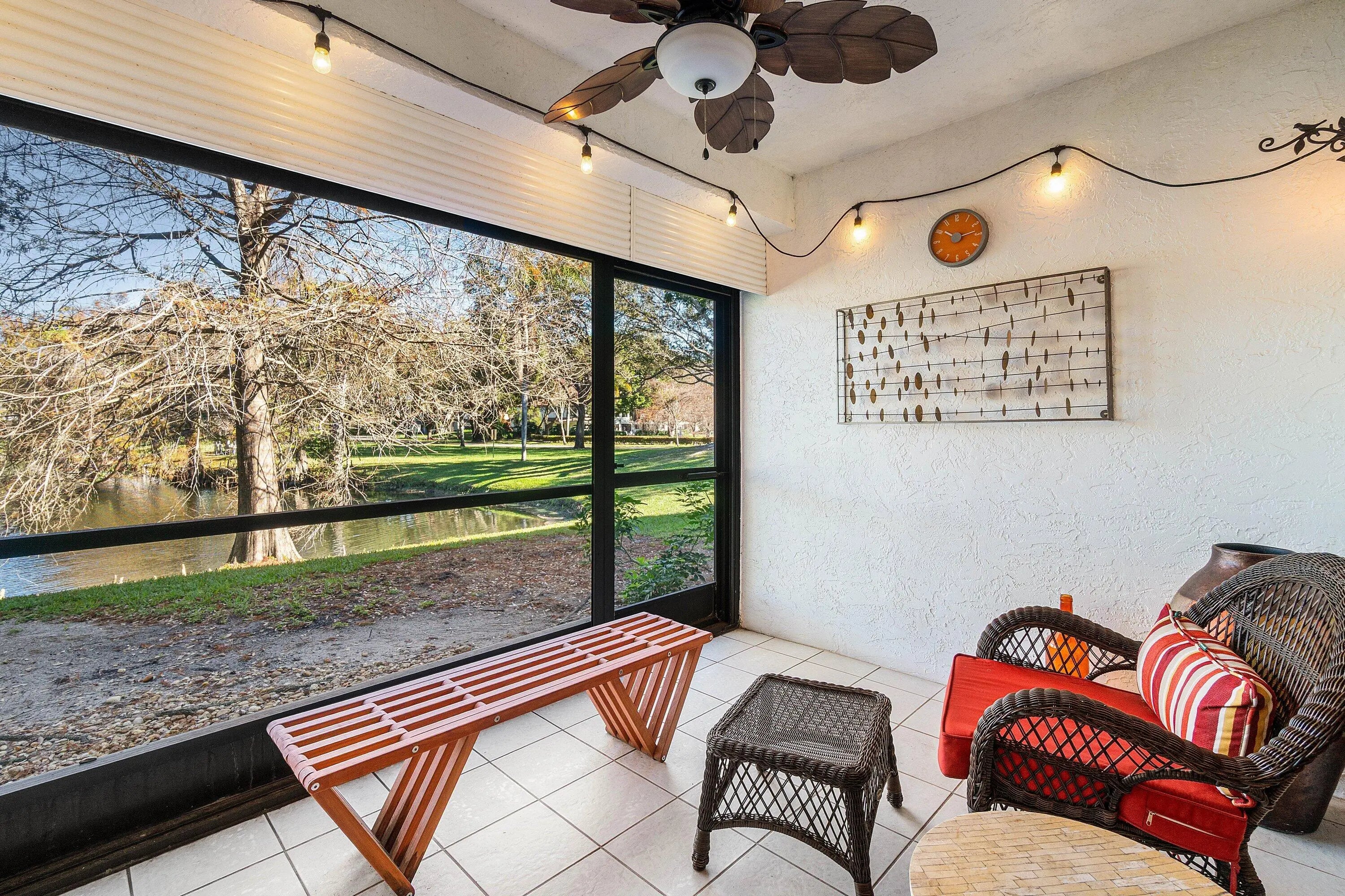 This stunning 2/2 condo w/ 1 car garage is very bright, pristine and has tons of character like a condo in SOHO w/ a peaceful lake view. Custom design features such as exposed travertine brick, upscale window treatments & custom lighting! Coastal style luxury wood look flooring throughout & can be sold beautifully furnished. The kitchen has mahogany cabinets, granite countertops & S/S appliances. The Primary Bedroom is extremely spacious, features a sitting area or room for a desk/office area w/ views out to the lake and a custom fitted closet! The Primary Bathroom has dual sinks & Roman soaking tub/shower. Relax on the screened lanai w/ an amazing long lake view & peaceful sounds of the fountain. The clubhouse has a fitness room, show hall, billiards, pickleball & tennis, dog run!