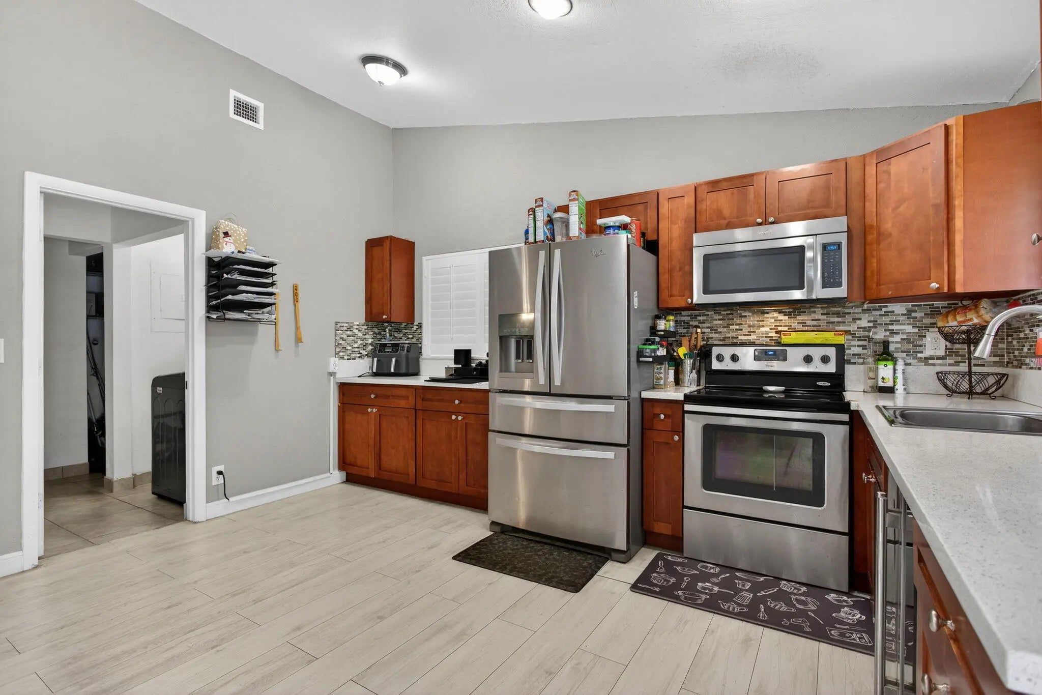 Spacious one story 4 bedroom, 2 bath pool home with a bright open layout and neutral finishes throughout. Features include plantation shutters, laminate flooring, and an eat in kitchen ideal for everyday living. Primary suite offers a walk in closet and great storage throughout. Complete impact glass. Step outside to a true backyard oasis with an inground pool, paver patio, outdoor kitchen, shed, and fully fenced yard. Updated electrical panel, A/C and water heater 2016. No HOA. Truly checks all the boxes.