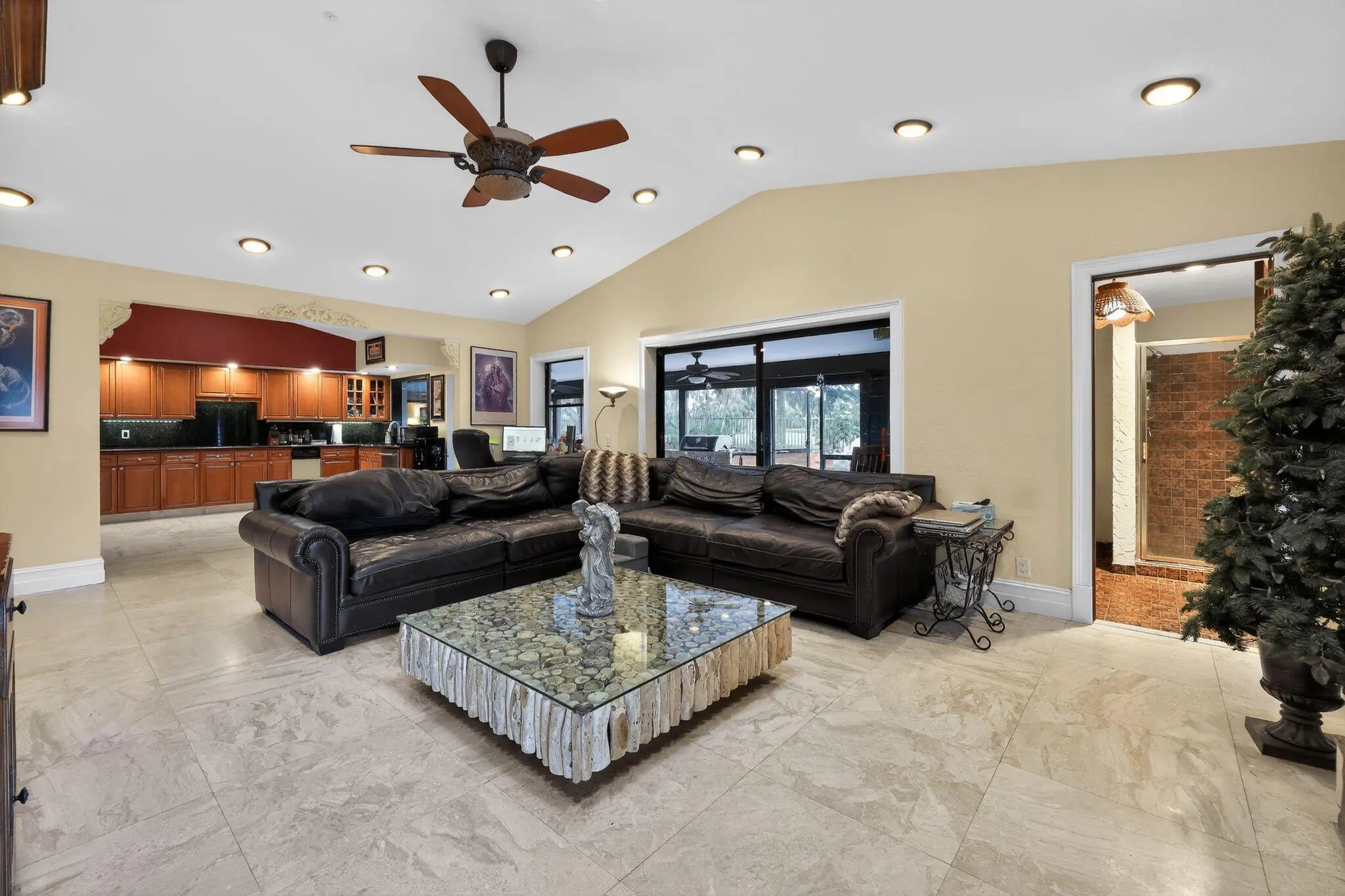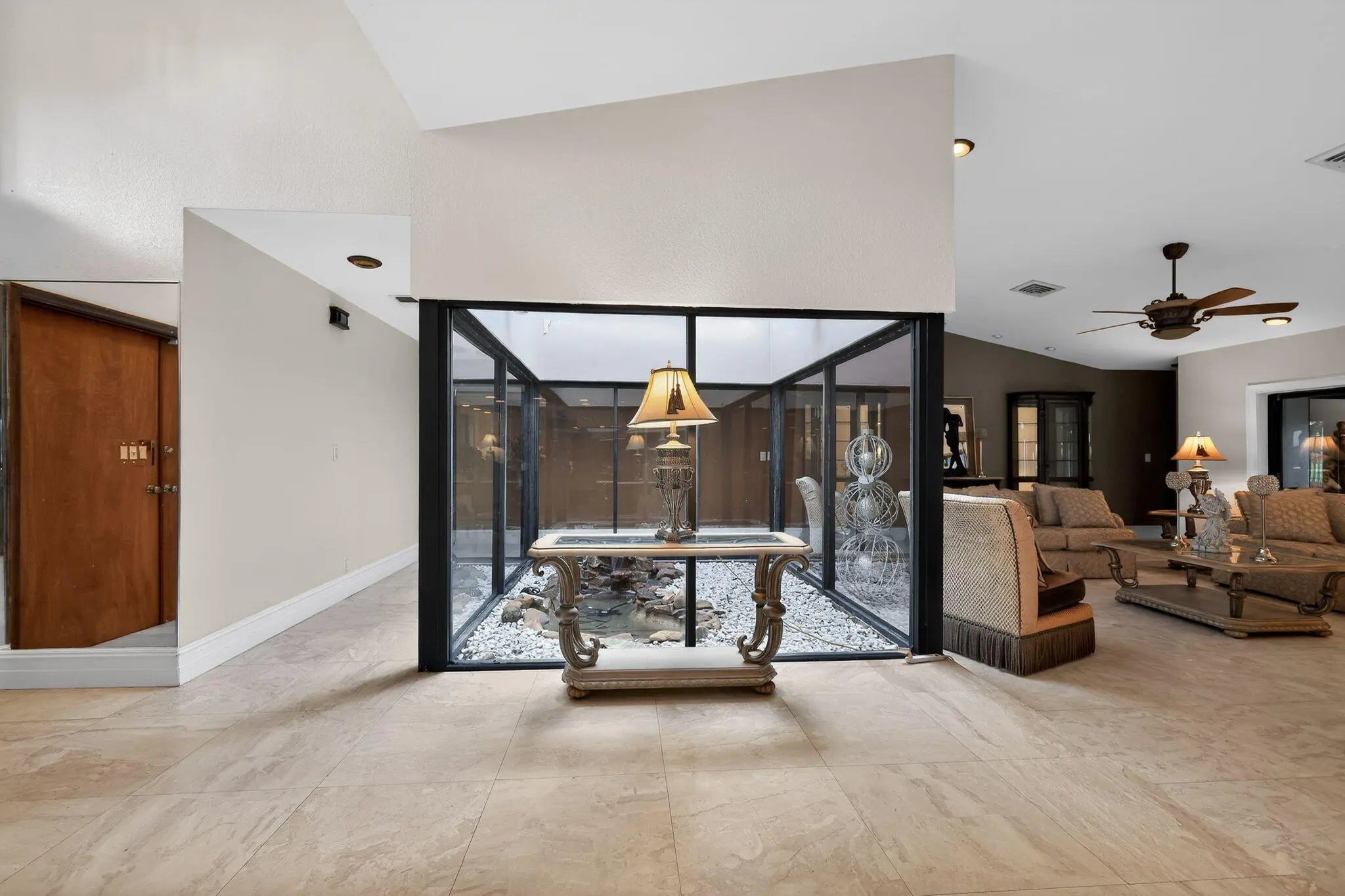 Tropical Golf Course Estate with Private Atrium & Sauna Rarely available 5BR/3BA ranch-style estate on the Golf Course in Jacaranda Country Club West. This masterpiece features a natural stone exterior, circular paver driveway, and 2-car garage. The interior is defined by a spectacular central Atrium with a Koi pond and waterfall. High-end finishes throughout include vaulted ceilings, custom lighting, and a unique wood-burning stone fireplace. Massive kitchen with skylight, natural wood cabinets, stainless appliances, and wine cooler. The oversized Master Suite offers marble floors, his/her sinks, a soaking jacuzzi tub, and a separate stand-up shower. Notable amenities include a private sauna, separate laundry room, and sliding glass doors leading to an expansive patio, oversized pool with fountain, and direct golf course views. 3,496 SqFt of luxury living in the heart of Plantation.