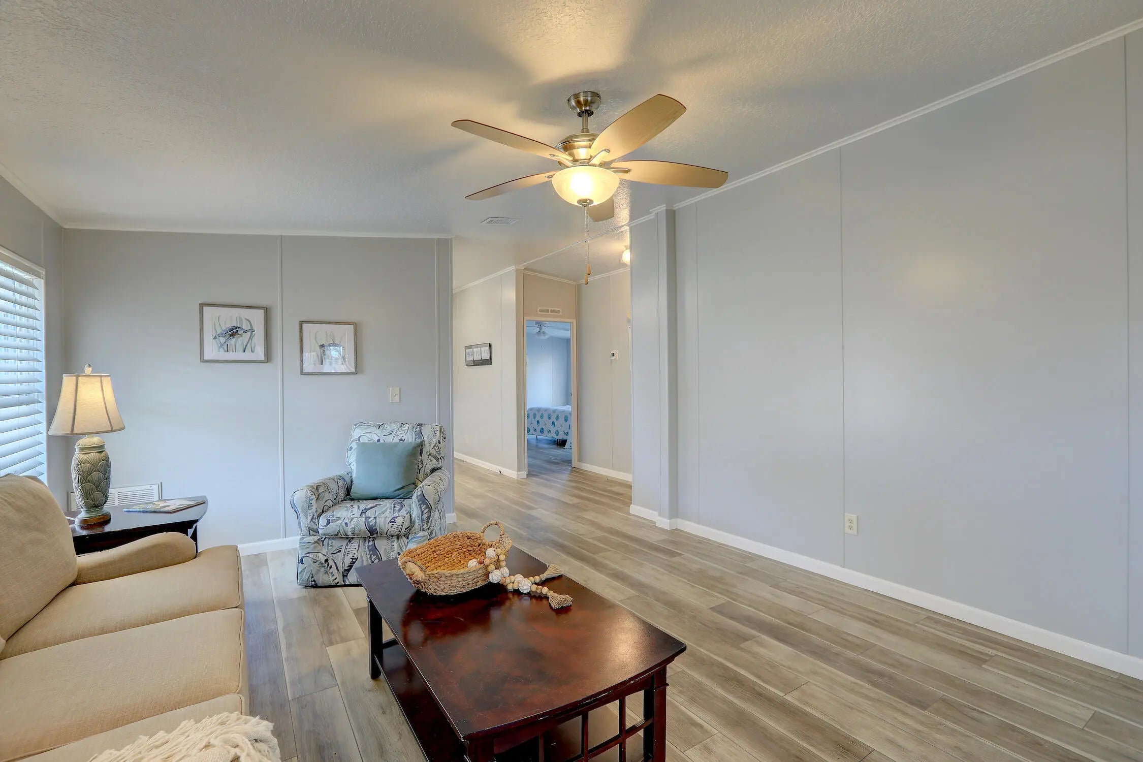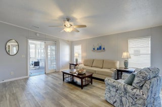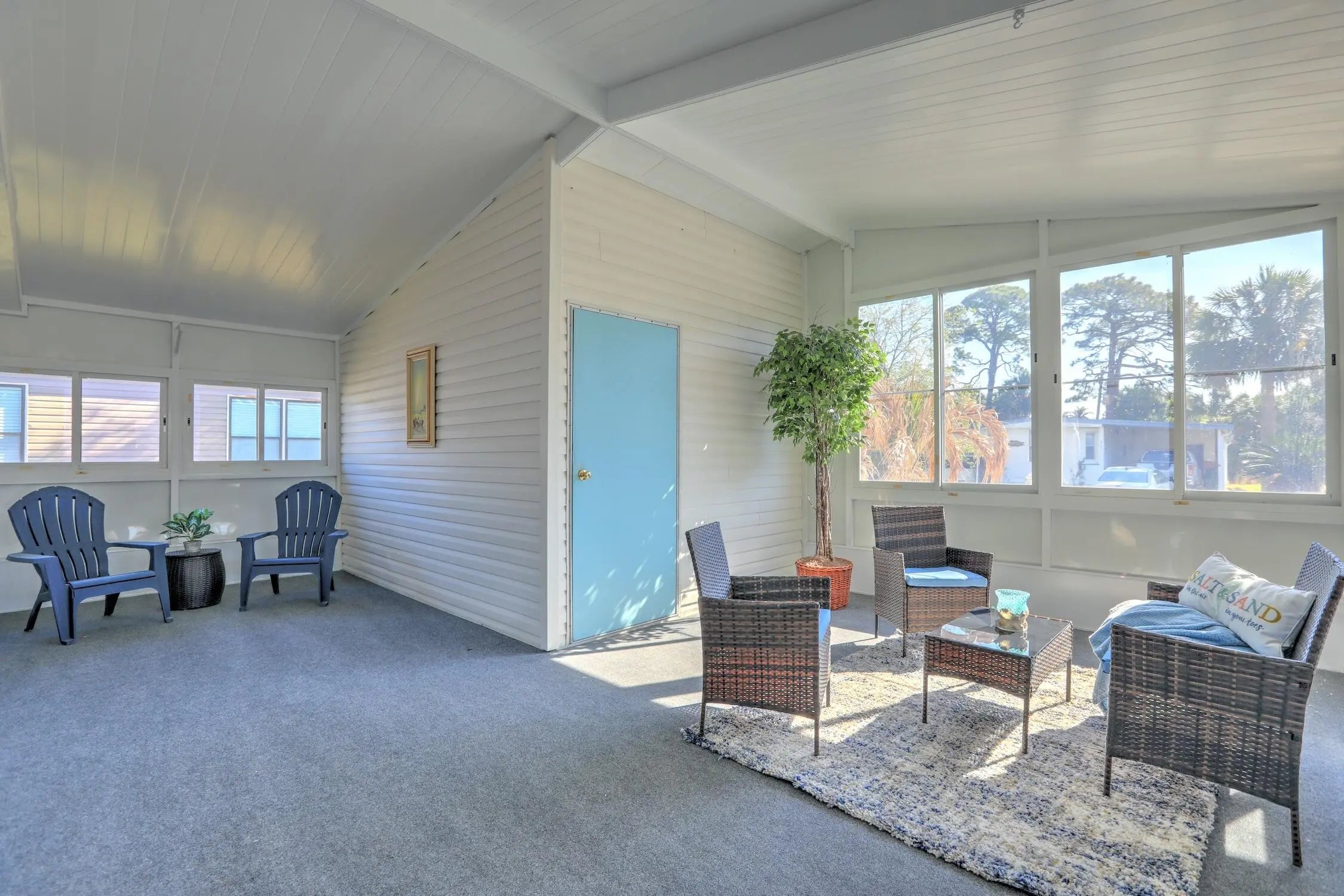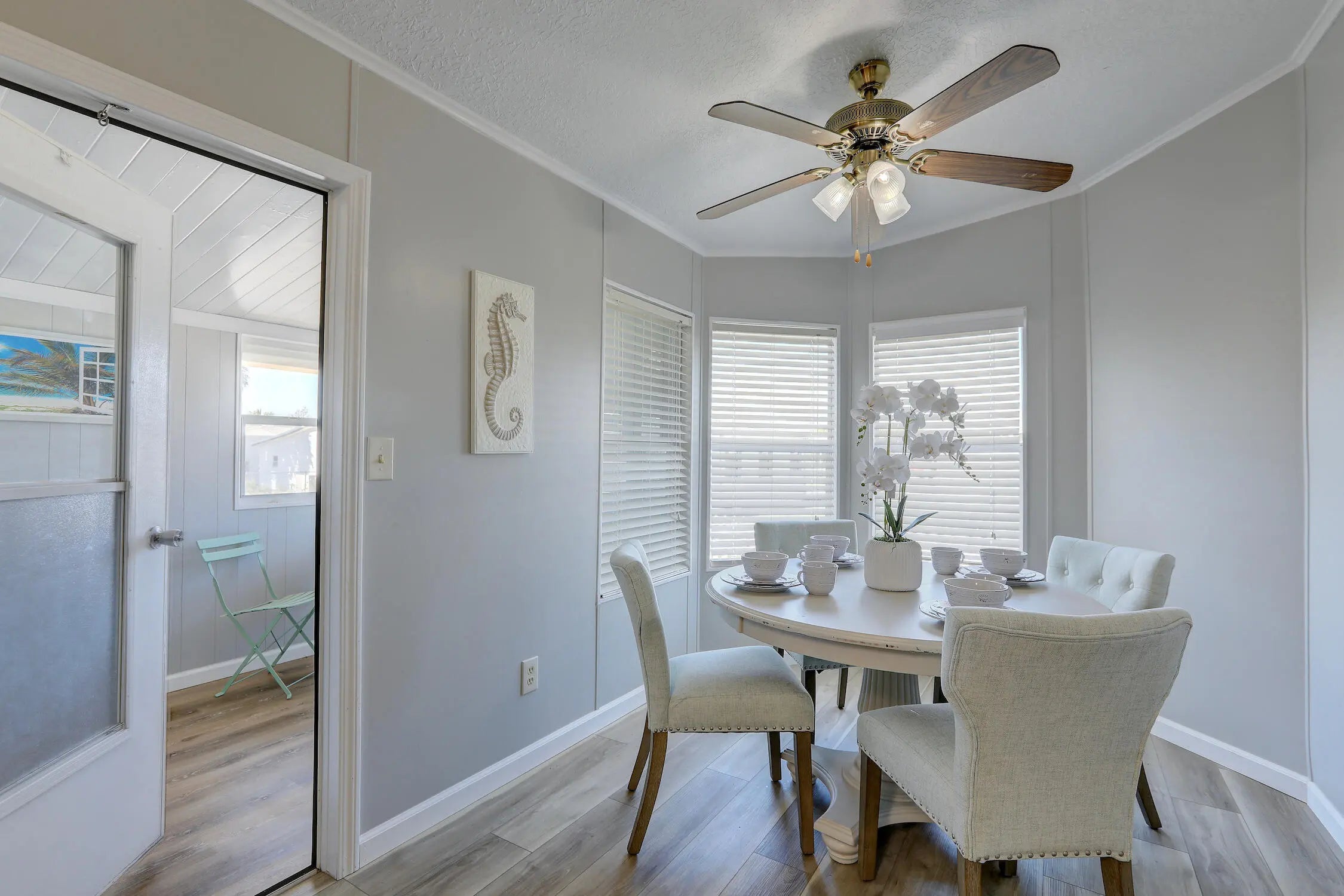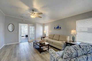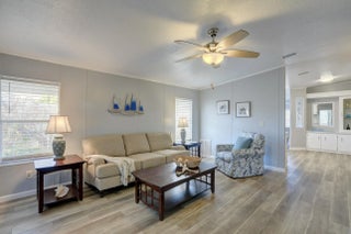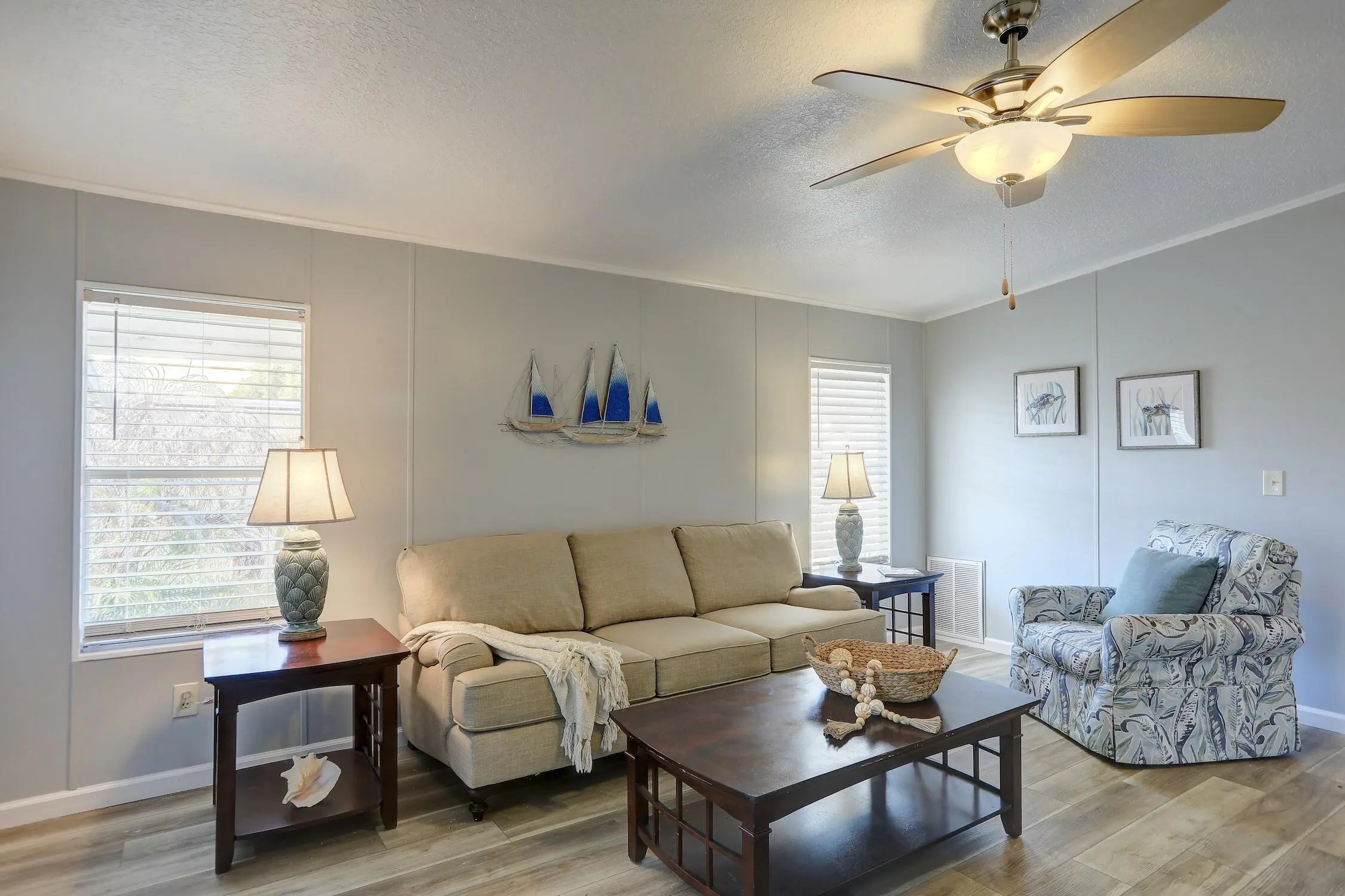 Coastal vibe meets easy living-golf cart included! This beautifully FULLY FURNISHED updated split-bedroom home featuring luxury vinyl plank flooring, stylish bath, and a sleek updated kitchen with stainless steel appliances. Cathedral ceilings, enhance the bright open layout while front doors lead to an east-facing enclosed porch perfect for an office or hobby space.n Enjoy a private fenced backyard. Experience resort-style amenities and year-round activities 3 pools, clubhouse, tennis/pickle ball, beach access —live like you're on vacation in this coastal community! ROOF 2023 REPIPE 2023