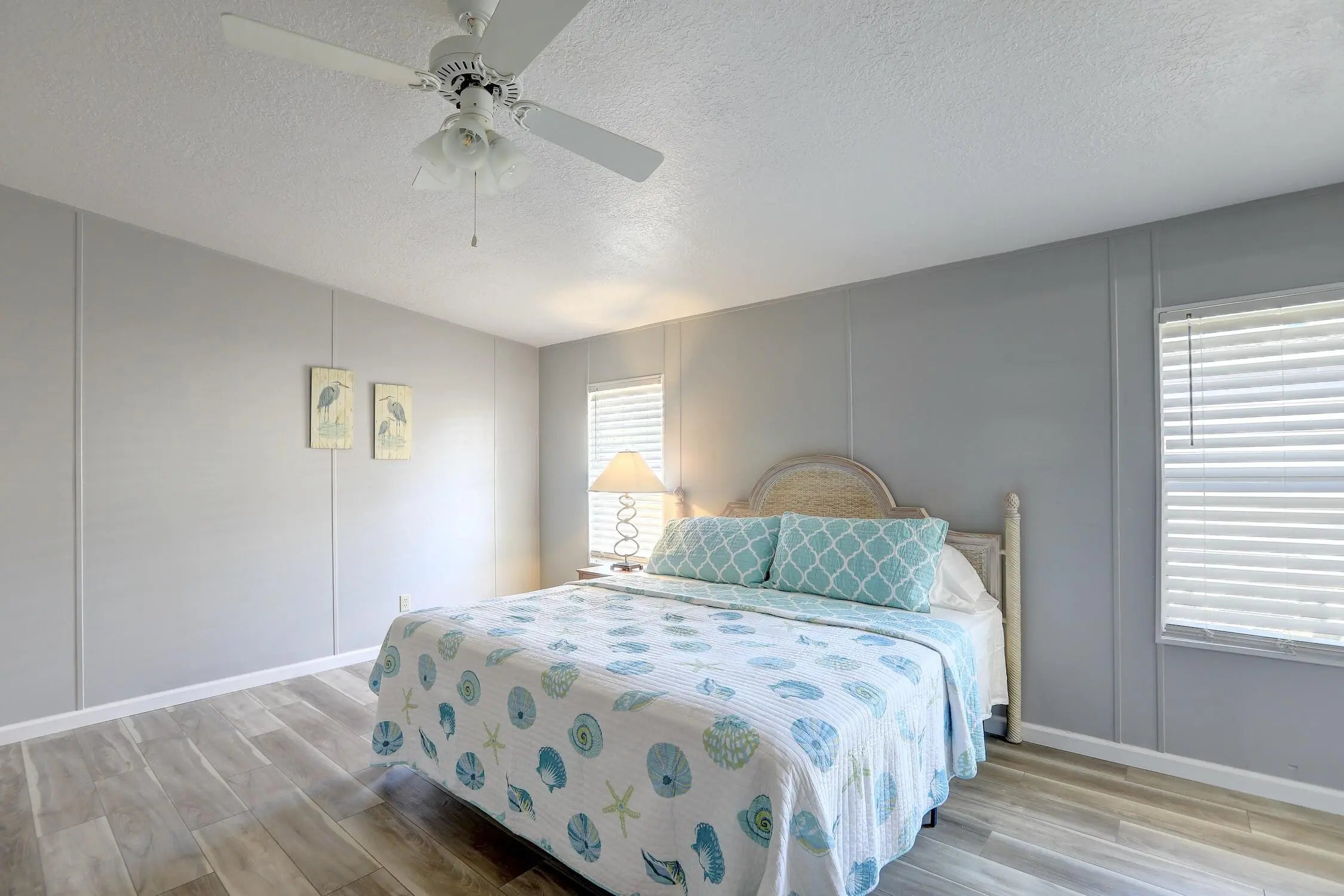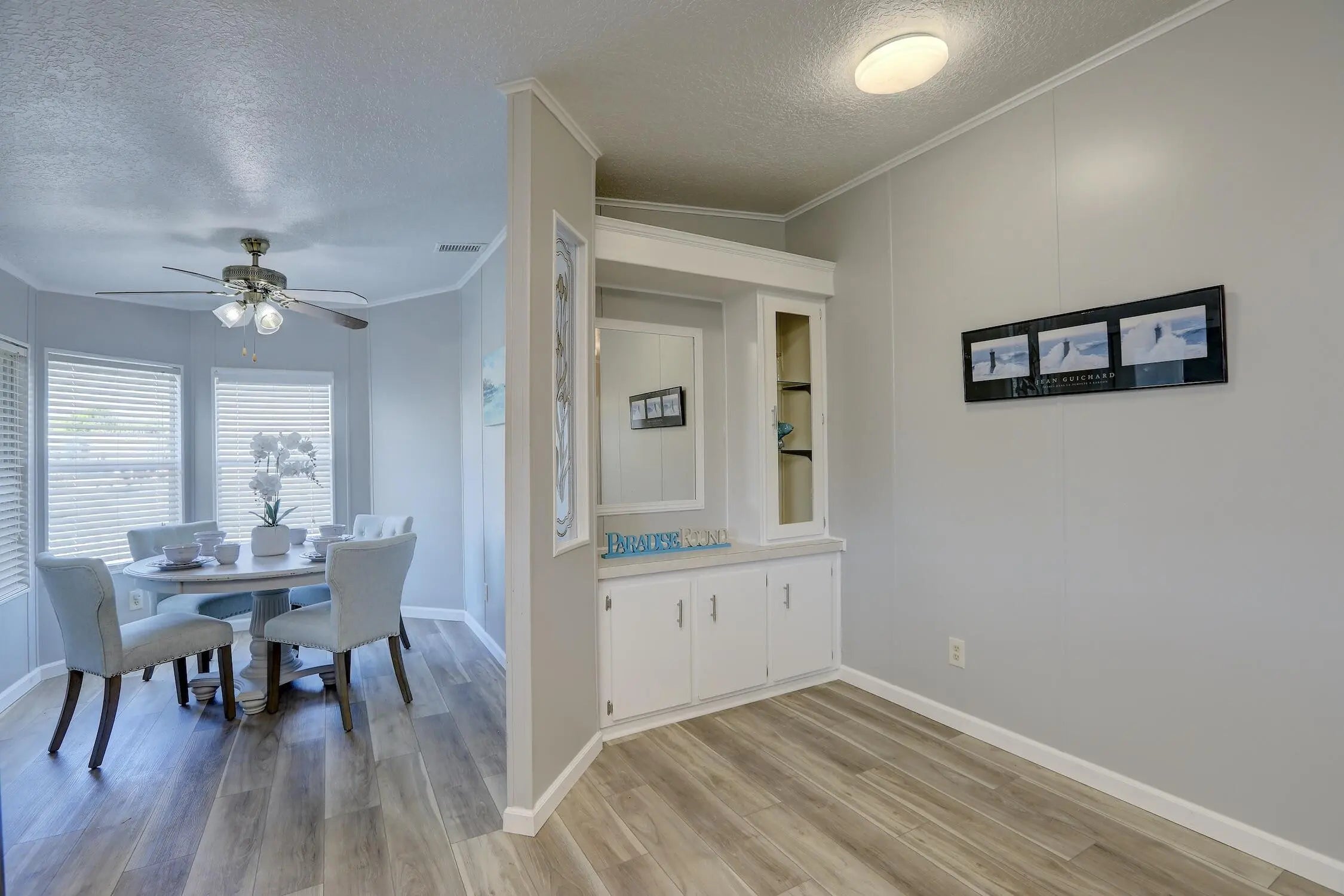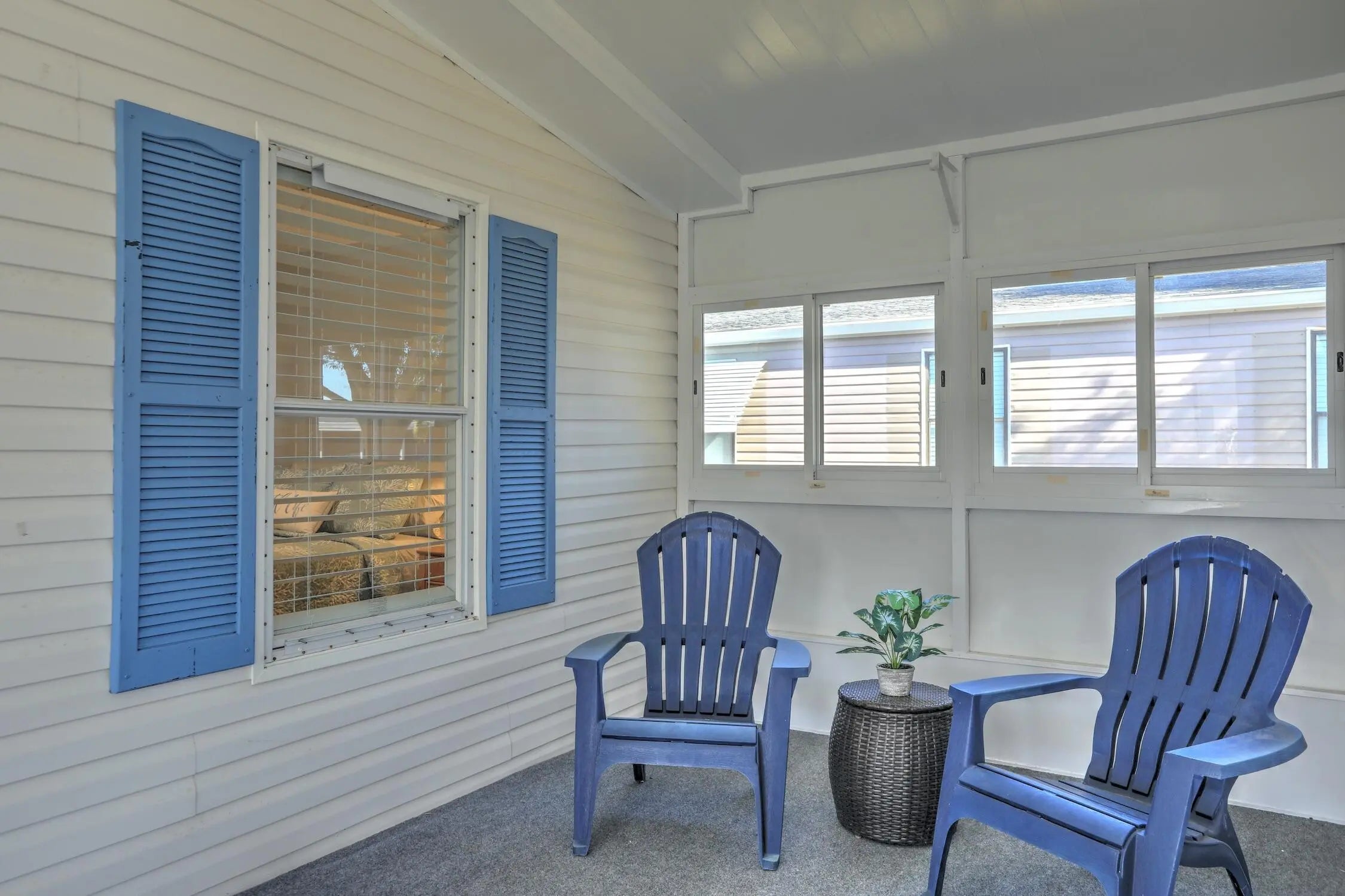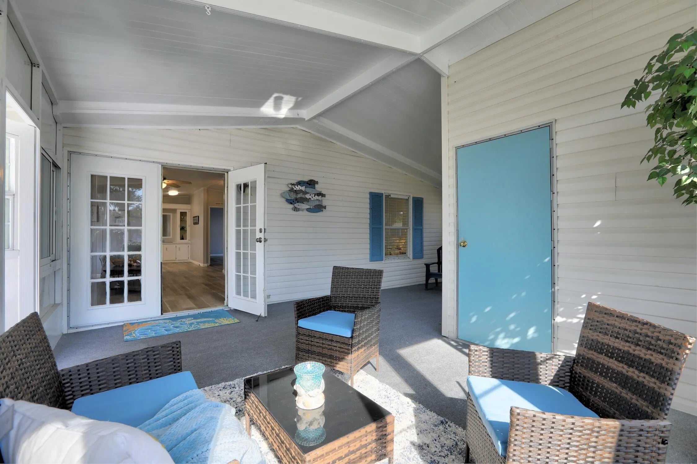 Coastal vibe meets easy living-golf cart included! This beautifully FULLY FURNISHED updated split-bedroom home featuring luxury vinyl plank flooring, stylish bath, and a sleek updated kitchen with stainless steel appliances. Cathedral ceilings, enhance the bright open layout while front doors lead to an east-facing enclosed porch perfect for an office or hobby space.n Enjoy a private fenced backyard. Experience resort-style amenities and year-round activities 3 pools, clubhouse, tennis/pickle ball, beach access —live like you're on vacation in this coastal community! ROOF 2023 REPIPE 2023