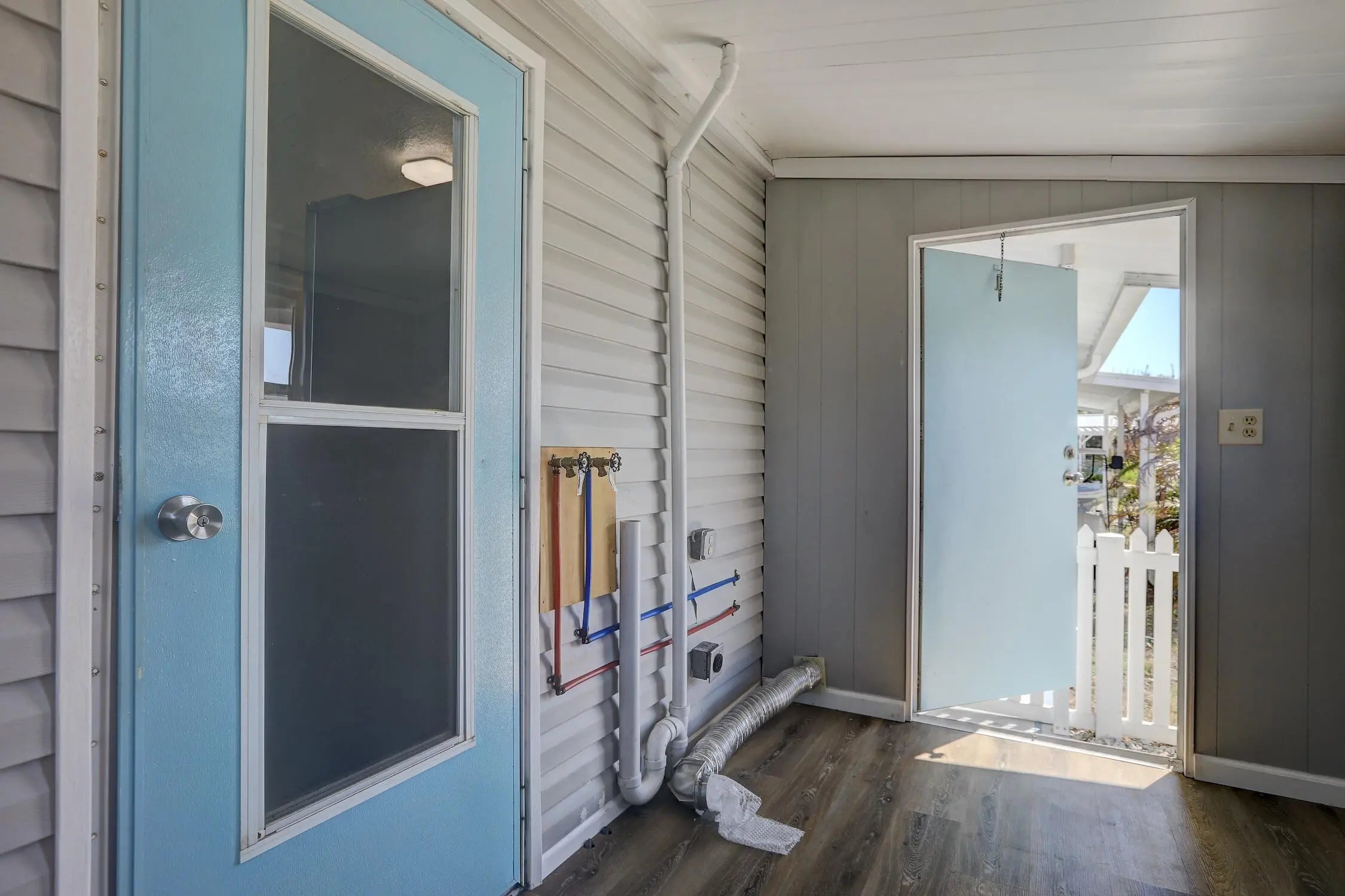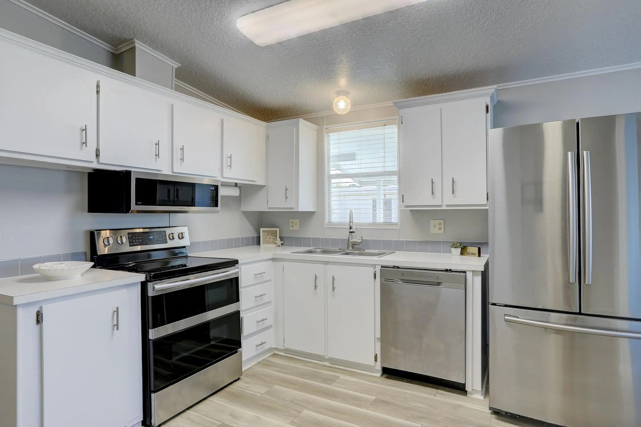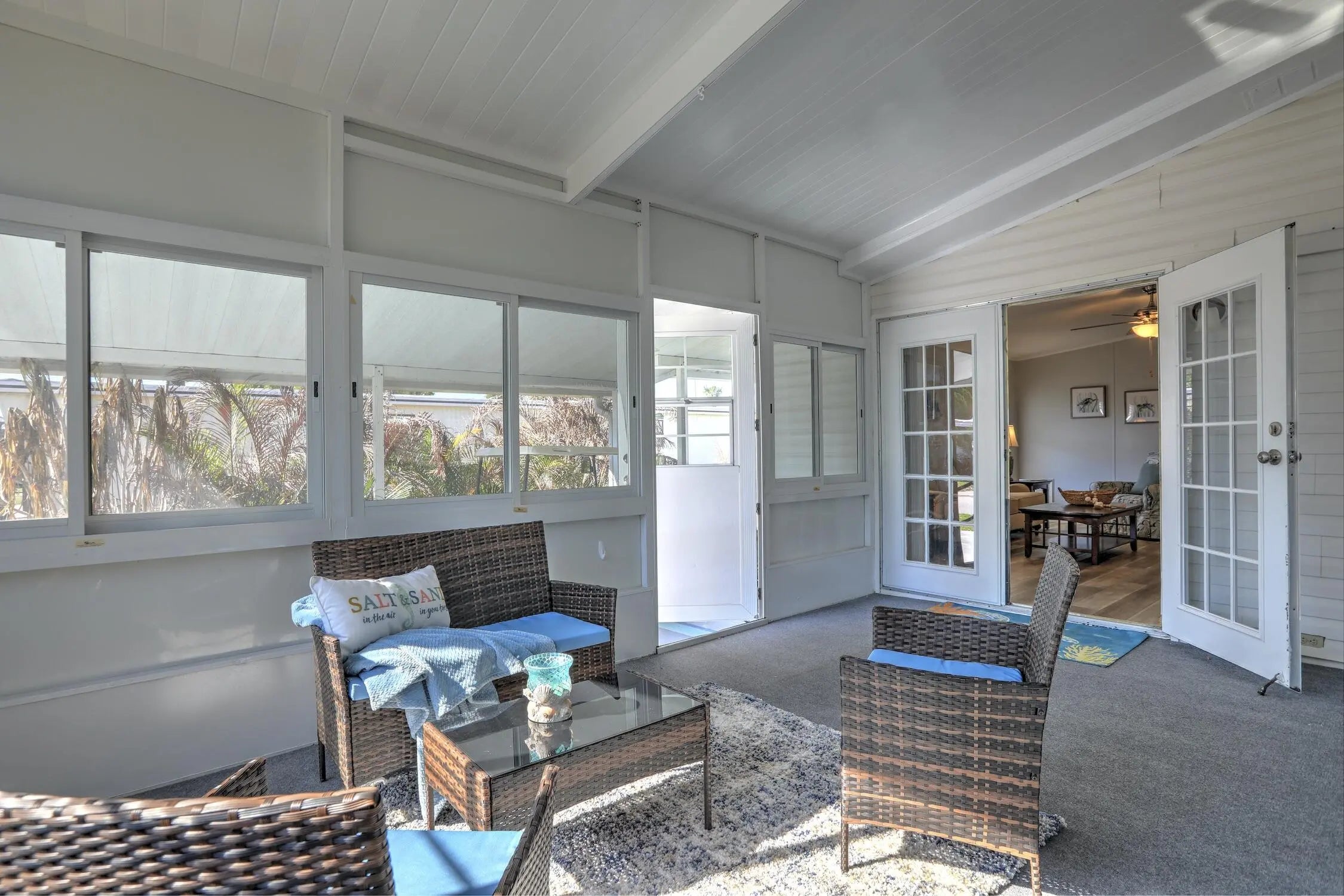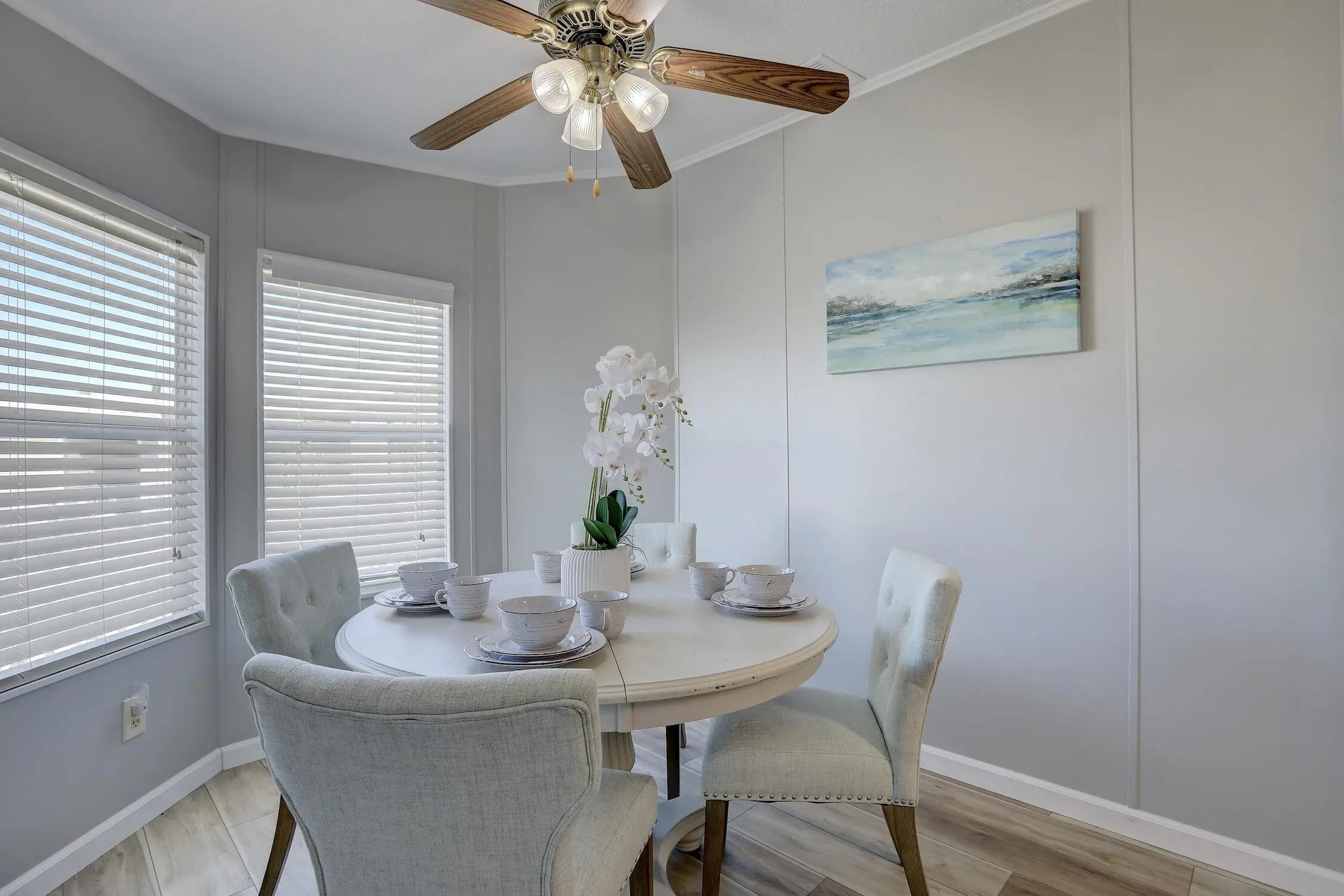 Coastal vibe meets easy living-golf cart included! This beautifully FULLY FURNISHED updated split-bedroom home featuring luxury vinyl plank flooring, stylish bath, and a sleek updated kitchen with stainless steel appliances. Cathedral ceilings, enhance the bright open layout while front doors lead to an east-facing enclosed porch perfect for an office or hobby space.n Enjoy a private fenced backyard. Experience resort-style amenities and year-round activities 3 pools, clubhouse, tennis/pickle ball, beach access —live like you're on vacation in this coastal community! ROOF 2023 REPIPE 2023