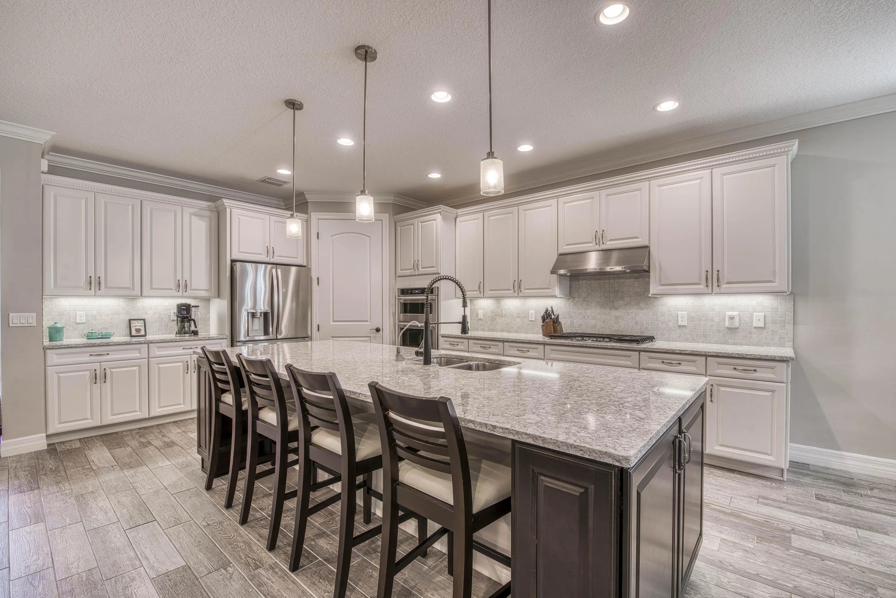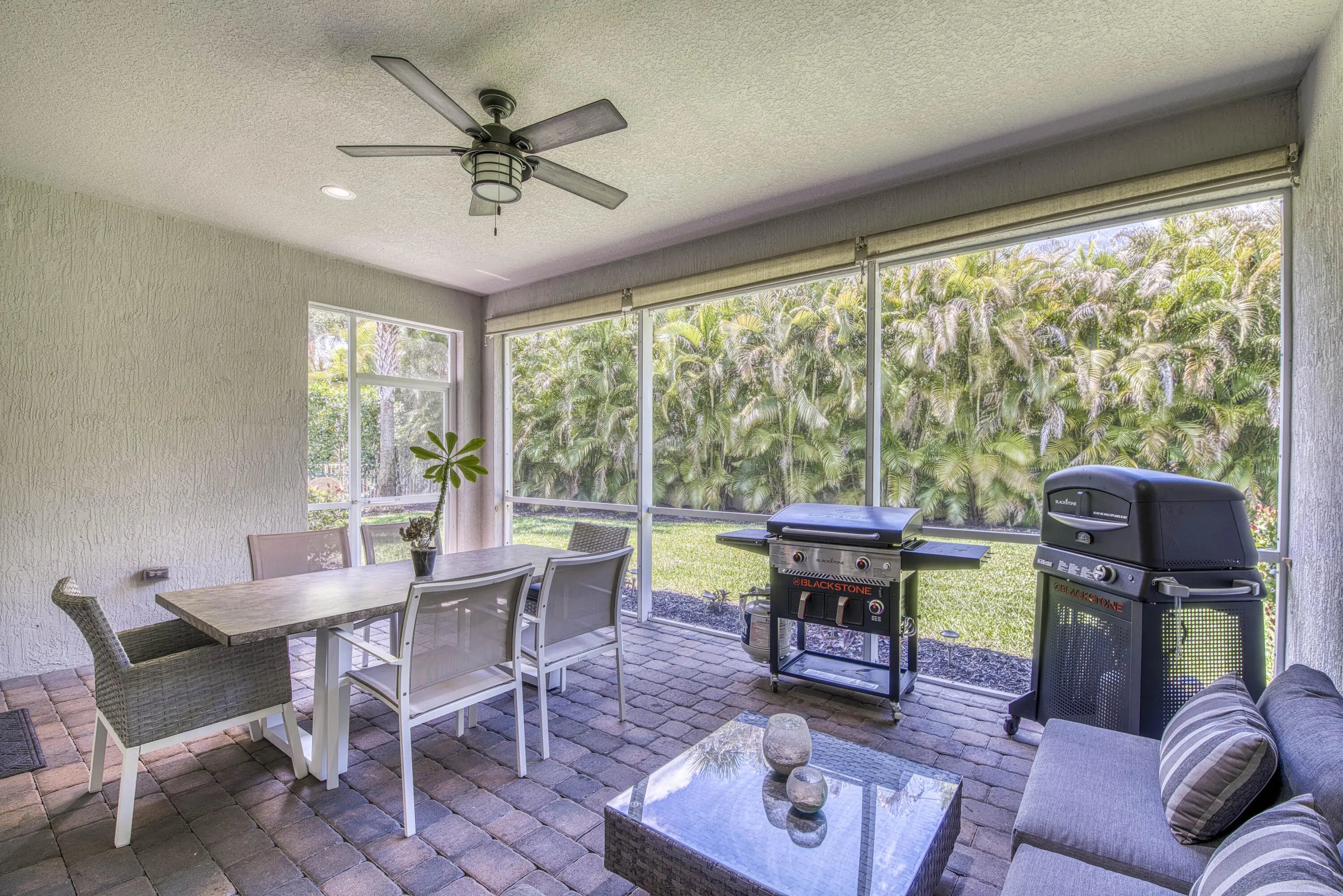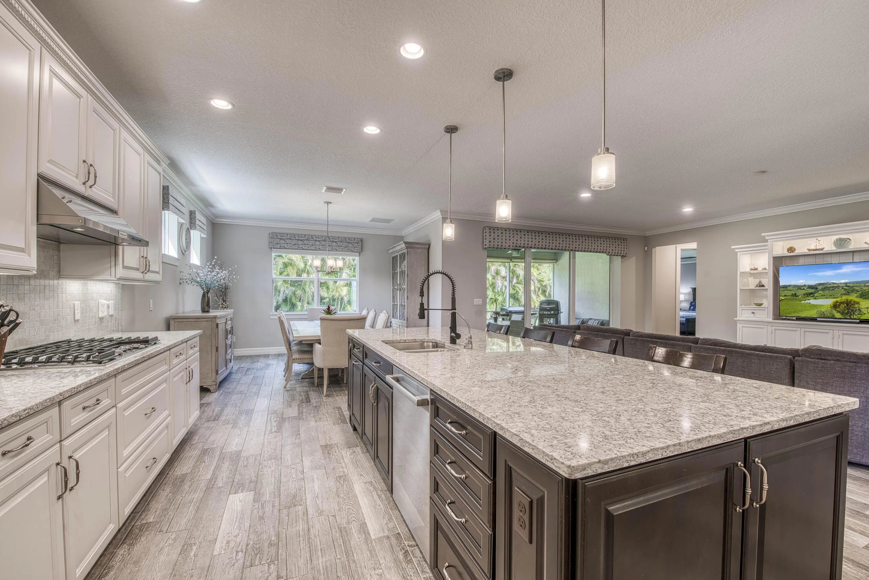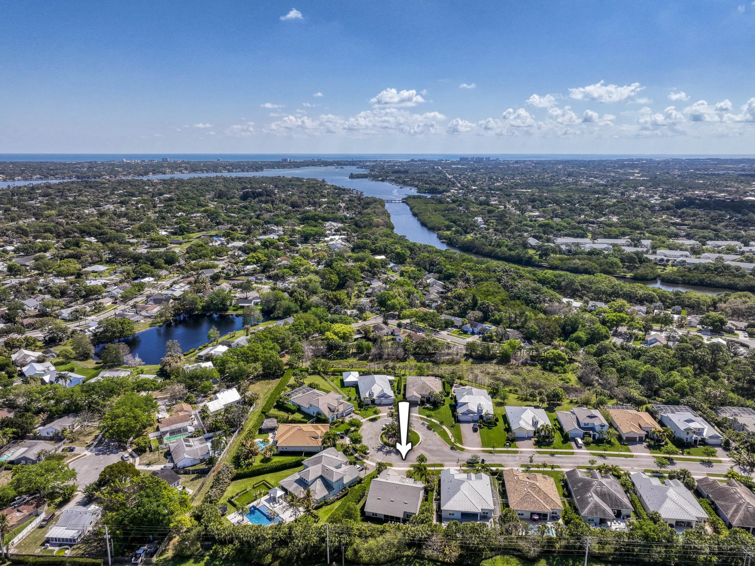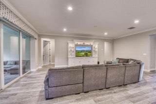 This unique and highly sought-after Pinnacle + Loft floor plan is now available in the sought-after 31-home boutique community of Shores Pointe, nestled in the heart of Jupiter. This spacious two-story, split-bedroom residence offers 4 bedrooms, 4 baths, a den/flex room, a large upstairs loft living area, and an extended 3-car garage. Built in 2017 with exceptional attention to detail, this beautifully upgraded home showcases quality and design from the moment you enter through the custom impact glass front door. Designer finishes include porcelain wood-look tile flooring, solid core doors, stylish lighting fixtures, crown molding, plantation shutters, tray ceilings, and refined touches throughout. Constructed with CBS and designed for comfort and peace of mind, the home features impact glass windows, natural gas, a 24 kW whole-house generator, and newer A/C units (2024 & 2023). The open-concept great room serves as the heart of the home, highlighted by volume ceilings and serene views of the palm tree-lined backyard. The gourmet kitchen is a true showpiece, featuring a large quartz center island with pendant lighting, white shaker cabinetry, tile backsplash, a 5-burner gas range, a spacious walk-in pantry with custom solid shelving, and a dedicated coffee/wine bar—ideal for both everyday living and entertaining. The expansive primary suite offers a tranquil retreat with a tray ceiling, sitting area, and a massive custom walk-in closet. The spa-inspired primary bath includes porcelain tile flooring, quartz countertops, elegant vanity lighting and a frameless glass walk-in shower. The versatile downstairs den/flex room can easily serve as an office, media room, home gym, or convertible 5th bedroom. Two guest bedrooms are also located on the main level. Upstairs, you'll find an impressive guest suite with extensive built-in closet storage, along with a generously sized loft providing additional living space for relaxation or entertainment. Step outside through impact glass sliders to your private backyard oasis. Enjoy beautiful sunset views from the screen-enclosed covered patio, with an oversized lot offering ample room for a future pool. Mature palm trees line the perimeter, providing exceptional privacy with no rear neighbors. Additional features include smart home technology such as a doorbell camera and Vitex security system. Shores Pointe is zoned for A-rated schools and offers a private playground/park along with walking path access to the Southwest Fork of the Loxahatchee River—perfect for launching a paddleboard or kayak. Ideally located near I-95, the Florida Turnpike, beaches, shopping, dining, parks, and nature preserves—this is Florida living at its finest!