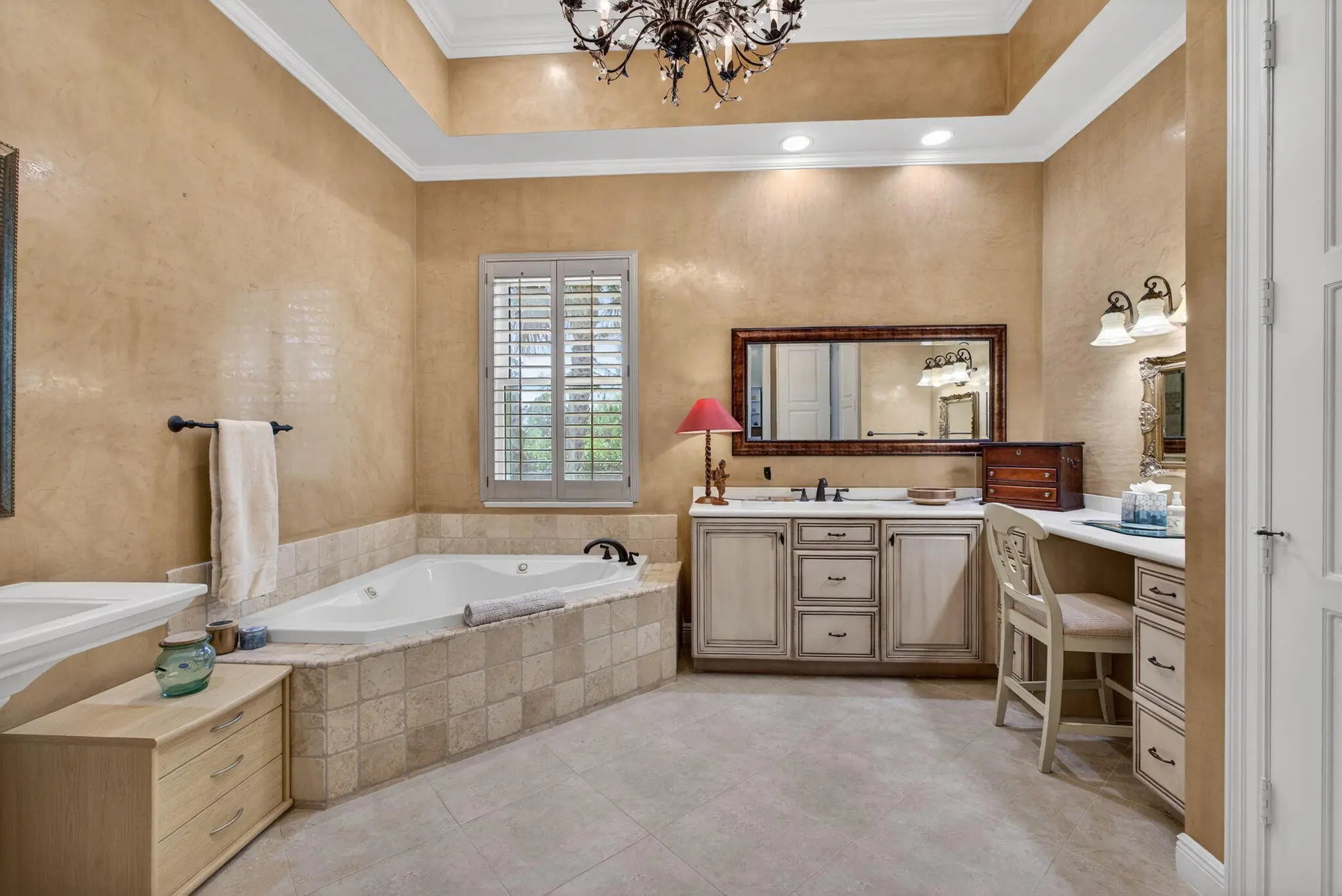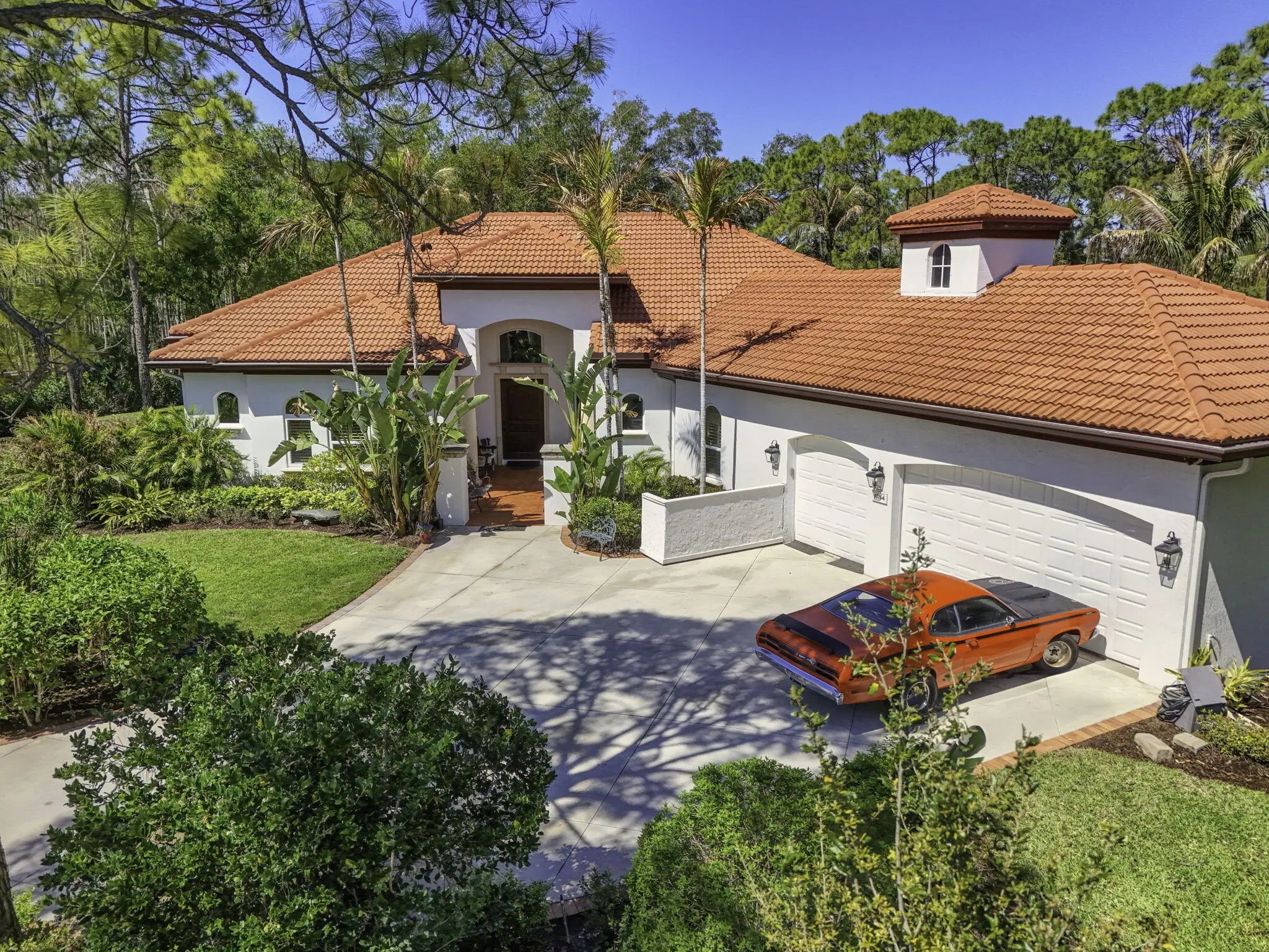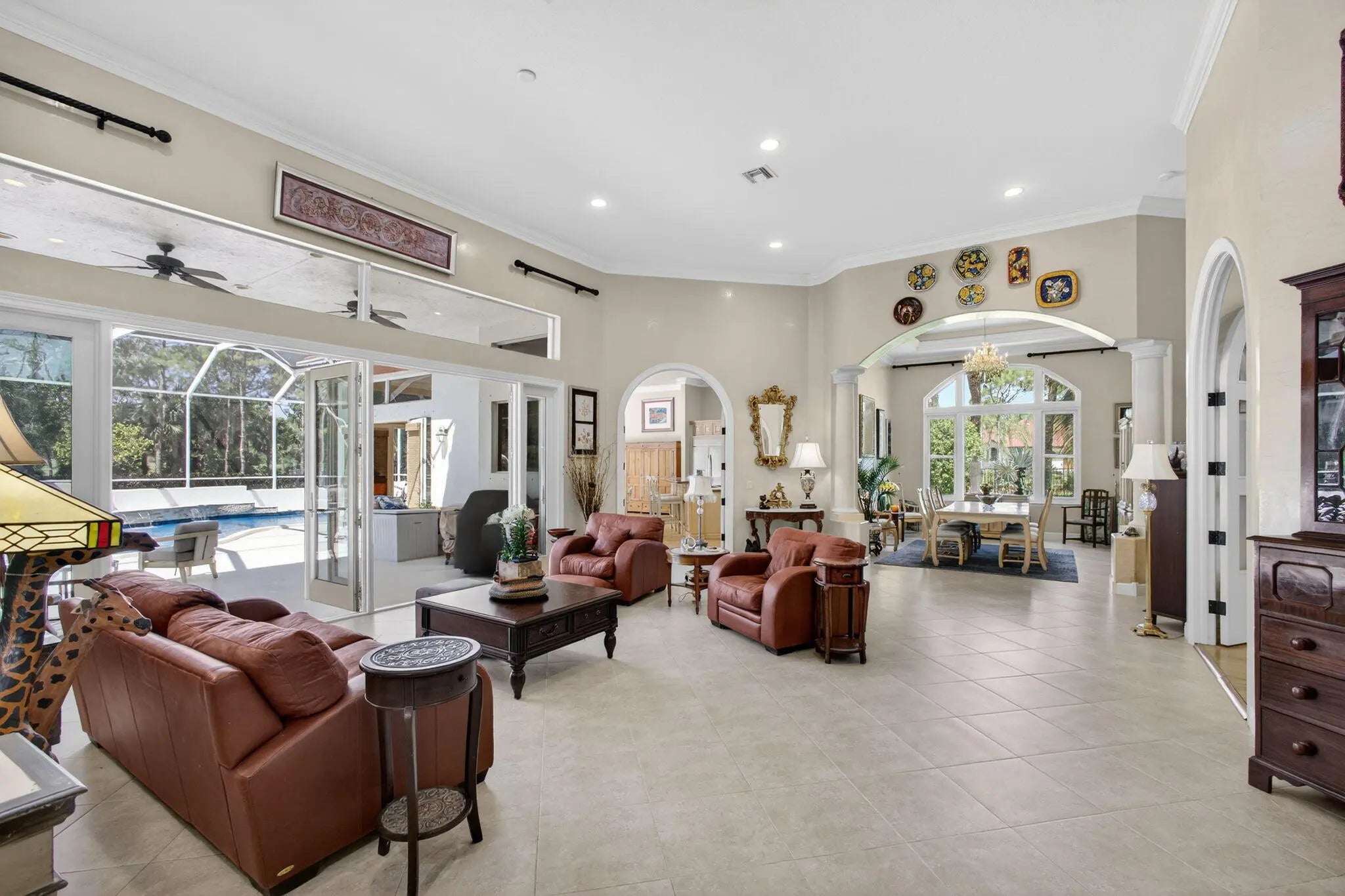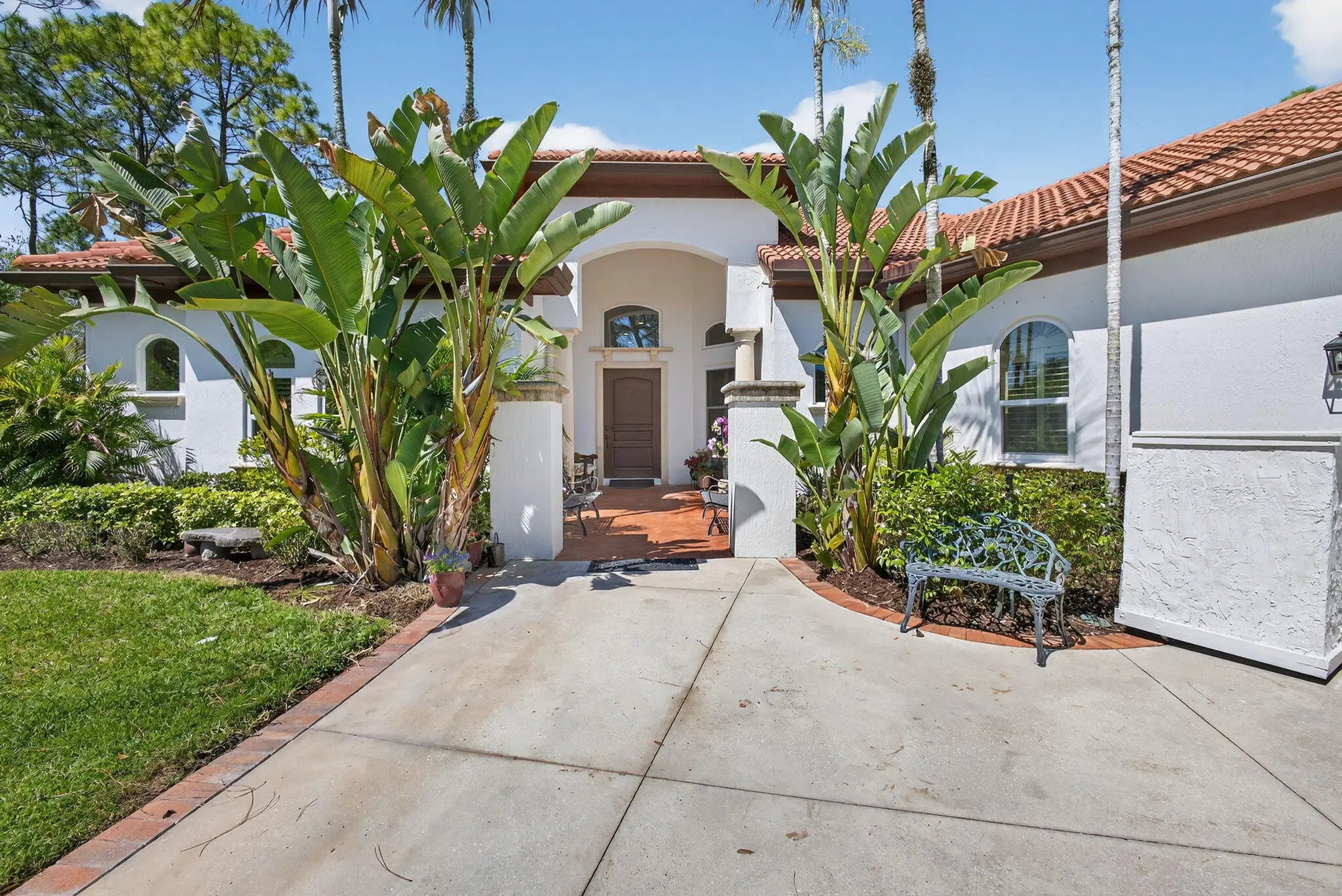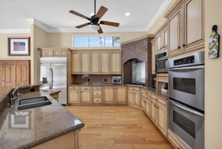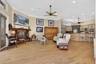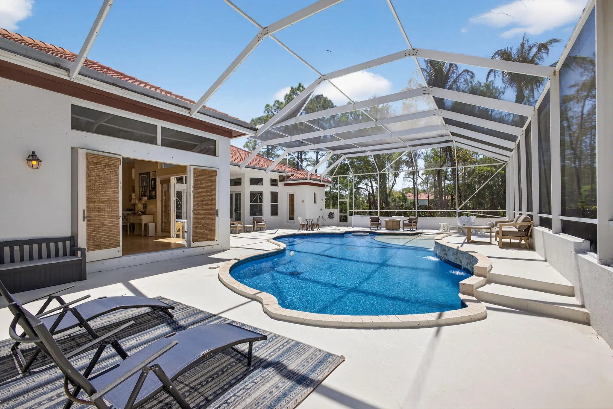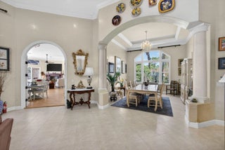 Stunning 4BR, 5BA CBS estate home on nearly one acre of beautifully landscaped, private grounds in the prestigious gated community of Ranch Colony in Jupiter. Located in the exclusive Old Trail golf community, this elegant one story home features a split floor plan, 15 ft vaulted ceiling in the living area, 12 ft vaulted ceilings in the bedrooms, crown molding, oversized rooms, and gas fireplace. Kitchen offers granite countertops, abundant cabinetry, stainless steel appliances, double wall oven, and gas range. French doors open to a large patio with private heated screened pool overlooking lush landscaping and golf course views. Manned gate, exceptional privacy, minutes to beaches, dining, and shopping. Golf, equestrian, and aviation community. No golf membership required. Low HOA.