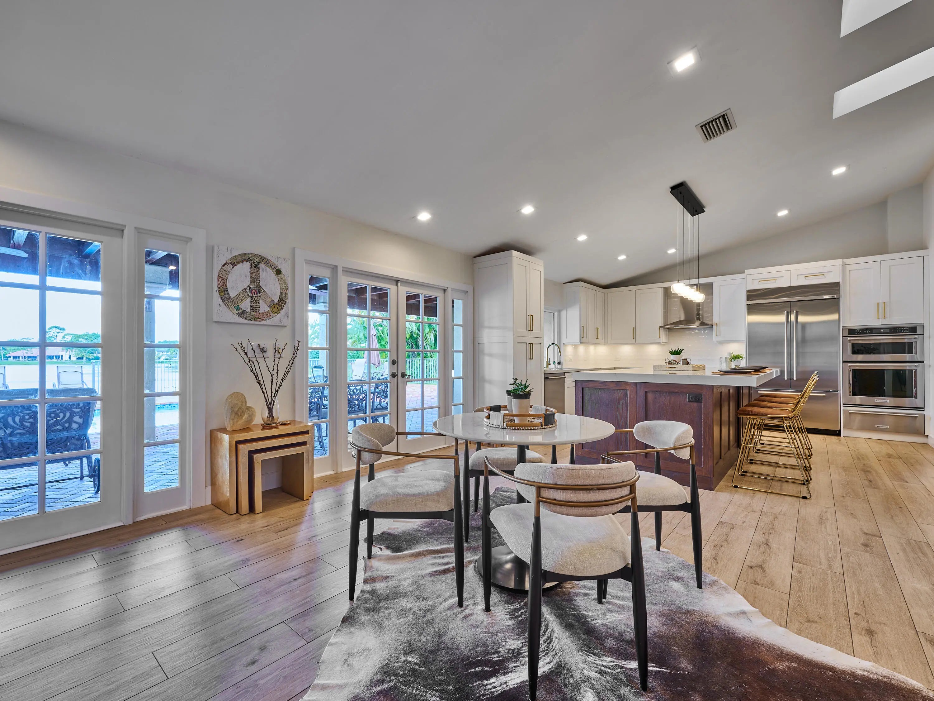 Beautifully renovated and meticulously maintained for 38 years, this exceptional 4BR/2.5BA single-story lakefront home sits on one of Boca Raton's most private, breathtaking lots in gated Estancia West. Positioned on a rare point lot, it overlooks the widest lake views with stunning sunsets and unmatched privacy. Water vistas fill six main rooms. Five French doors open to a paver patio and pool for seamless indoor-outdoor living. Features include porcelain and wood flooring, vaulted ceilings, skylights, fireplace, and a renovated kitchen with premium appliances. Upgrades include impact windows, dual-zone A/C, and hurricane-rated screens. A true rare opportunity. Rare point lot location with significantly expanded water frontage compared to standard lake lots Rear "exclusive use" easement creates a park-like setting and enhanced privacy with no rear neighbors Northwest rear exposure delivers consistent sunset views year-round Expanded driveway and courtyard parking for up to 7 vehicles Completely carpet-free throughout for a clean, modern feel Spanish porcelain flooring in main areas and wood flooring in select bedrooms Vaulted ceilings and skylights provide abundant natural light Wood-burning fireplace in family room Kitchen & Systems Renovated kitchen with KitchenAid stainless steel appliances Includes induction cooktop, convection oven & microwave, warming drawer Oversized island with extensive storage Dual-zone Carrier high-efficiency A/C systems (newer) Newer water heater Storm Protection & Outdoor Impact-resistant windows (front and sides) Miami-Dade rated Armor Screen system on covered patio Removable child safety pool fence included Ideal indoor-outdoor entertaining layout with multiple French door access points Location & Lifestyle Access to private community park amenities including tennis, pickleball, basketball, and playground Short walk to Boca Raton Jewish Center via private resident gate School bus stop nearby and visible from property Zoned for top-rated schools: Del Prado, Omni, Spanish River