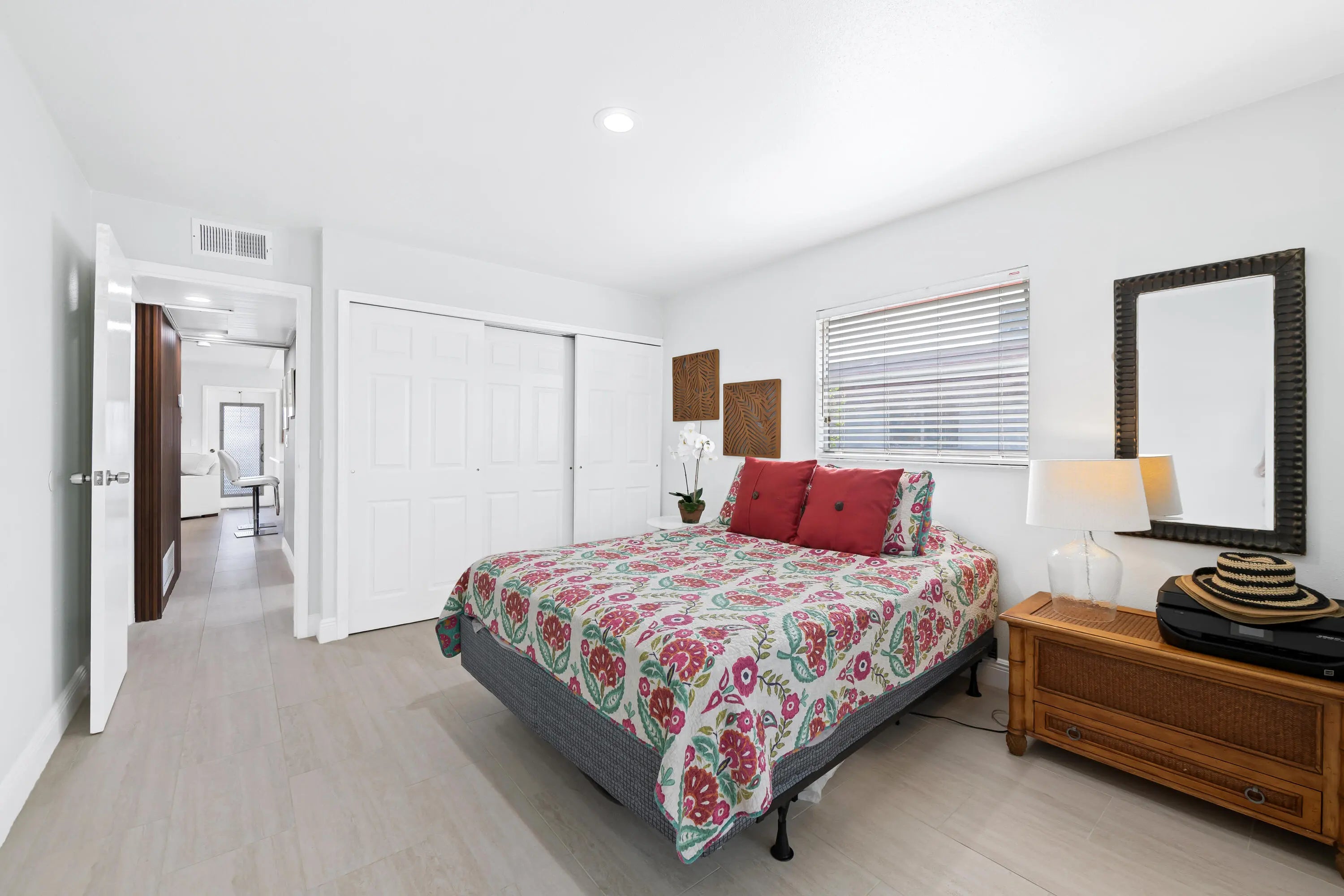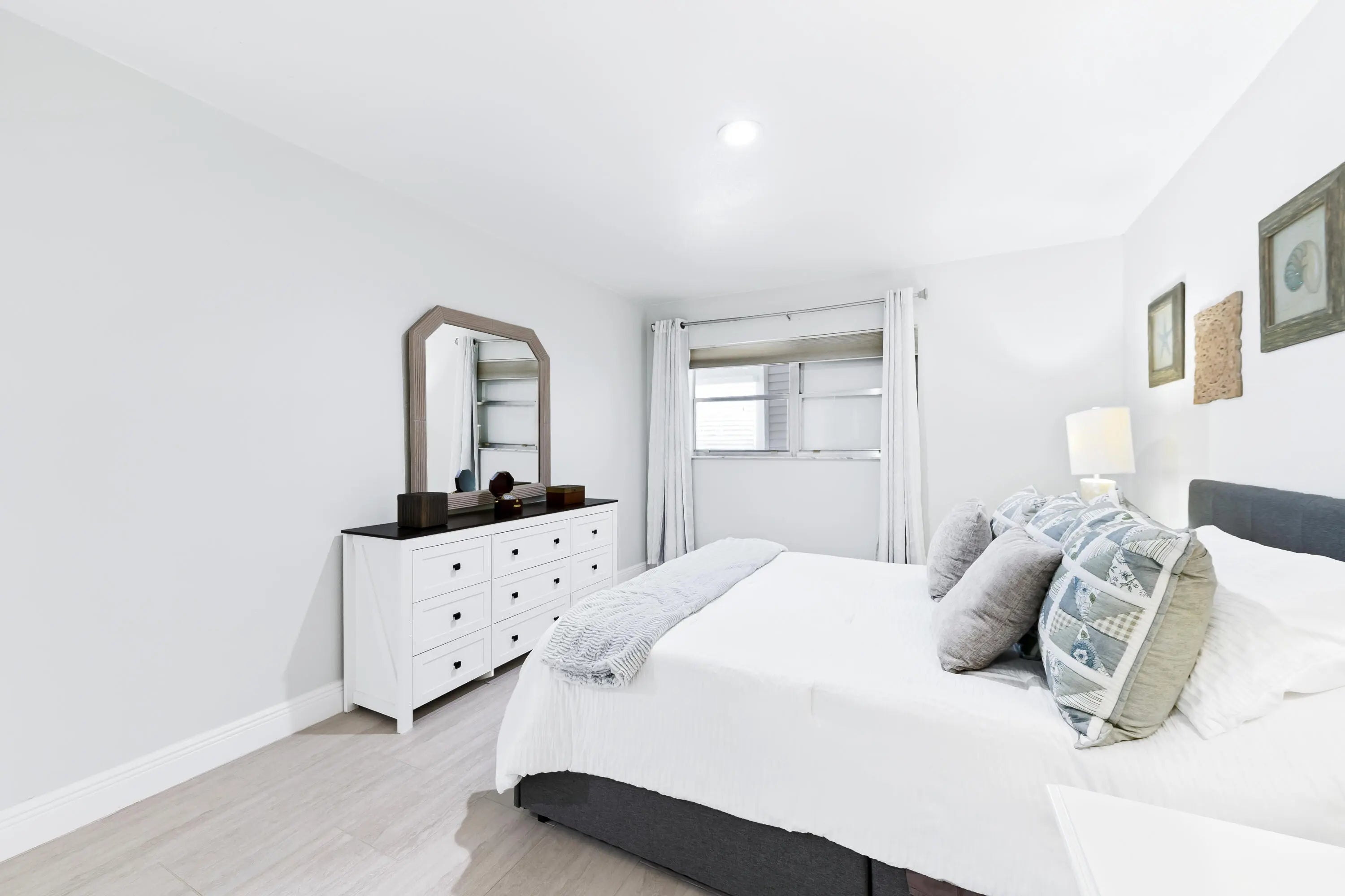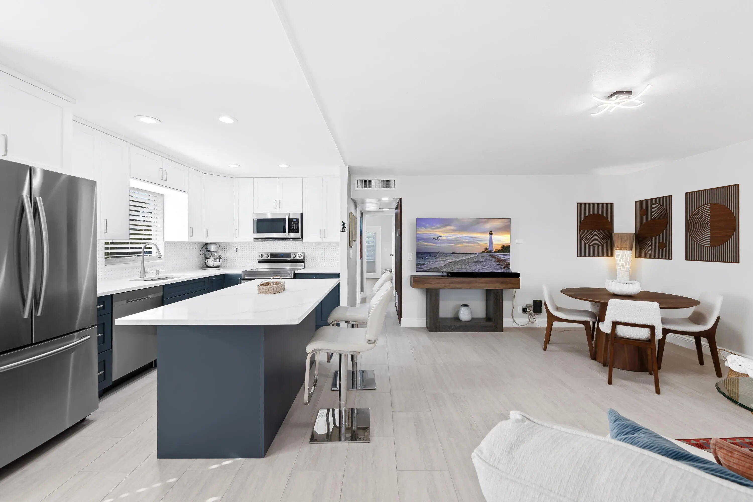 Stunning fully remodeled 2BR/2BA Corner Villa in Kings Point! Modern tile throughout and a bright open layout. Designer kitchen featuring a show-stopping quartz island, stainless steel appliances (3 years old), white shaker and blue cabinets, and a quartz backsplash. Spacious primary suite with private bath. Both bathrooms are show-stopping, fully renovated with sleek modern vanities and designer finishes. A/C 5 years old, ducts cleaned and sanitized, modern washer/dryer, plus fiber-optic high-speed cable. Sold furnished — true turnkey! Thoughtfully upgraded from top to bottom--nothing left to do but move in! Enjoy 55+ resort-style amenities including pools, clubhouse, fitness center, tennis, theater, and courtesy bus. Minutes to shopping, dining, and beaches.