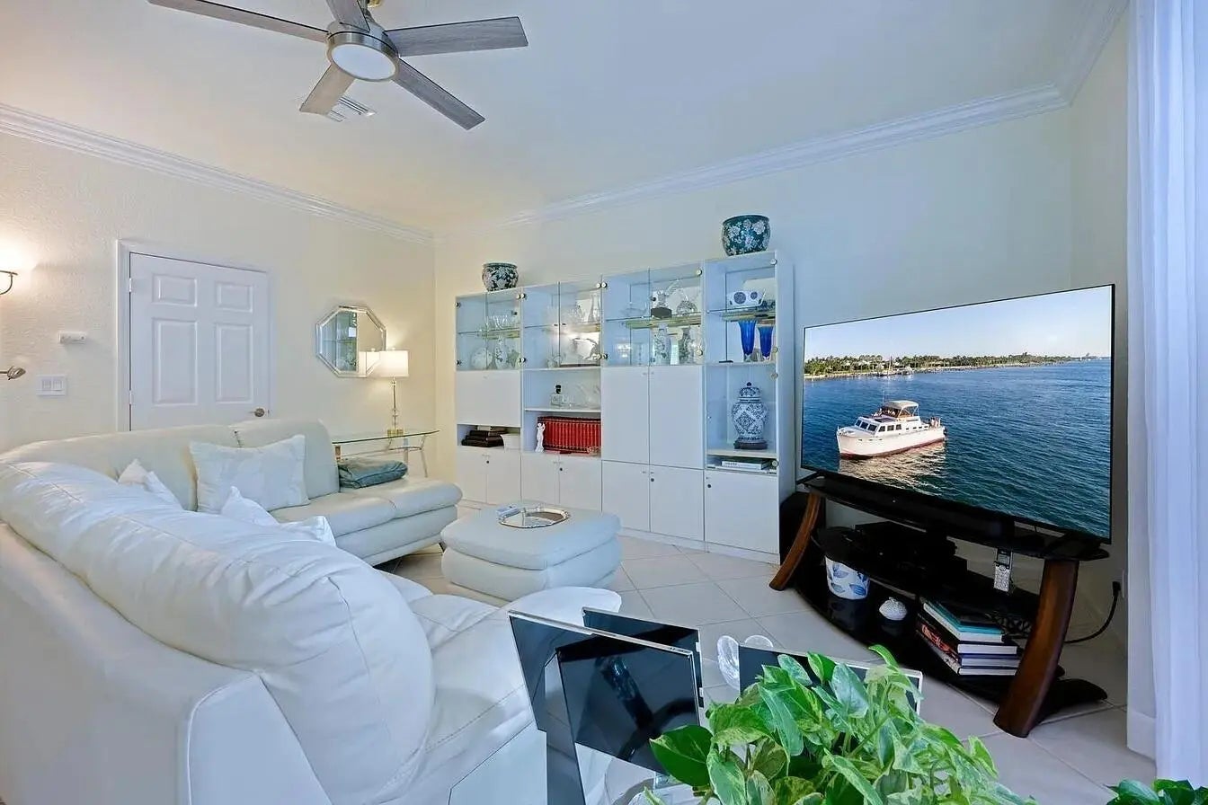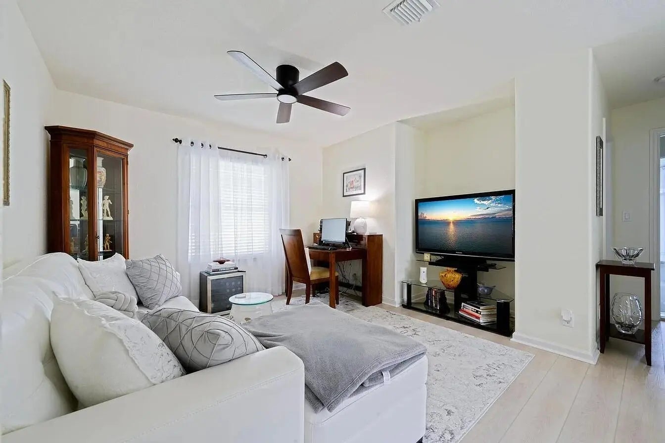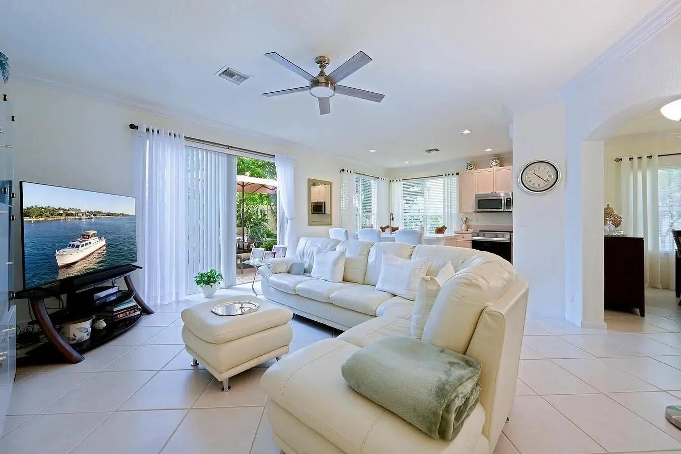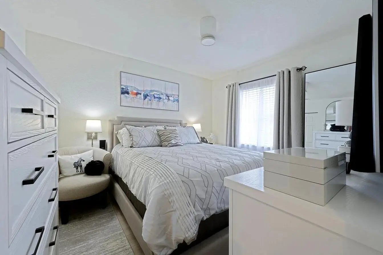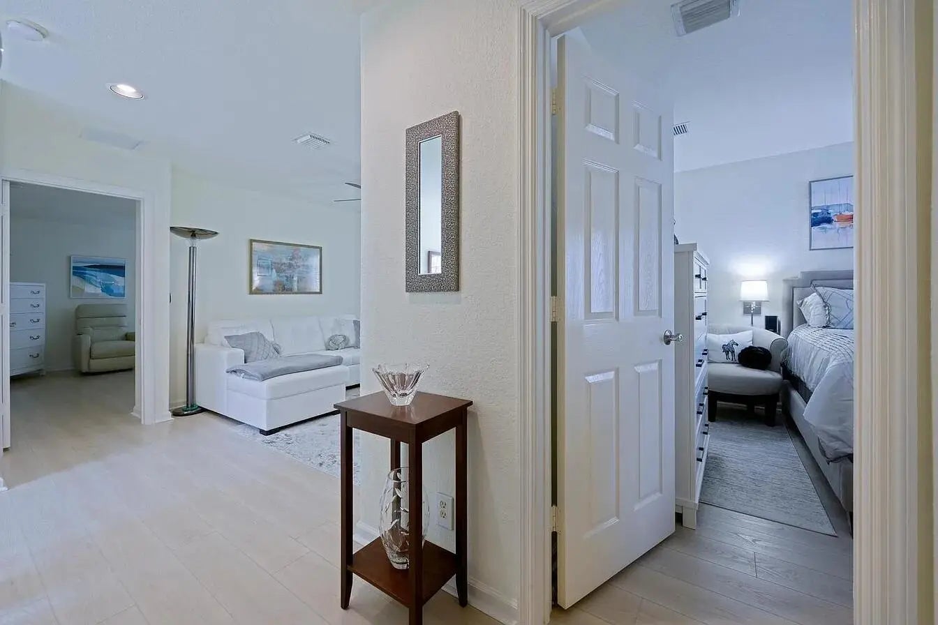 Welcome to this hidden gem nestled in the highly sought-after Lakes of Laguna. This stunning 4-bedroom, 2.5-bathroom home offers a private retreat and is perfect for entertaining or accommodating a large family. Thishome has a spacious layout featuring multiple gathering areas both upstairs and downstairs, inside and outside. Step into the large, light-filled living room, highlighted by a classy chandelier, wall sconces, and abundant natural light fromoversized windows. Accordion hurricane shutters throughout provide both safety and convenience. The formal dining area is a showpiece, featuring a custom chandelier framed by a stylish ceiling soffit that adds depth and architecturalcharacter to the space. Beautiful tile floors downstairs, recently refreshed grout, and classy