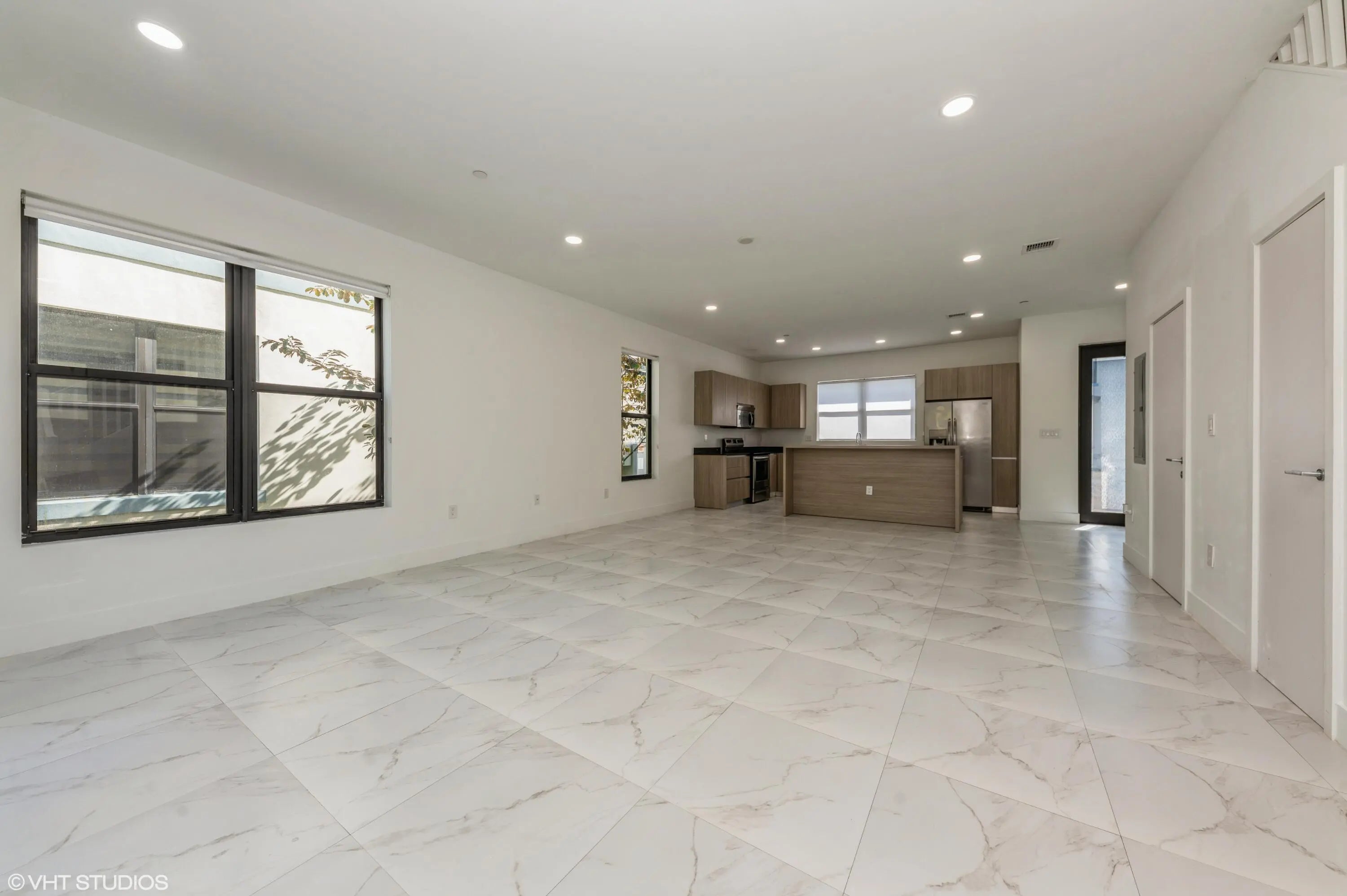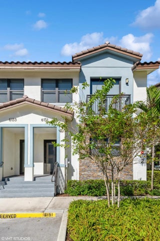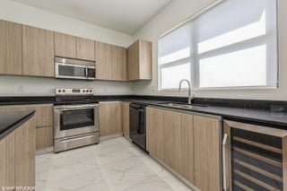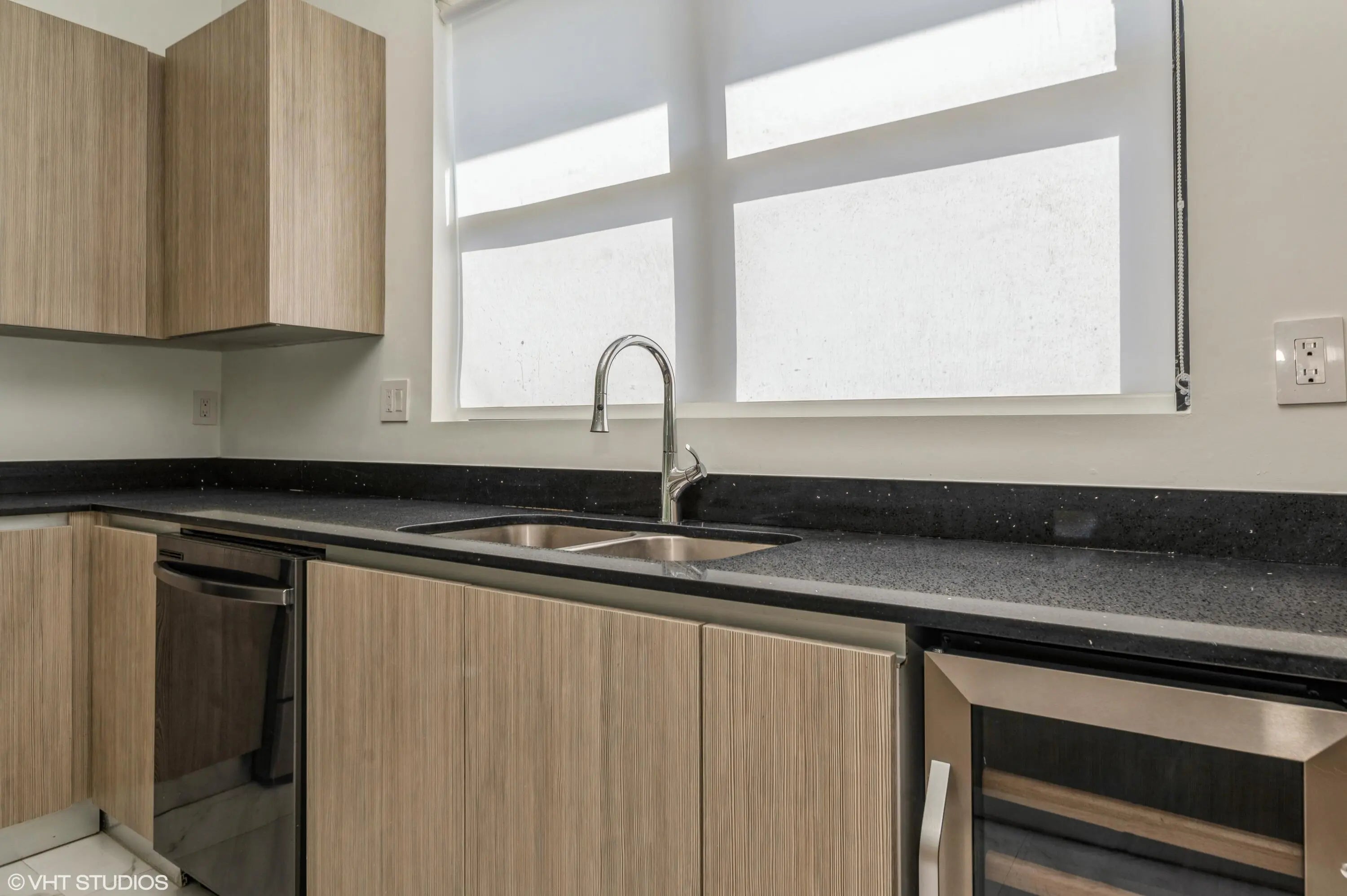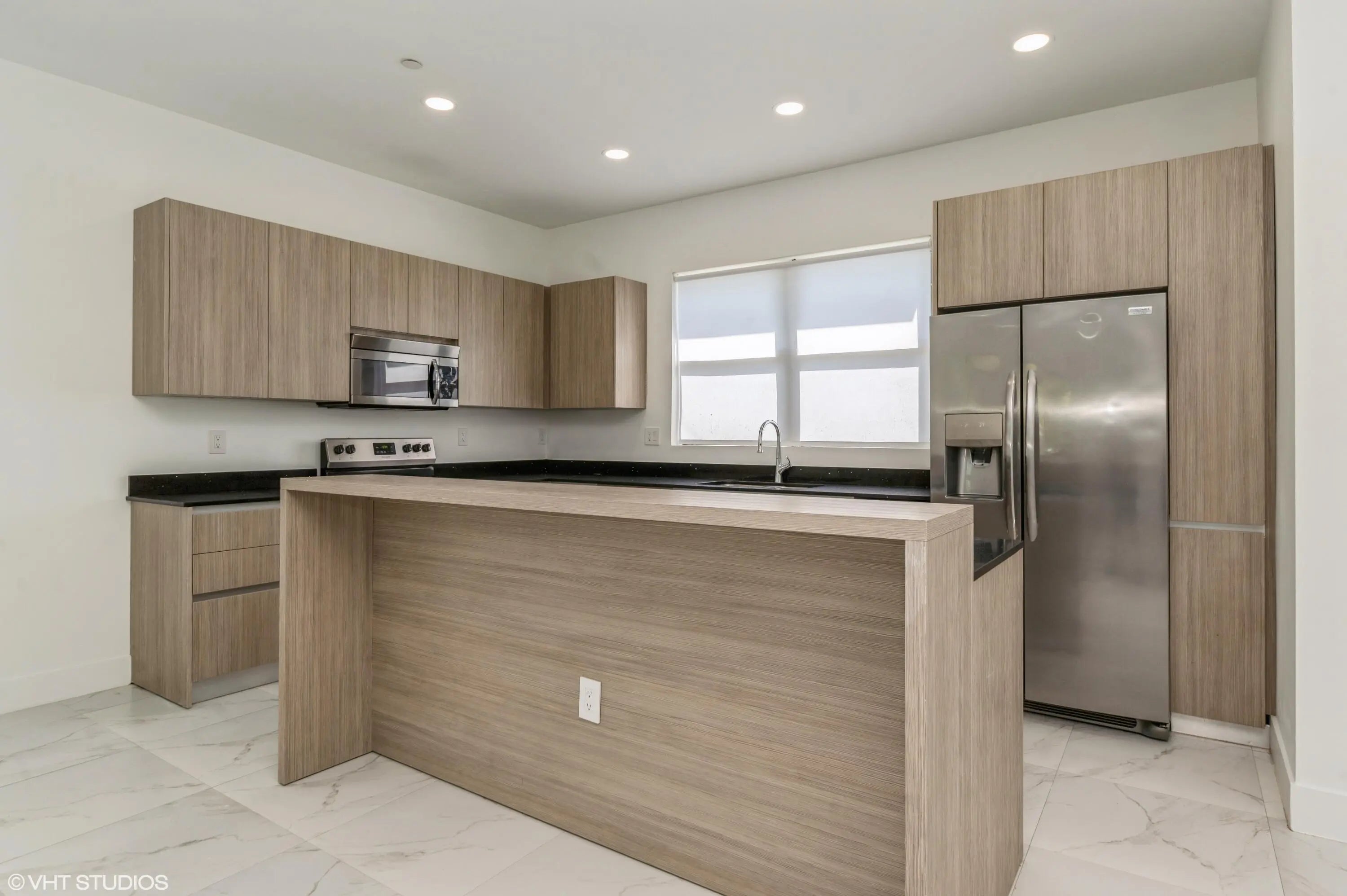 Elegantly designed modern townhome featuring 3 bedrooms and 2.5 bathrooms. Boasting impressive 10ft ceilings adorned with sleek LED flush lights. Chic finishes, including waterfall chrome faucets, tile flooring on the 1st level, & sophisticated wood laminate on the 2nd floor. The kitchen showcases stainless steel appliances, a convenient wine cooler, & quartz countertops. Enjoy the contemporary touch of laminated doors with magnetic closers, coupled with the security of impact doors and windows throughout.