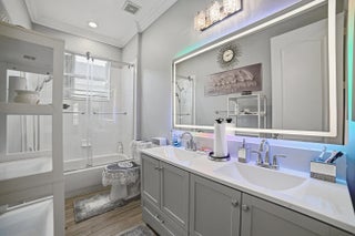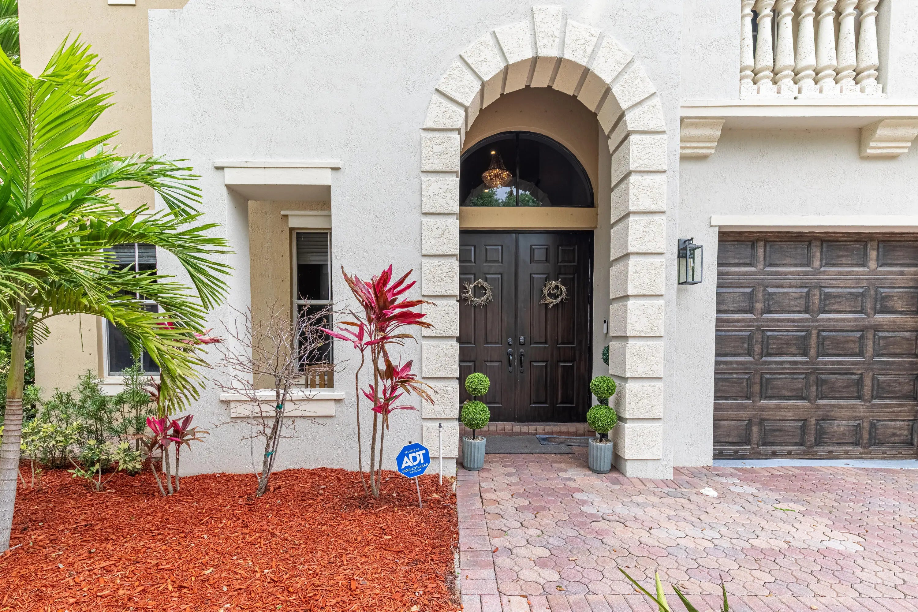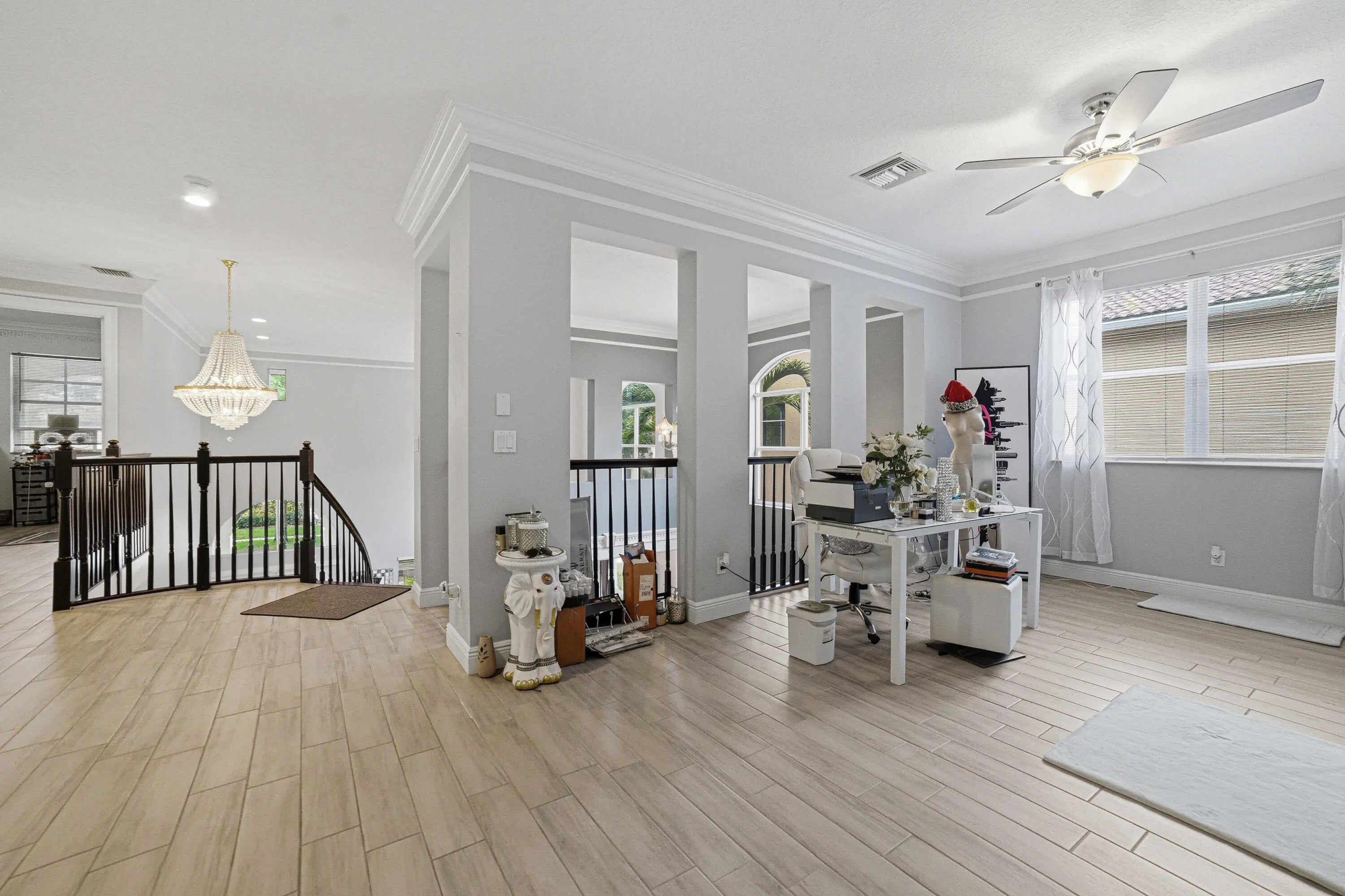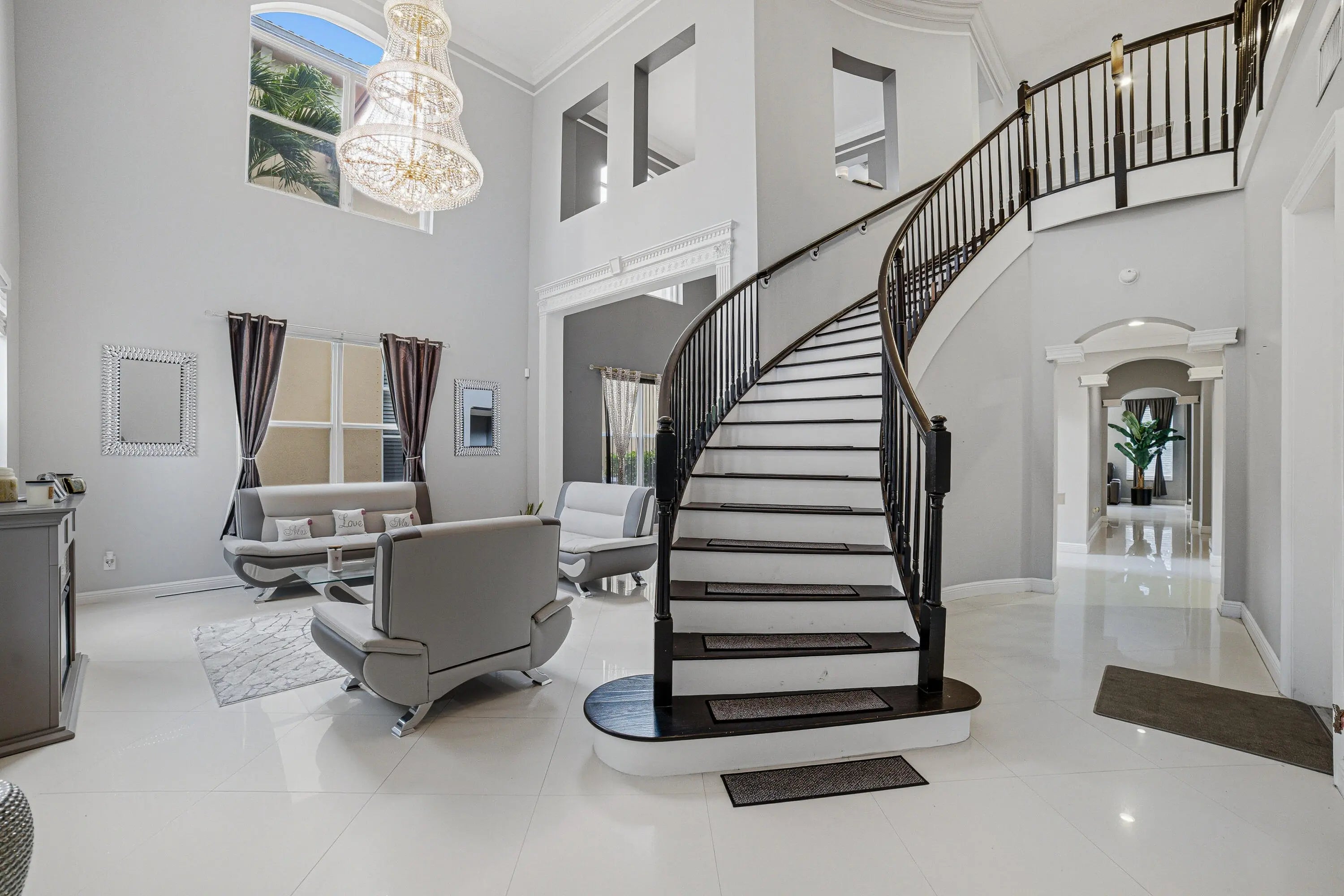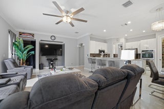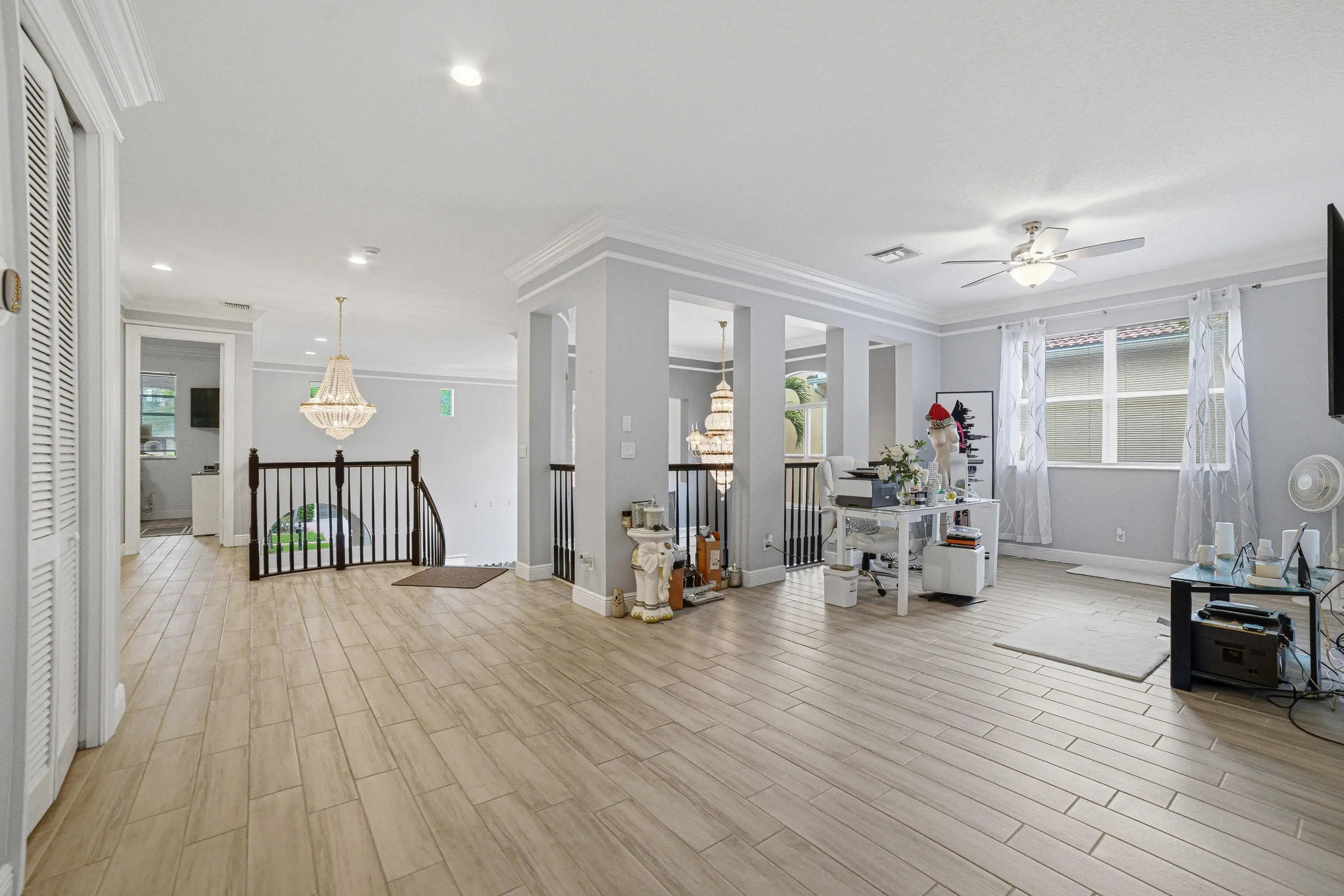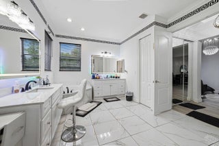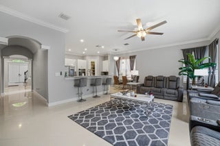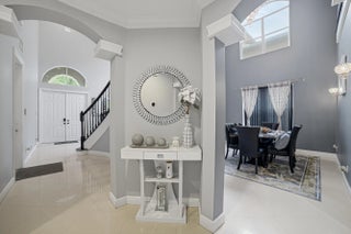 Welcome to Worthington Estates, an exclusive gated enclave of just 81 residences, ideally situated off West Okeechobee Boulevard in the heart of West Palm Beach. This private and picturesque community offers a rare blend of tranquility and convenience. This exceptional estate boasts approximately 4,500 square feet under air and makes a striking first impression with a grand, designer-inspired entry featuring a sweeping custom staircase and dazzling crystal chandeliers. Thoughtfully designed for both refined entertaining and comfortable everyday living, this five-bedroom, four-and-a-half-bath residence offers an expansive and versatile layout. The main level showcases a luxurious primary suite, along with an additional oversized bedroom perfect for a home office, guest suite, or playroom. Formal living and dining spaces are complemented by soaring ceilings, while the open-concept kitchen seamlessly flows into the family room, creating an ideal gathering space. A substantial bonus room—perfect as a private media lounge or game room—features its own half bath. Elegant crown molding throughout enhances the home's sophisticated aesthetic. Upstairs, a bright and spacious loft provides additional living space, accompanied by new plank-style tile flooring throughout. The second level offers a well-appointed primary suite at the front of the home with a private balcony, two centrally located guest bedrooms, and an extraordinary owner's retreat at the rear. This expansive suite features a separate sitting area or office, dual walk-in closets, a spa-caliber marble bathroom, and a private balcony overlooking the serene backyard. Outdoors, discover your own resort-style retreat. A sparkling in-ground pool, expansive covered patio, and lush tropical landscaping create an idyllic setting for both relaxation and upscale entertaining year-round. A rare offering within a boutique community, this residence embodies the essence of luxury South Florida living. Private showings available by appointment.