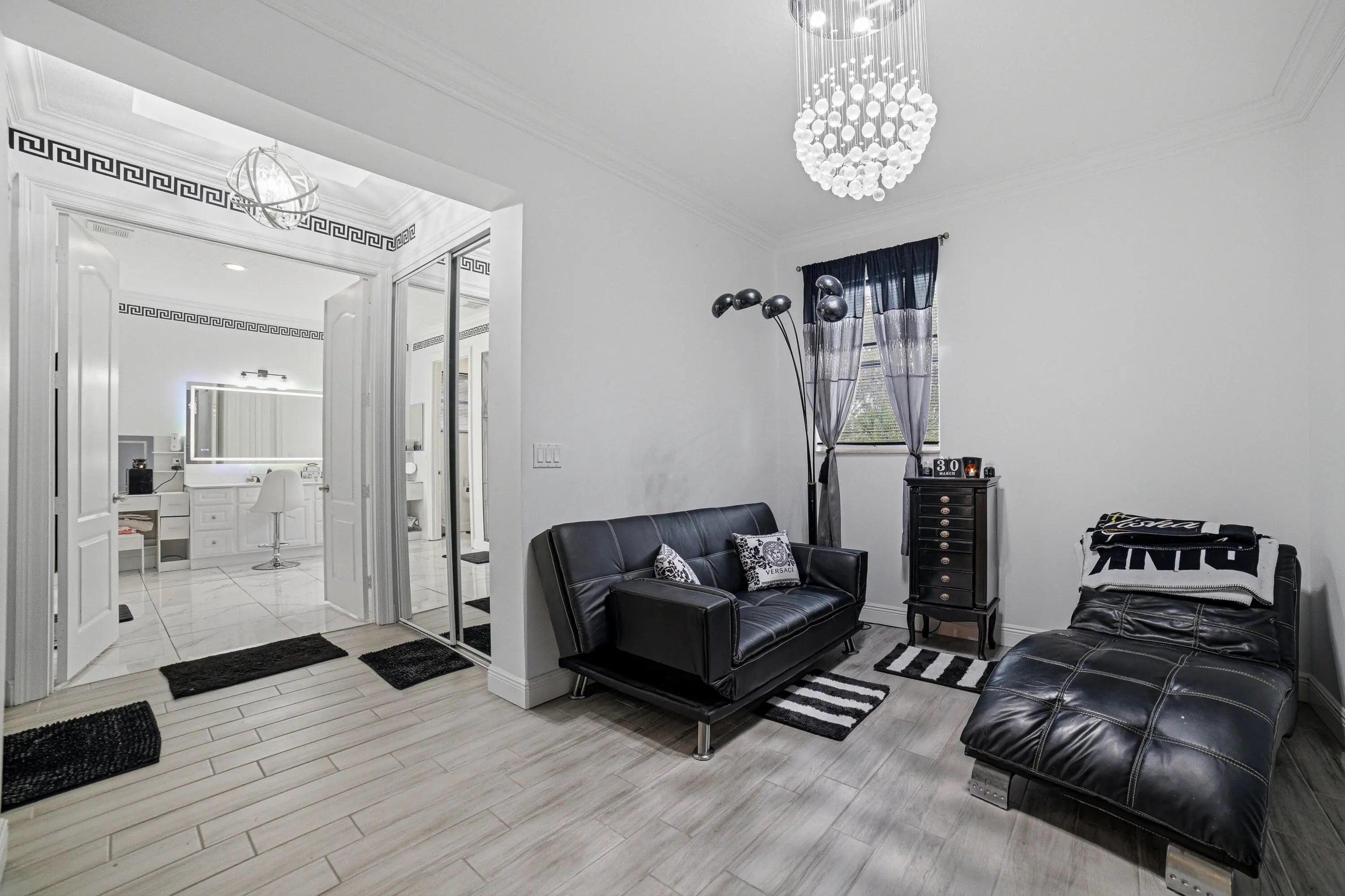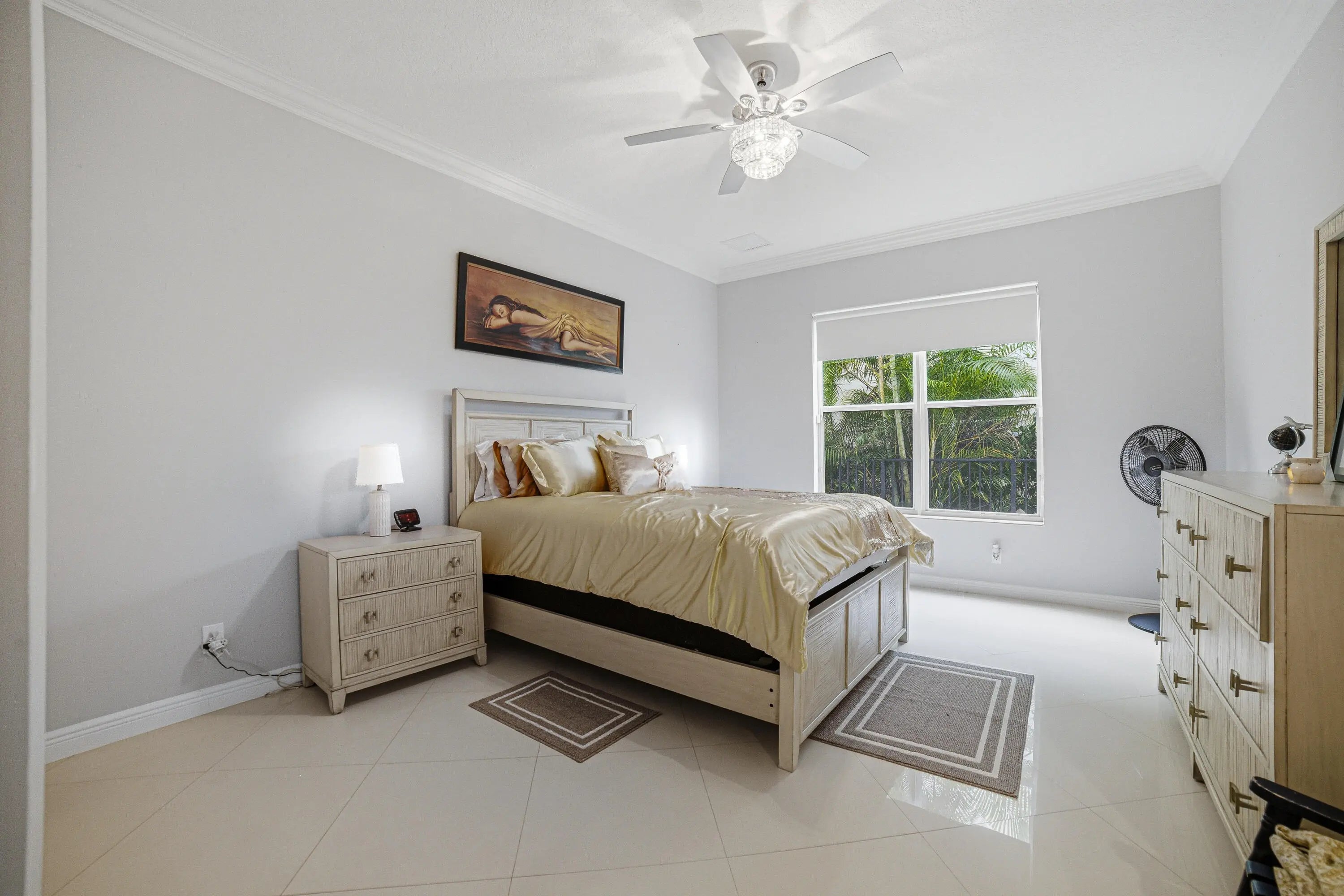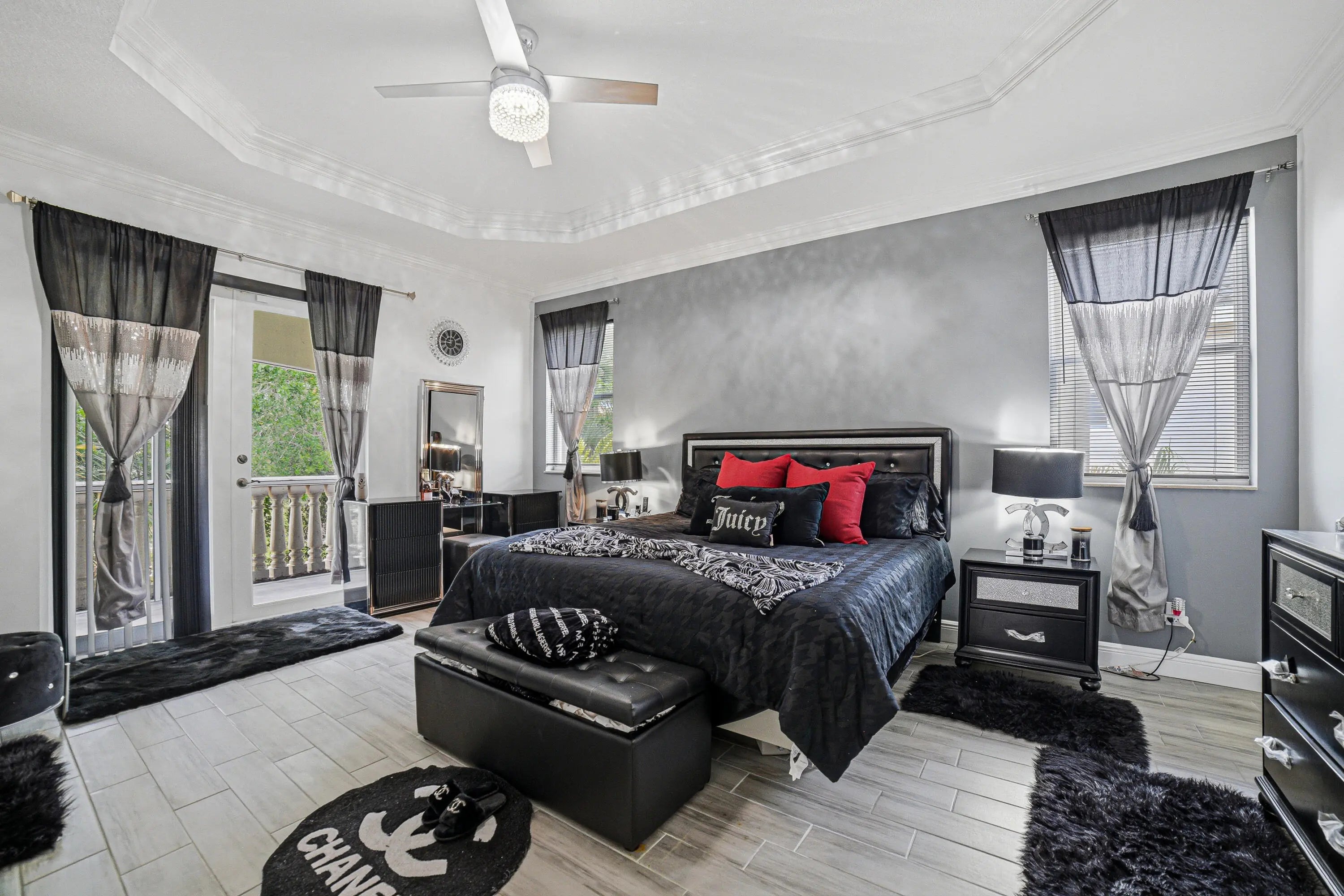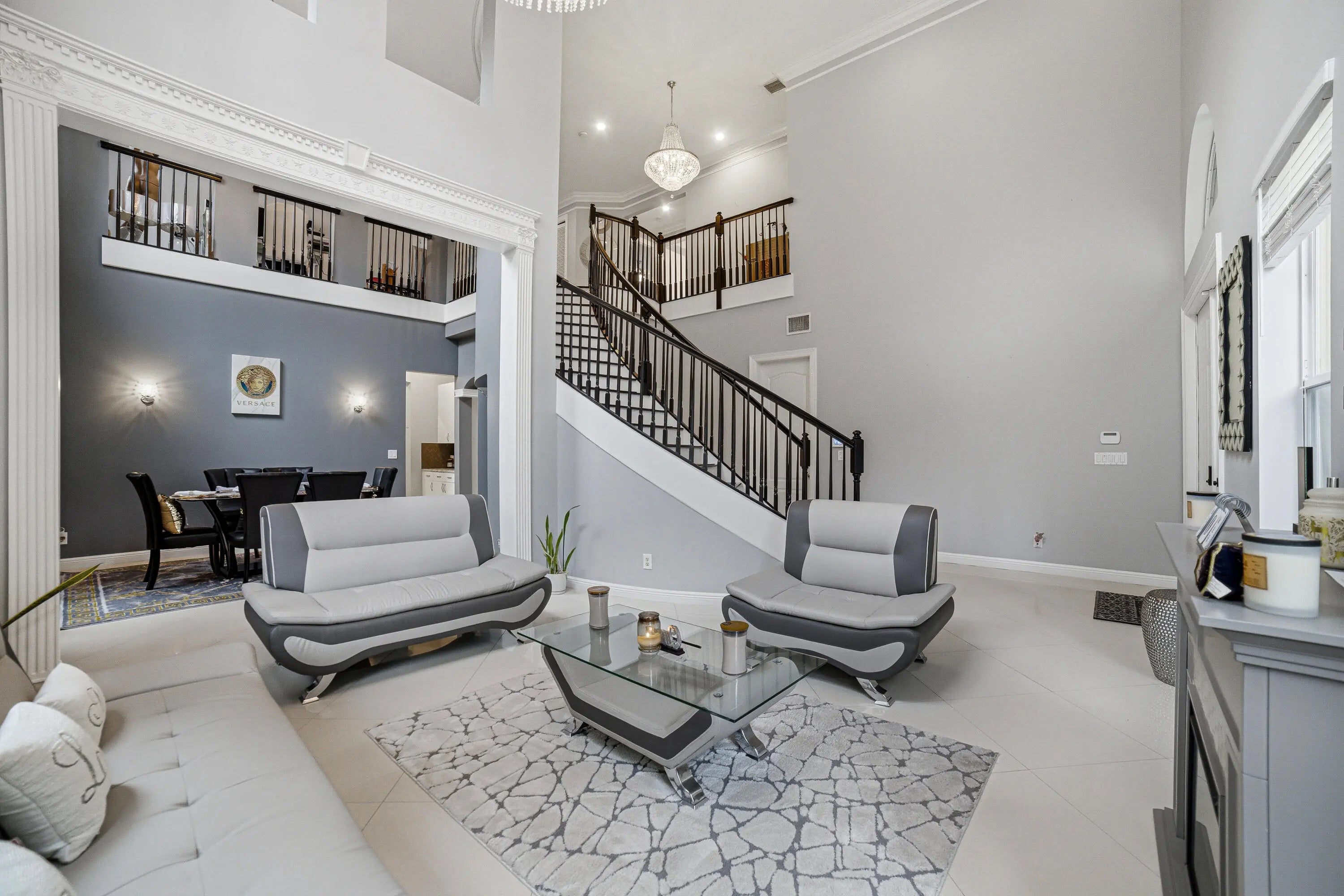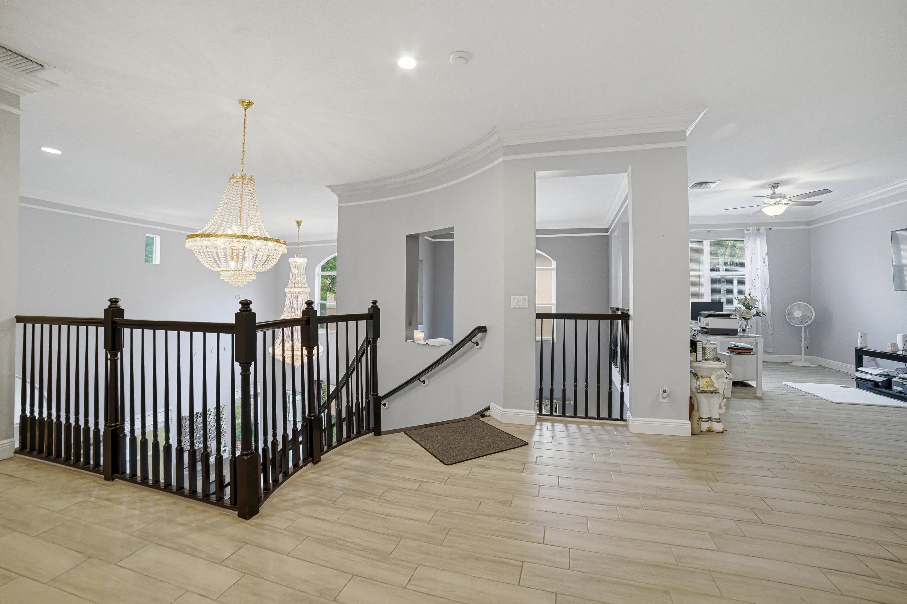 Welcome to Worthington Estates, an exclusive gated enclave of just 81 residences, ideally situated off West Okeechobee Boulevard in the heart of West Palm Beach. This private and picturesque community offers a rare blend of tranquility and convenience. This exceptional estate boasts approximately 4,500 square feet under air and makes a striking first impression with a grand, designer-inspired entry featuring a sweeping custom staircase and dazzling crystal chandeliers. Thoughtfully designed for both refined entertaining and comfortable everyday living, this five-bedroom, four-and-a-half-bath residence offers an expansive and versatile layout. The main level showcases a luxurious primary suite, along with an additional oversized bedroom perfect for a home office, guest suite, or playroom. Formal living and dining spaces are complemented by soaring ceilings, while the open-concept kitchen seamlessly flows into the family room, creating an ideal gathering space. A substantial bonus room—perfect as a private media lounge or game room—features its own half bath. Elegant crown molding throughout enhances the home's sophisticated aesthetic. Upstairs, a bright and spacious loft provides additional living space, accompanied by new plank-style tile flooring throughout. The second level offers a well-appointed primary suite at the front of the home with a private balcony, two centrally located guest bedrooms, and an extraordinary owner's retreat at the rear. This expansive suite features a separate sitting area or office, dual walk-in closets, a spa-caliber marble bathroom, and a private balcony overlooking the serene backyard. Outdoors, discover your own resort-style retreat. A sparkling in-ground pool, expansive covered patio, and lush tropical landscaping create an idyllic setting for both relaxation and upscale entertaining year-round. A rare offering within a boutique community, this residence embodies the essence of luxury South Florida living. Private showings available by appointment.