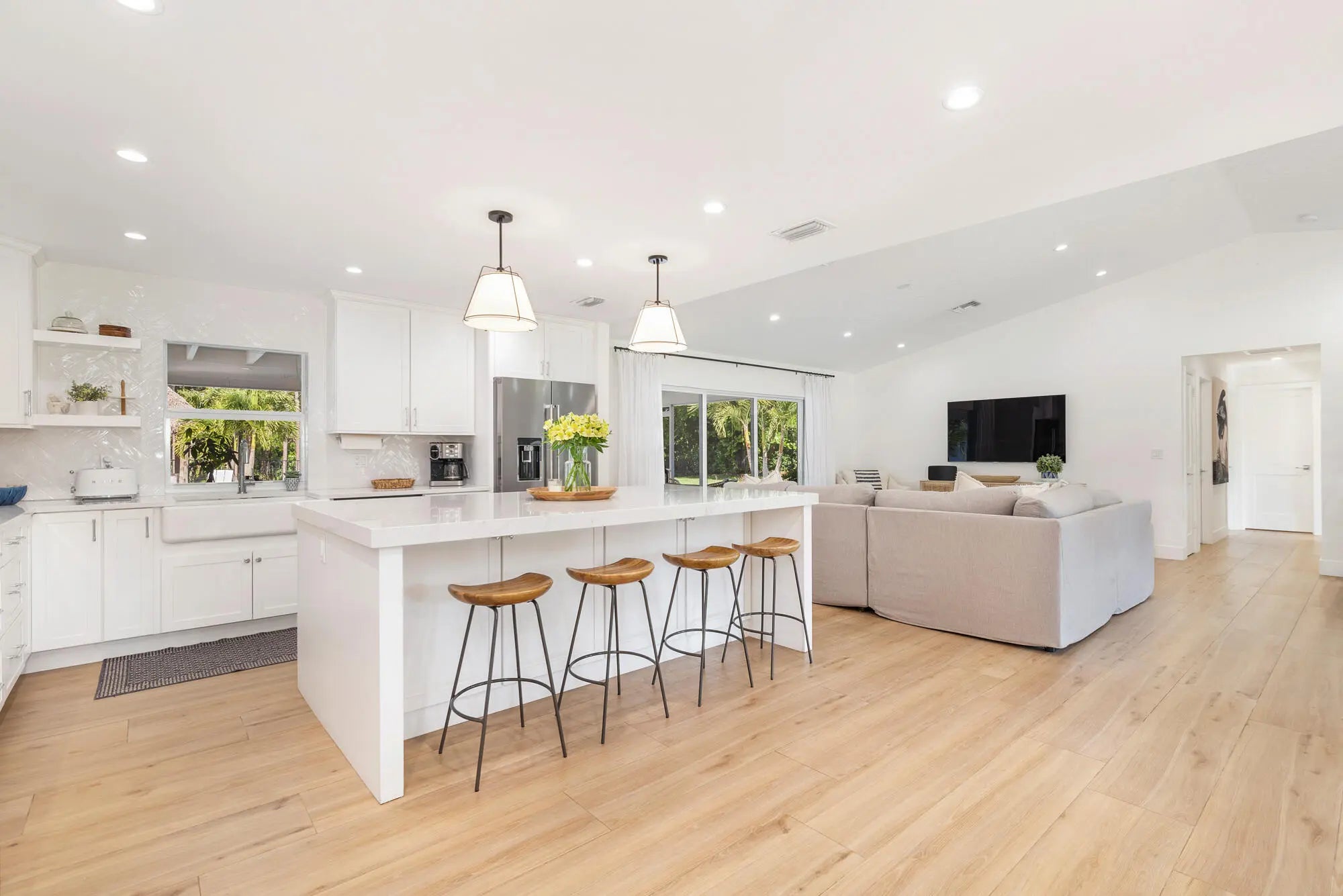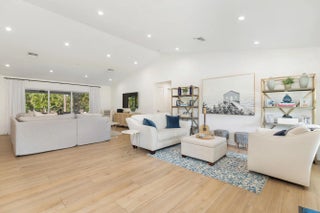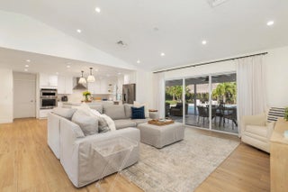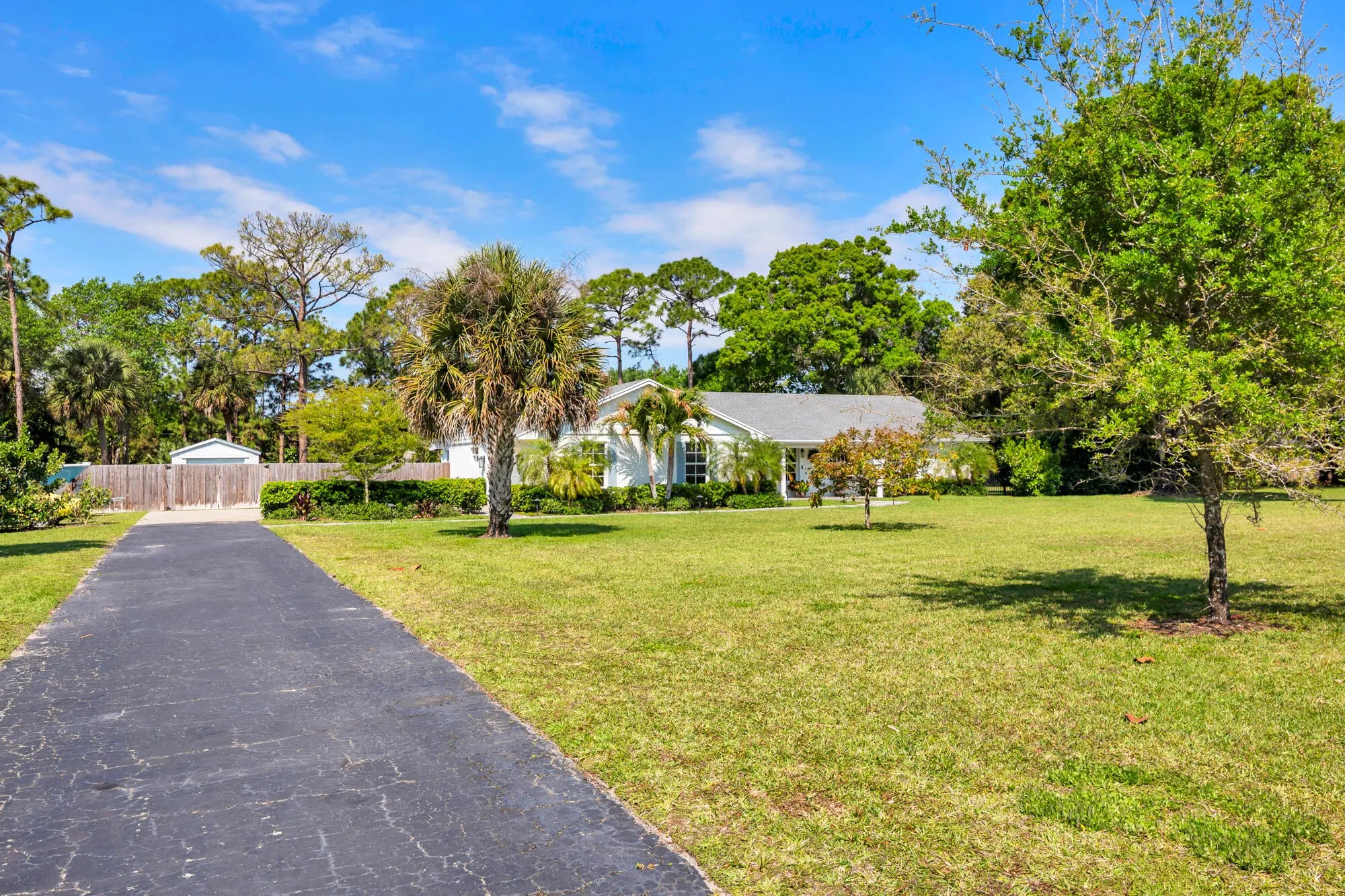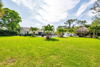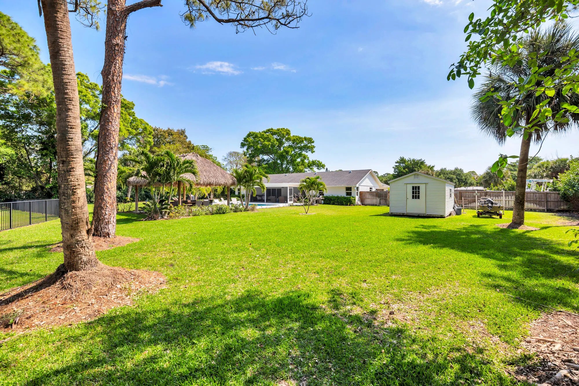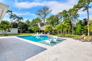 Located in the highly sought-after Horseshoe Acres Club, this beautifully updated home sits on a sprawling one-acre property within a private, 154-home gated community known for its space, privacy, and exceptionally low HOA of just $33/month. This residence underwent a complete renovation in 2020, featuring new exterior stucco, roof, impact windows, flooring, A/C system, bathrooms, and a stunning modern kitchen. The chef's kitchen is designed for both style and function, highlighted by a large center island with a built-in wine cooler—perfect for entertaining. Step outside to your private backyard oasis, completed in 2022. Enjoy a custom 36' x 15' heated pool with an attached 6' x 8' heated spa, along with a generous 9' x 15' sun shelf featuring two submersible lounge chairs. The expansive pool deck is finished in elegant white marble and includes a 21' x 15' tiki hut, creating the ultimate South Florida outdoor living experience. The screened patio also showcases matching marble flooring for a seamless indoor-outdoor flow. The fully fenced backyard offers both privacy and functionality. It features black aluminum picket fencing and a substantial 12' x 24' anchored shed complete with a roll-down garage door, rear entry, and window ideal for storage, hobbies, or a workspace. This is a rare opportunity to own a fully renovated estate property with resort-style amenities in one of Palm Beach Gardens' most unique and desirable communities.