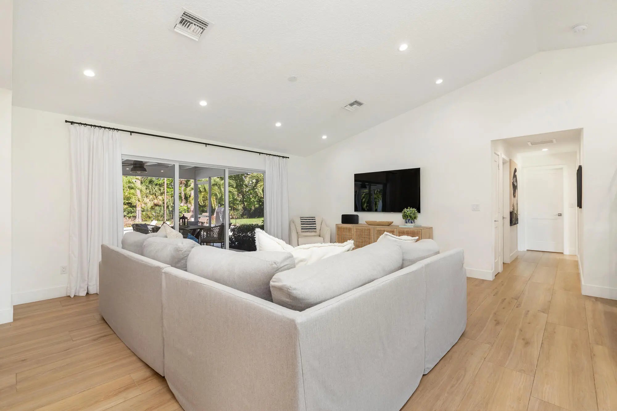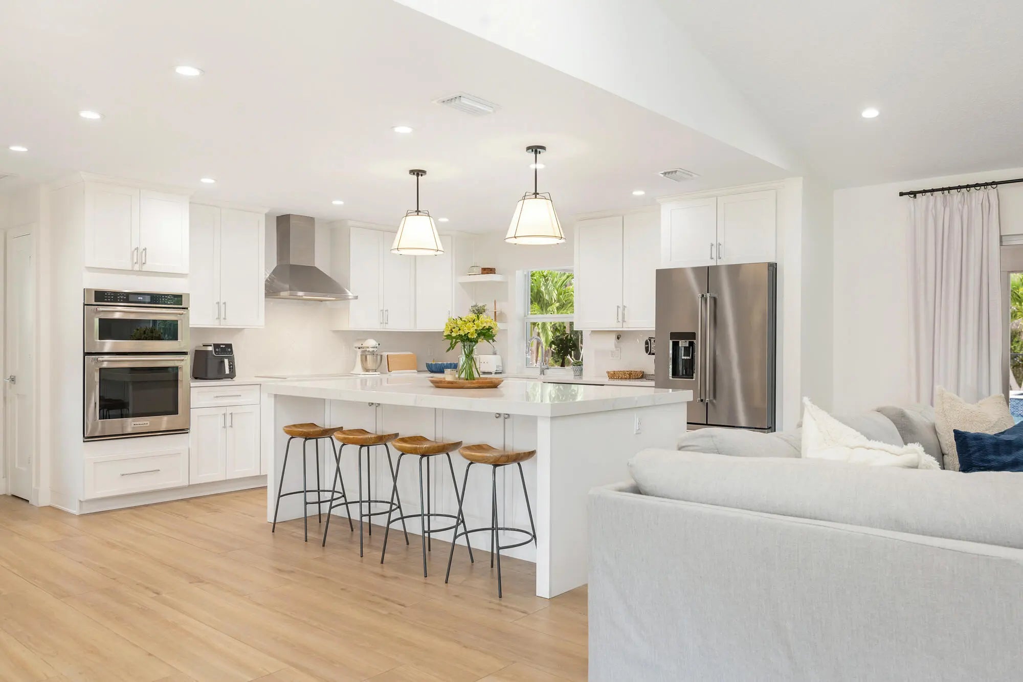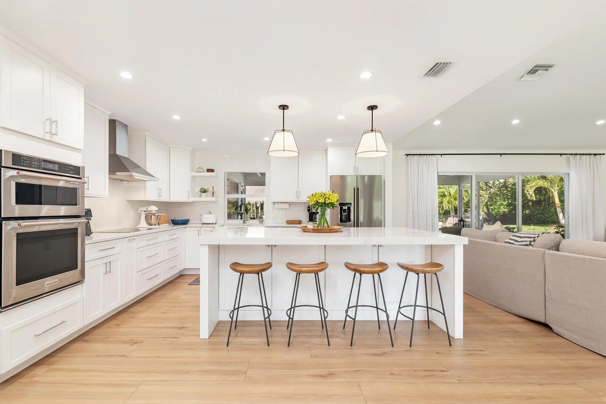 Located in the highly sought-after Horseshoe Acres Club, this beautifully updated home sits on a sprawling one-acre property within a private, 154-home gated community known for its space, privacy, and exceptionally low HOA of just $33/month. This residence underwent a complete renovation in 2020, featuring new exterior stucco, roof, impact windows, flooring, A/C system, bathrooms, and a stunning modern kitchen. The chef's kitchen is designed for both style and function, highlighted by a large center island with a built-in wine cooler—perfect for entertaining. Step outside to your private backyard oasis, completed in 2022. Enjoy a custom 36' x 15' heated pool with an attached 6' x 8' heated spa, along with a generous 9' x 15' sun shelf featuring two submersible lounge chairs. The expansive pool deck is finished in elegant white marble and includes a 21' x 15' tiki hut, creating the ultimate South Florida outdoor living experience. The screened patio also showcases matching marble flooring for a seamless indoor-outdoor flow. The fully fenced backyard offers both privacy and functionality. It features black aluminum picket fencing and a substantial 12' x 24' anchored shed complete with a roll-down garage door, rear entry, and window ideal for storage, hobbies, or a workspace. This is a rare opportunity to own a fully renovated estate property with resort-style amenities in one of Palm Beach Gardens' most unique and desirable communities.