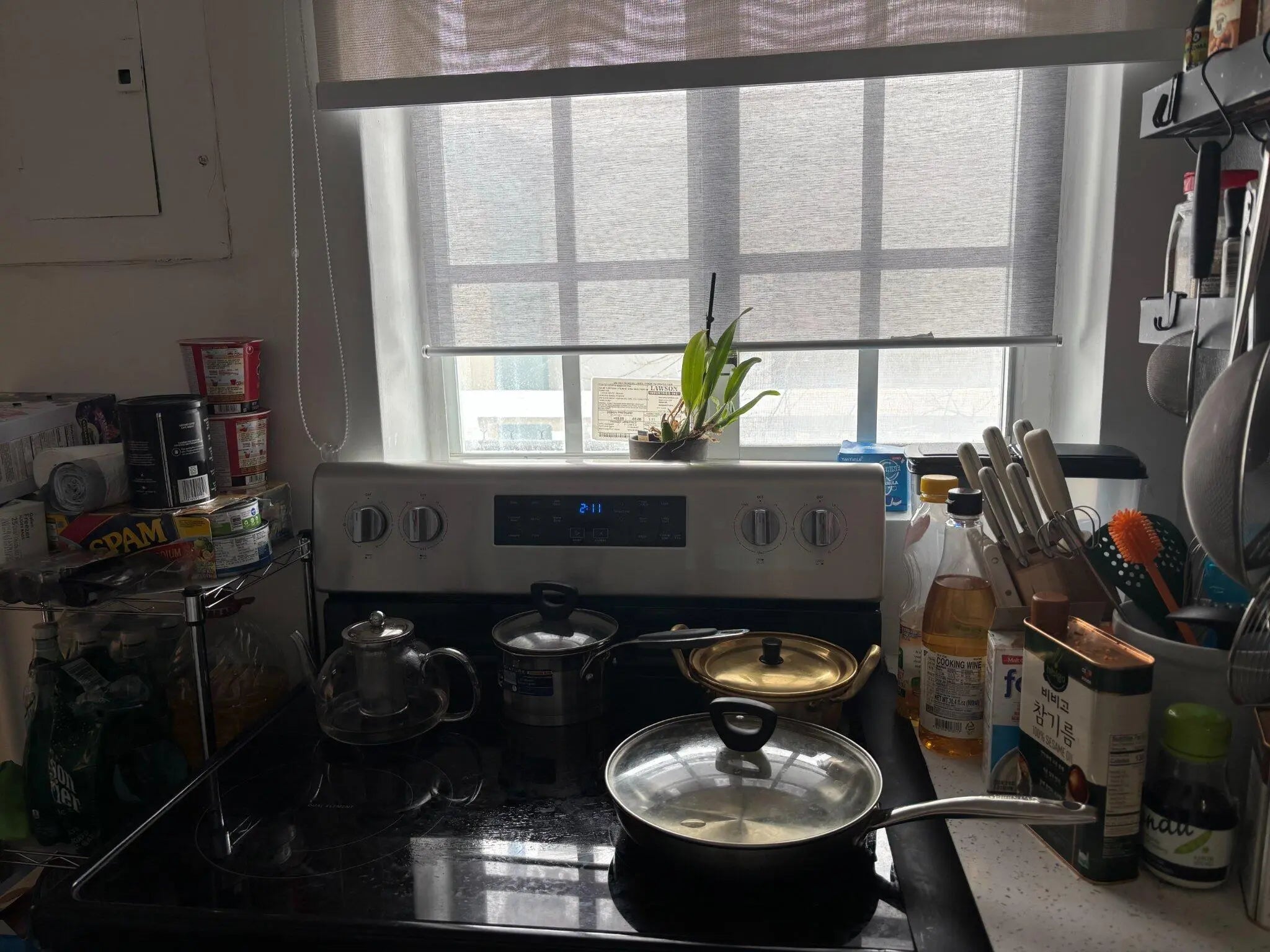 Simple structure and New appliance (Refrigerator and electric range), Cold washer and Microwave oven and portable desk dishwasher connected to sink faucet. New kitchen cable and marble counter.