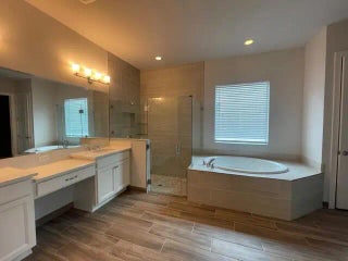 Sprawling beautiful 4-bedroom, Office/workspace, 3 full bath, 2+ extended garage with work/storage space. Wood tile floors throughout. Layout designed for everyone to have personal space with 2 bedrooms and full bath on Right side, left side houses the 4th bedroom, separate laundry room and office/work space room and 3rd full bath while the Master suite is placed past the great room overlooking the Pool and fenced yard. Master bath offers walk in shower, double vanities, soaking tub and his and hers walk in closets. High Volume ceilings in all rooms. Enjoy afternoons on the extended patio in your own Pool or at Avenir's Club House and Rec center which will leave you breathless! Pools, tennis, basketball, fire pits, playgrounds - This one is a must see!