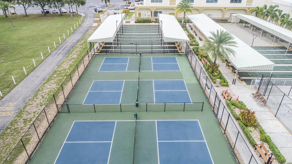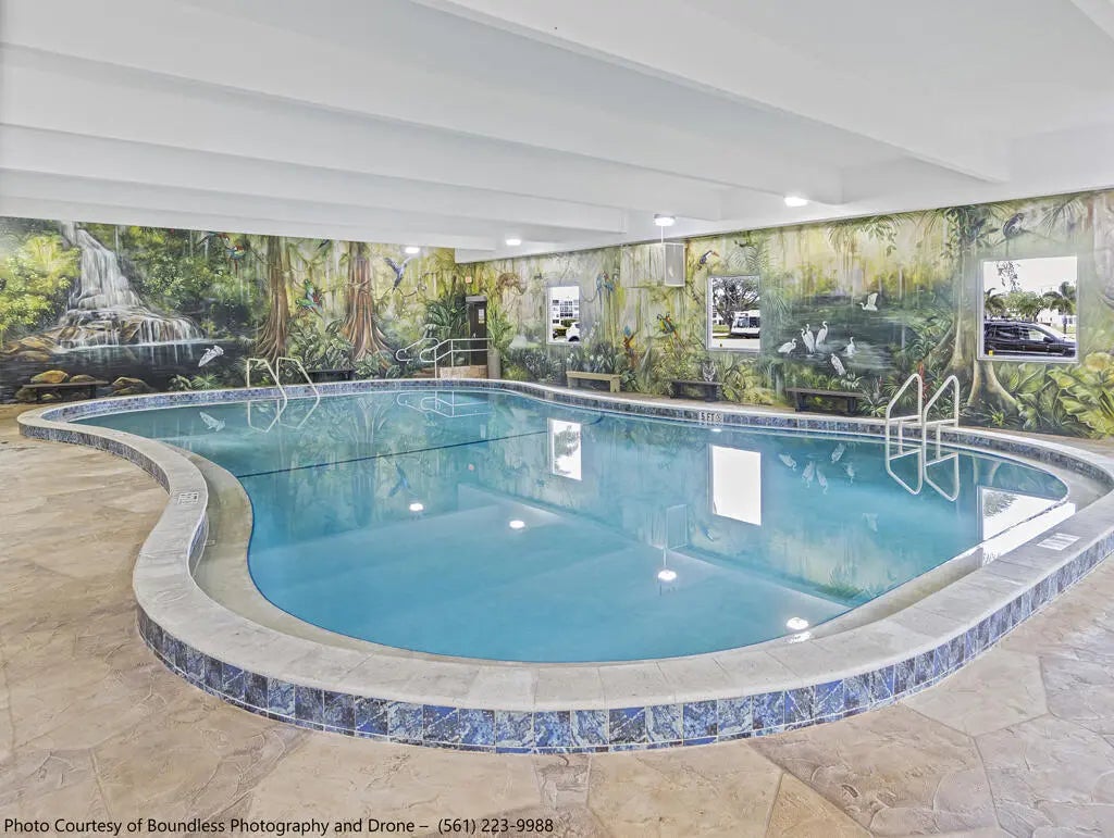 Billiard Room, Fitness Center, Indoor Pool, Sauna, Shuffleboard Court, Tennis Court(s), Workshop Area, Bocce Ball, Courtesy Bus, Heated Pool, Library, Pickleball Court(s), Gated, Security