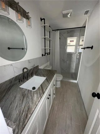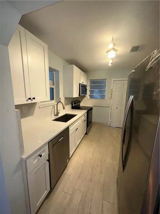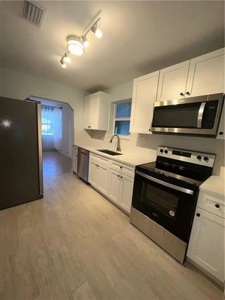 Cute as a button, recently remodeled and located in the heart of Vero! This charming 2bd apartment provides for very comfortable and stylish living. All newer appliances, new kitchen with quartz counters and remodeled bathrooms, private laundry with full size washer and dryer. All hurricane rated windows and metal roof for peace of mind and energy efficiency and new ac system for worry free comfort. Back yard and porch to enjoy outdoors. Sizes approx. Pet weight limit 25lb, no cats.