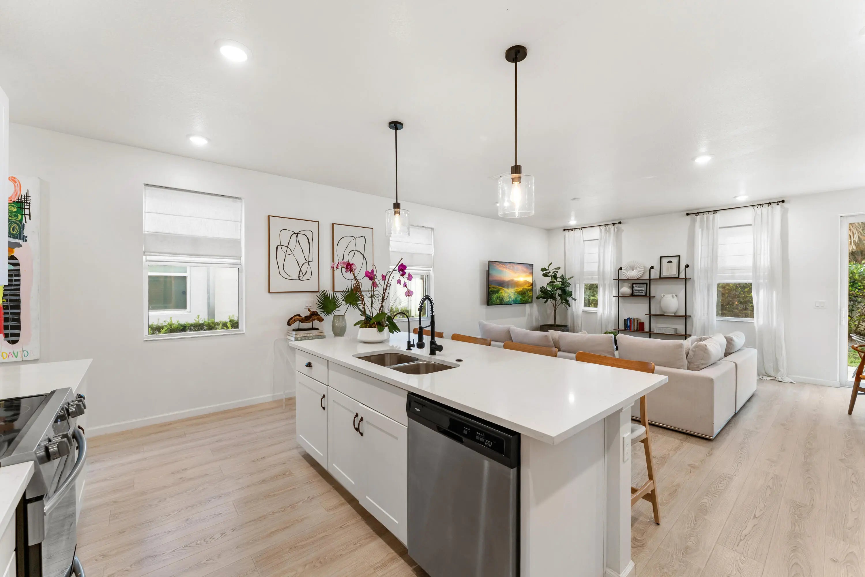 Sophisticated and modern, this 3-bed, 2.5-bath end-unit townhouse in the gated Enclave at Mangonia Park delivers ultimate comfort! The two-story residence welcomes you with high ceilings, abundant natural light, and a seamless open-concept design. The chef-inspired kitchen features stainless steel appliances, sleek countertops, and a pendant-lit island. Upstairs, a versatile loft with a built-in beverage cooler serves as a tranquil retreat. Your primary suite possesses a refreshing ensuite, while the secondary bedrooms share a pass-through bath. A laundry nook and attached 2-car garage add to its functionality. With interstate, the Tri-Rail station, shops, dining, and downtown West Palm just a short distance away, this home offers a relaxing urban lifestyle. Seize the opportunity today!