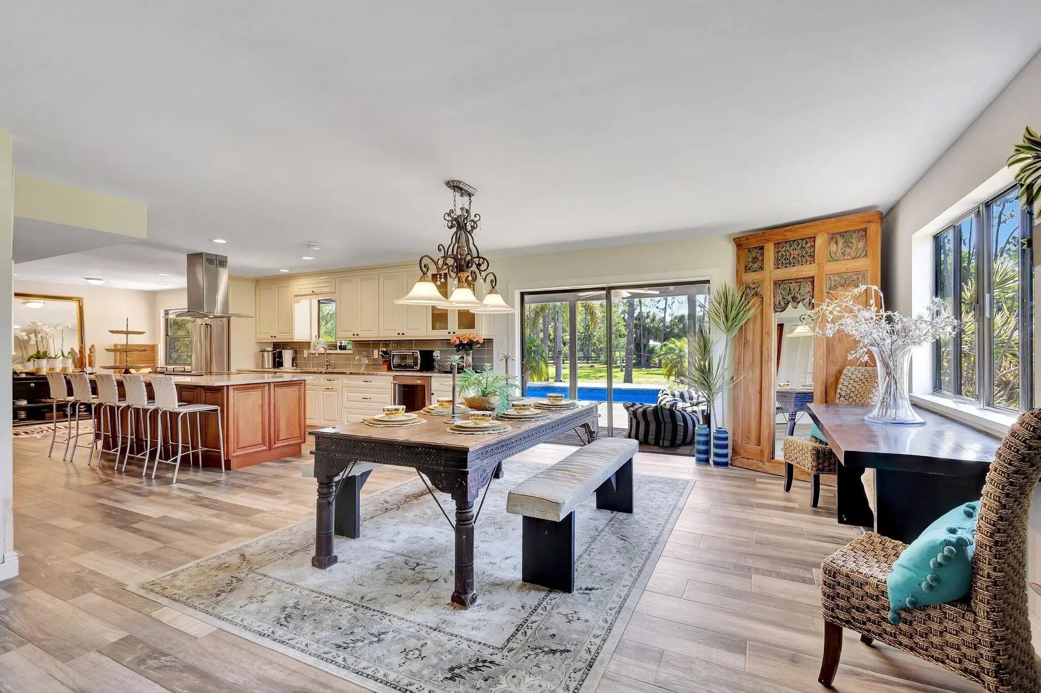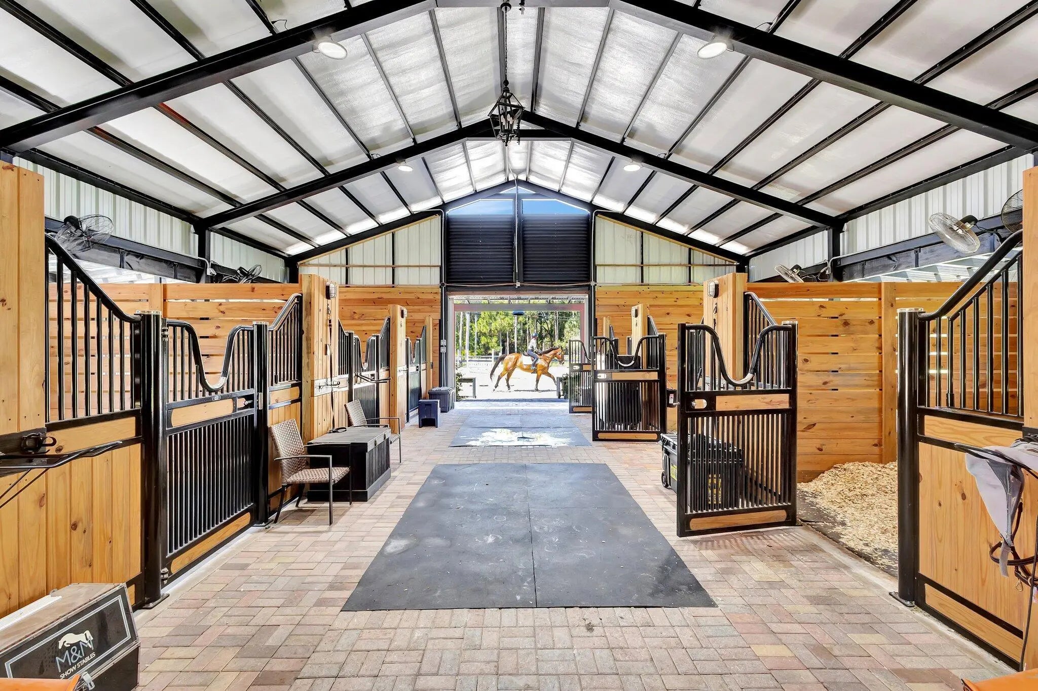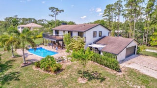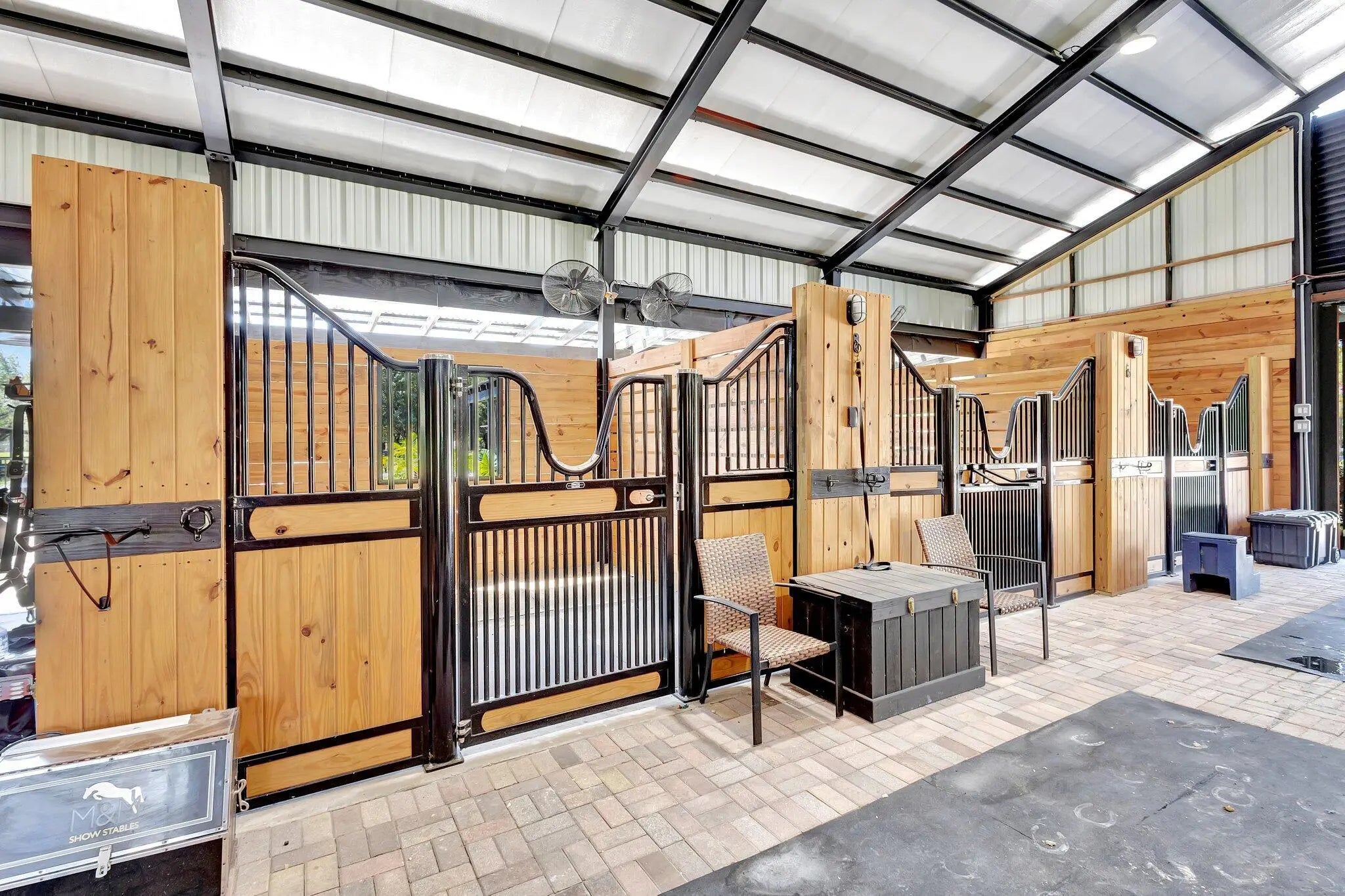 Discover peaceful country living on 5 serene acres in this stunning 5-bedroom, 3.5-bath estate home. Enjoy a bright, open layout with fresh neutral tones, abundant natural light, and beautiful tile-like wood flooring throughout. The spacious kitchen is ideal for creating lasting family memories. Unwind in the luxurious primary suite featuring a sitting area and private balcony with breathtaking views of the barn, pond, paddocks, and sparkling pool. Relax on the expansive patio surrounded by Florida's lush landscape. For equestrian enthusiasts, the 7-stall barn might be available. This home is nestled in a prestigious 24-hour manned gated community, conveniently located near top-rated schools, shopping, and major highways. Live the Florida estate lifestyle you've been dreaming of.