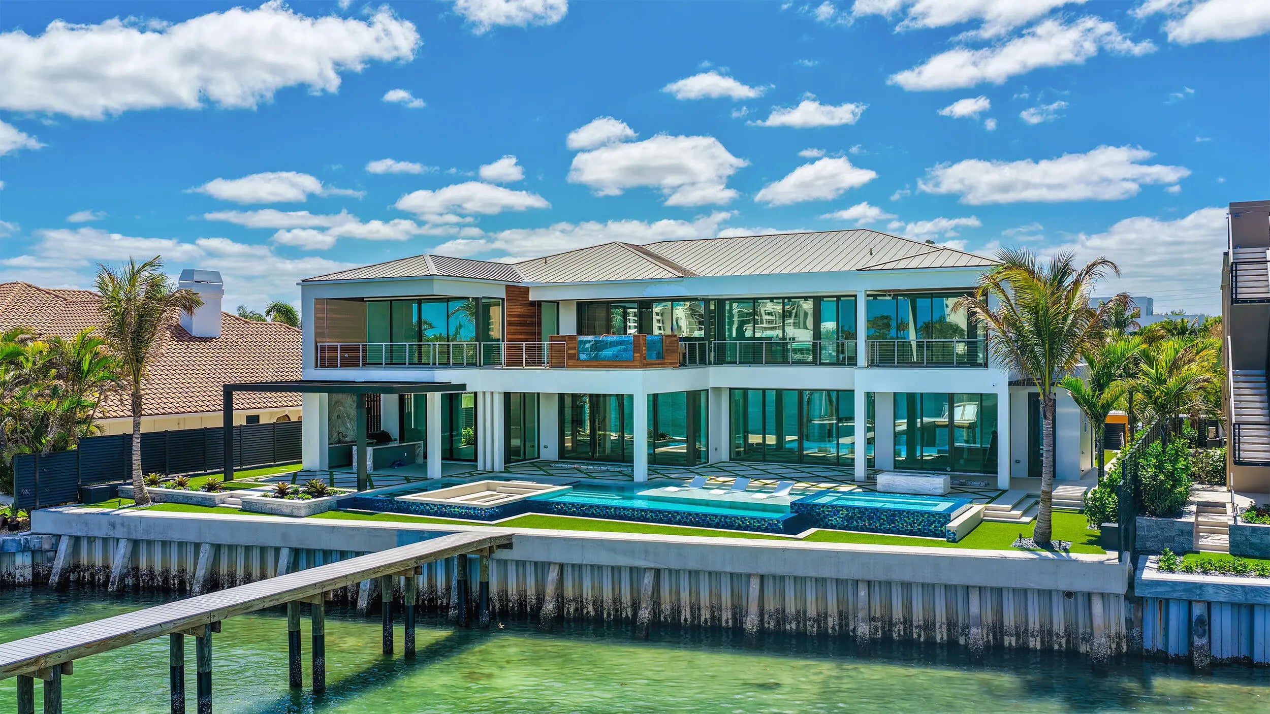 Built by award-winning High Tide Waterfront Properties on Jupiter's iconic Bahamian-blue Intracoastal, this brand-new residence delivers a true sense of arrival with standout design and thoughtful execution throughout. From the moment you enter, your eye is drawn through the home to the beautiful blue water views beyond, setting the tone for the living experience inside. Expansive living spaces are finished with high-end materials and meticulous attention to detail. High Tide is known for thoughtfully building homes that make the experience of living in them unmatched, and this property is no exception. Designed for entertaining, the backyard features multiple fire pits, a fully equipped outdoor kitchen, a waterfall feature, and inviting spaces to gather and relax along the water, creating an atmosphere that draws friends and family in. The chef's kitchen is outfitted with top-of-the-line appliances and designed to seamlessly connect to the home's main living and entertaining areas, including a club room ideal for hosting. Both first and second floor primary suites offer flexibility and privacy, while the second-floor balcony showcases a hot tub with sweeping Intracoastal views. Complete with a 32,000-pound boat lift and direct ocean access with no fixed bridges, this property delivers the ultimate Jupiter waterfront lifestyle. There is simply too much to capture in words—this is a home that must be experienced in person to fully appreciate.