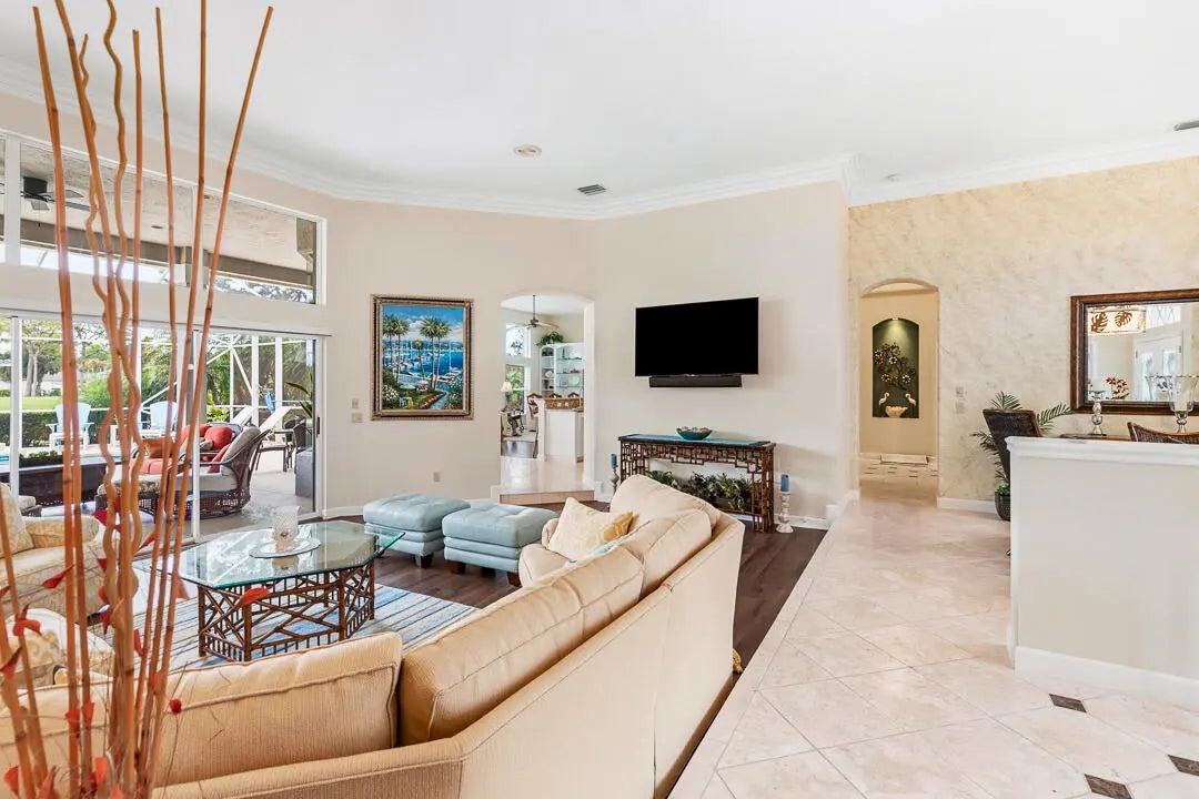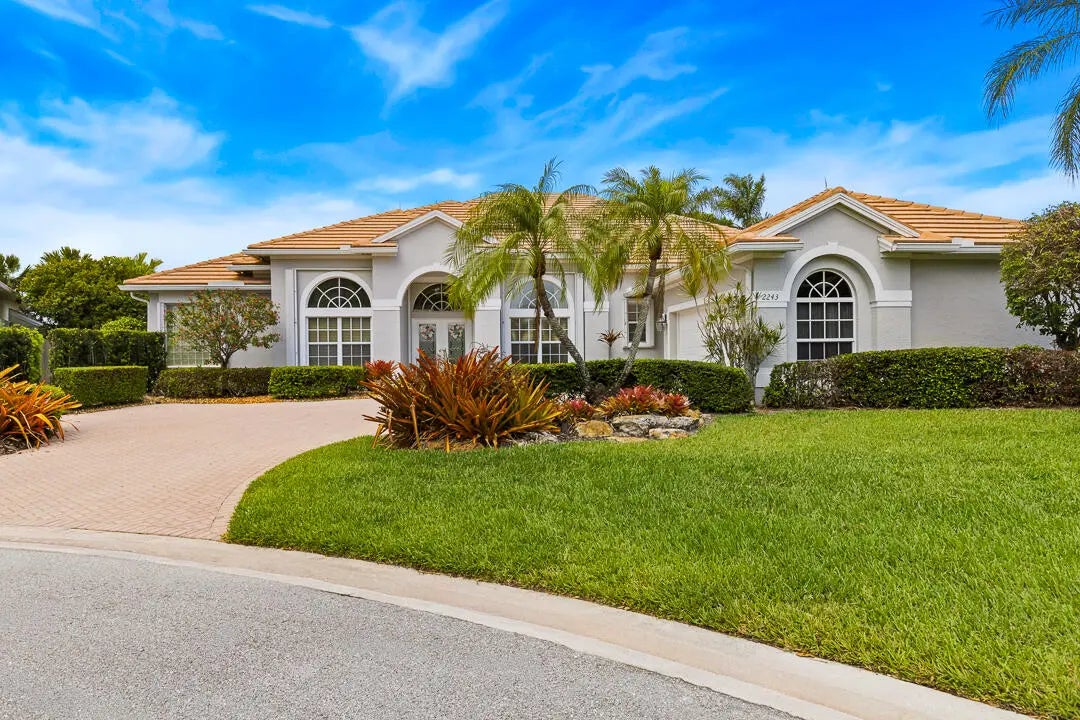 New in Monarch Country Club this elegant custom estate home offers breathtaking views of the water, and golf course located on one of the most desirable lots in the community. The wide open floorplan features large, bright rooms with walls of glass, volume ceilings, stone floors, gorgeous crown moldings & many more of the fine features you have come to expect. The recently remodeled kitchen offers propane cooking, plenty of cabinets, large pantry & a breakfast area flooded with natural light. The oversized primary suite has a lovely sitting area, 2 remodeled baths & plenty of storage w/two walk-in closets and custom built-ins. This home is scheduled for fresh exterior paint April 26th. Other features include large bedrooms, updated baths, den or poss 4th bedroom, cabana bath, custom window treatments, new pool heater & pump, custom closet built-ins and large guest rooms. The low HOA fees cover lawn care, exterior painting, pressure washing, internet, and 24-hr security. Optional memberships offer golf, tennis, dining, fitness, and a resort-style pool. Located near top-rated Martin County "A" rated schools, sparkling Hutchinson Island beaches, world-class boating & fishing, parks and hiking trails, as well as delicious restaurants, boutique shopping & live theater in award-winning Downtown Stuart. Enjoy an easy commute to I-95, The FL Turnpike, Stuart private airport and Palm Beach Int'l Airport.
