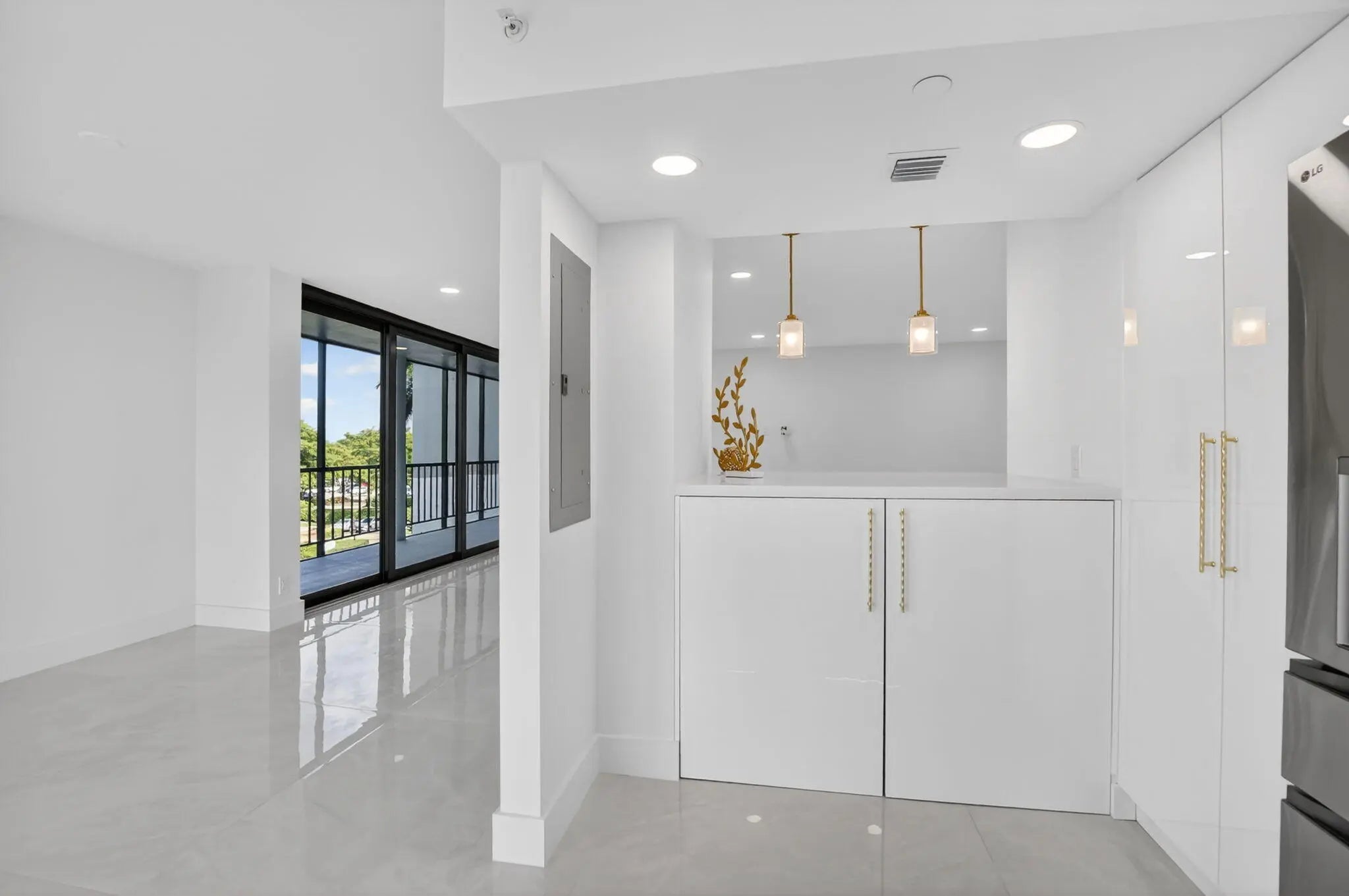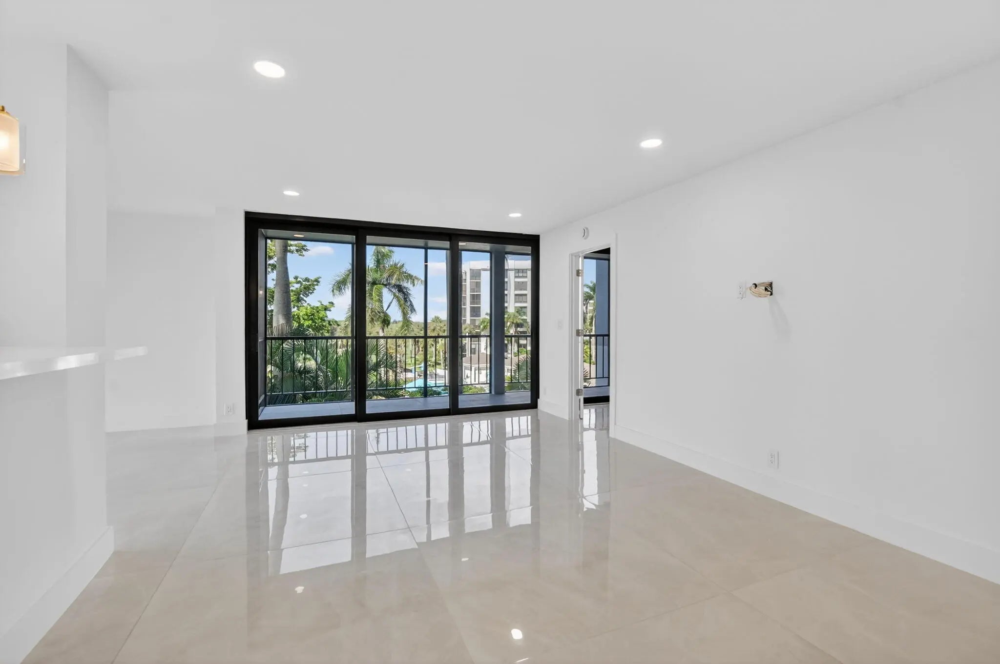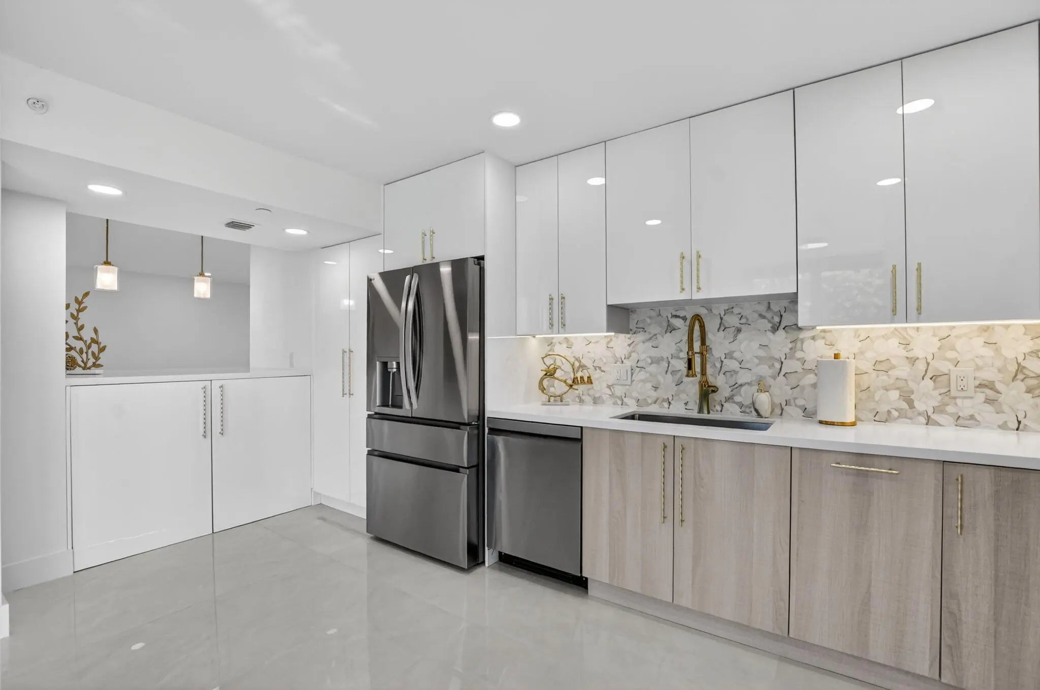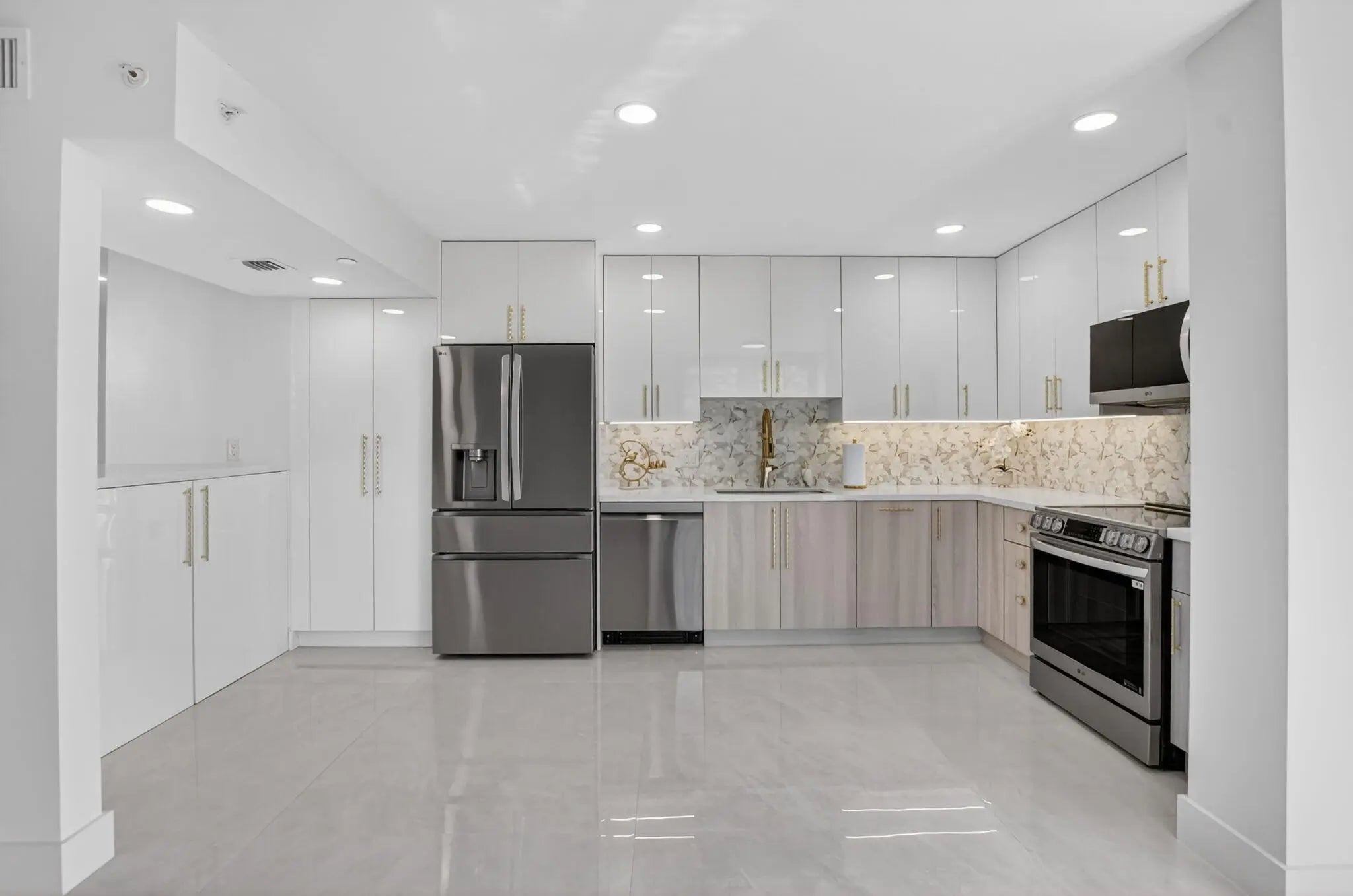 Beautiful completely renovated corner 4th floor Midrise Condominium apt surrounded by spectacular golf course and lake views. Small patio glassed in and opened to the living areas. Custom upgraded finishes throughout. Property includes high-end impact windows and sliding glass doors. Custom closets with full-wall mirror. Large 40x40 Padron porcelain tile throughout. All new top end appliances. New water heater and A/C system. New electrical panel. Keyless entry system. Large pantry. Washer & dryer ready. Long outdoor patio. The modern clean-lined interior features LED high hats, LED mirrors, mirrored doors and pendant lighting over the bar area. Kitchen is finished with designer backsplash, under-counter lighting The bar area is complete with a wine cooler. All rooms Hotwire ready.