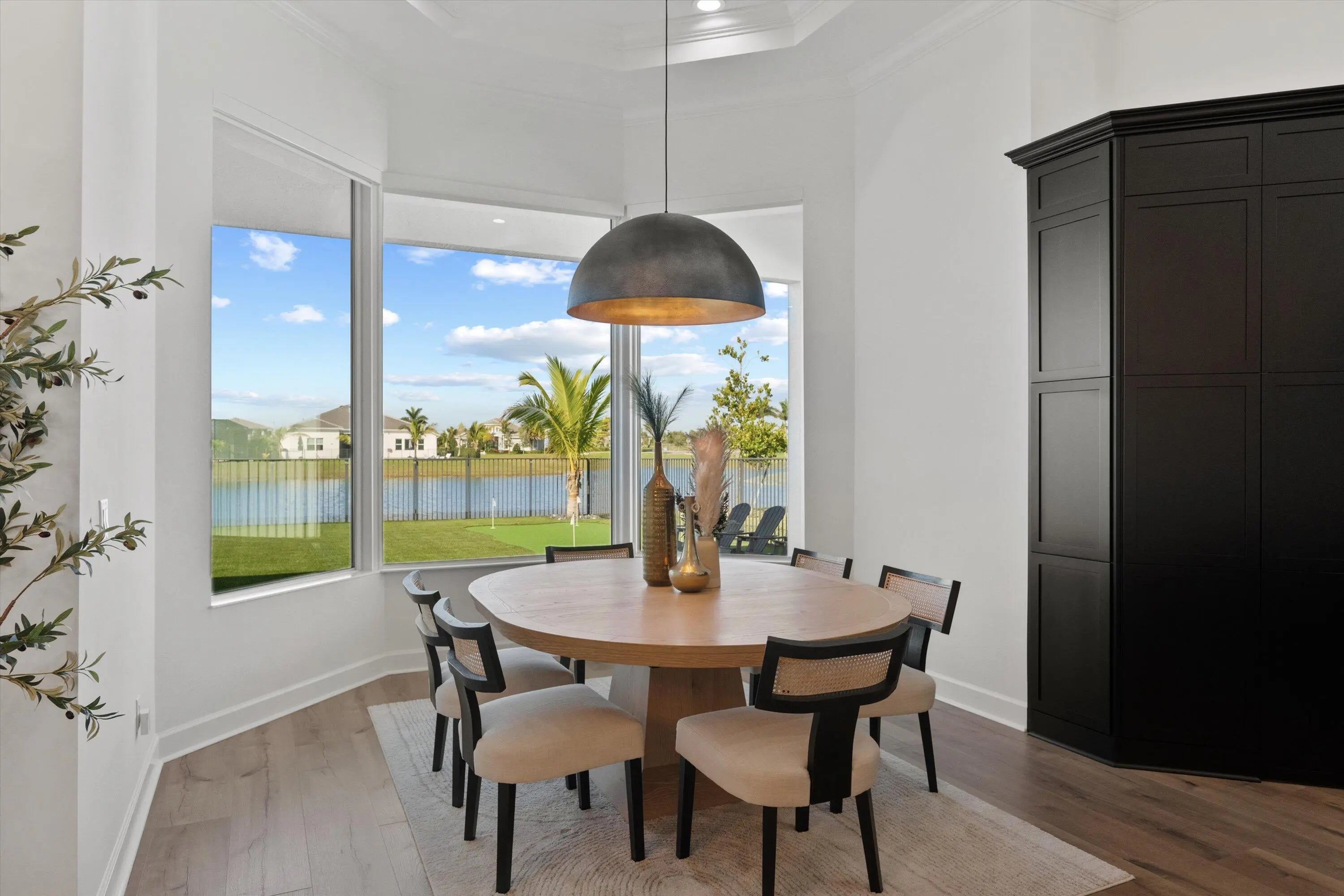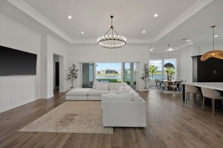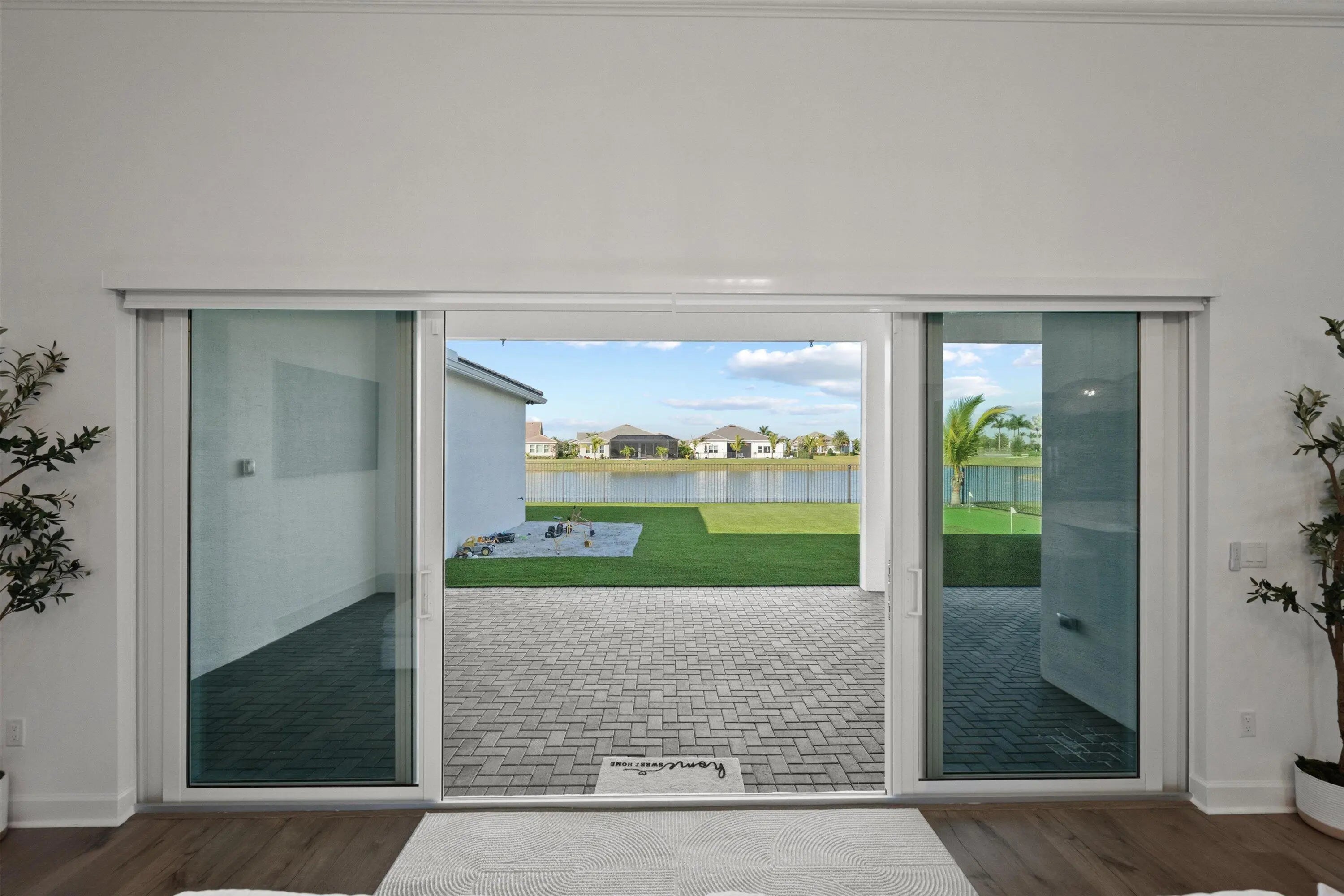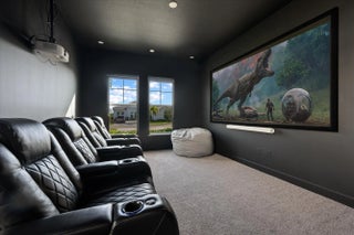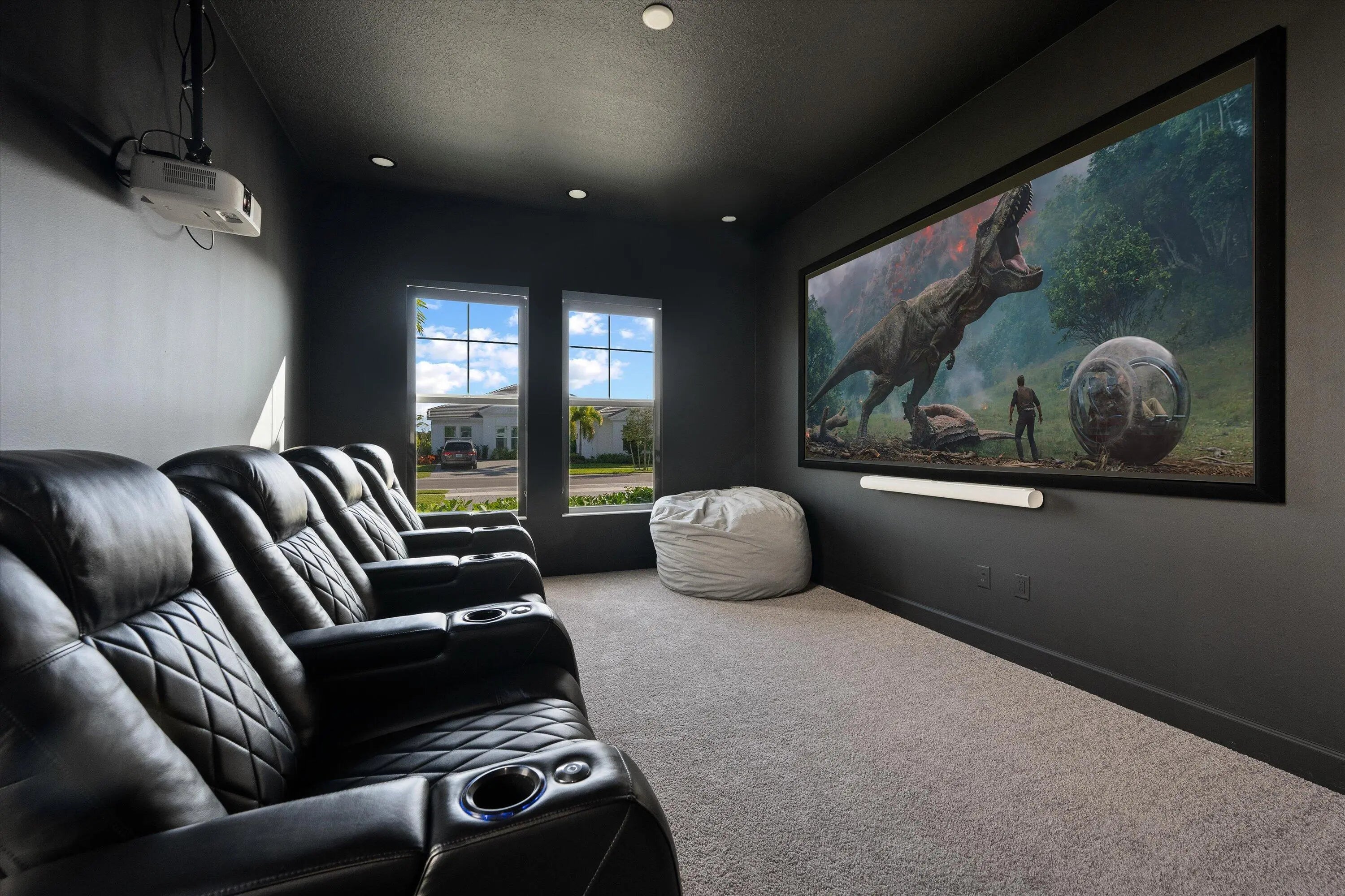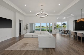 Introducing the magnificent Jupiter Grand Model in the highly sought-after Estates Community of Westlake! This exceptional residence boasts an impressive 6 bedrooms and 4.5 baths, artfully designed to encapsulate luxury living. From the curb, the home's majestic presence is evident with its extended driveway and pathway leading elegantly to the backyard oasis. Step through the luxurious black French doors into a 17'4'' tray ceiling foyer, a masterpiece featuring sleek board and batten design adorned in sophisticated black, complemented by a chic ceiling light fixture. The main areas of this home are graced with stunning wood laminate flooring, providing an elegant warmth and cohesion throughout. The heart of the home, the kitchen, will leave you breathless. With towering 12 to 13-foot ceilings, it showcases black shaker soft-close cabinets accented by striking gold hardware, black plumbing and exquisite white sparkle quartz countertops. The substantial island with a 3" slab accommodates up to seven comfortably, surrounded by additional cabinetry for optimal storage. Enhancing your culinary experience are top-of-the-line stainless steel appliances, including a French door refrigerator, a decorative pantry panel and custom-built closet storage. The herringbone black backsplash paired with black plumbing fixtures brings a touch of sophistication, while two eye-catching rattan light fixtures artfully illuminate the space. Adjacent to the kitchen, the dining area is a visual delight with a stunning bay window complete with roller shades, offering breathtaking views of the lake and unforgettable sunsets, all beneath a pendant light fitting. Nearby, the expansive great room (21'2 x 22) beckons with its impact glass sliders and roller shades, ideal for seamless indoor-outdoor living and is adorned with a magnificent chandelier. Retreat to the master suite, a peaceful haven featuring plush carpeting and panoramic lake views. Its ample dimensions (16 x 16'11) are accentuated by a trio of windows, anchored by a picturesque middle pane, complete with blackout shades and a stylish ceiling fan. Relish in the lavish master bath, showcasing a double showerhead, marble-like wall tiles with sleek black hardware, and an open glass enclosure concept that redefines relaxation. The elegant light wood shaker cabinets, soft closing with sparkling white quartz countertops, provide quaint sophistication alongside two generous custom walk-in closets. The additional bedrooms in this illustrious dwelling have been thoughtfully designed with comforts in mind. Plush carpeting, blackout blinds, custom closets and an array of Jack and Jill style bathrooms. No detail has been overlooked, from the freestanding sinks, timeless white shaker cabinets with gray quartz tops, contemporary black hardware and chrome plumbing, to the luxurious light gray subway tiles and handy linen closets. Bedroom 4 offers extra space with two closets, high ceilings, and windows equipped with blinds. Bedroom 5's flexibility is its charm, currently fitted as an office with impeccable custom woodwork, easily converted back to a standard guest room. Its adjoining bathroom is a classic symphony of vertically stacked white tiles, complemented by timeless white cabinetry and black hardware. Bedroom 6 offers a unique twist, transformed into a plush theater room with all-black decor and blackout shades, with en-suite facilities echoing the home's sophisticated design language of white cabinets, quartz counters, and wood-like tile flooring. Not to miss are the strategic storage solutions sprinkled throughout the home, including an impressively sized laundry room equipped with a laundry tub, black shaker cabinets, and gold touches. And yes, a convenient powder bath further enhances the functionality and style of this dream home. Additional highlights include a mini-split A/C system in the garage perfect for a home gym, workshop, or climate-controlled storage. The outdoor realm is sheer paradise with a 41x44" covered lanai boasting 12" soaring ceilings to entertain or unwind. The fully fenced backyard features a complete astro-turf transformation for easy maintenance, inclusive of a delightful putting green and sandpit for endless enjoyment. An outdoor built in BBQ setup completes the backyard experience ideal for hosting, grilling, and enjoying Westlake's indoor-outdoor lifestyle. This extraordinary estate offers an unmatched combination of luxury, functionality, and style, making it truly worth a million dollars. Don't miss out on this exclusive opportunity to live in one of Westlake's finest homes schedule your private tour today!