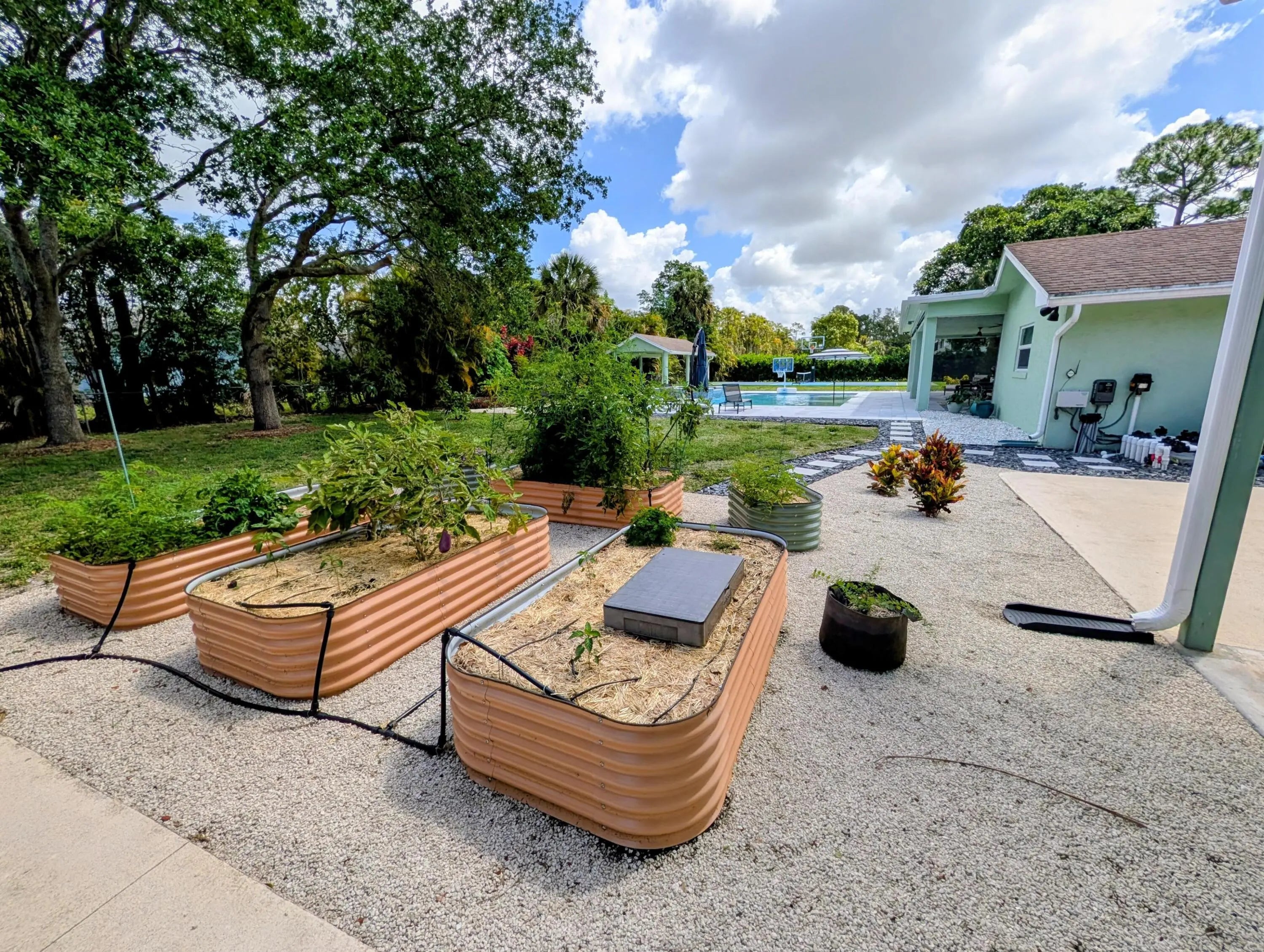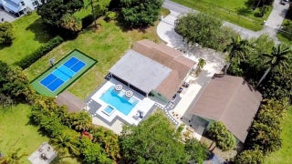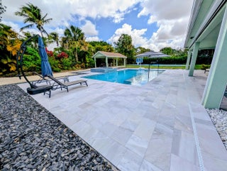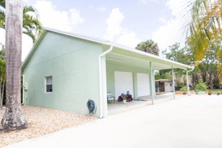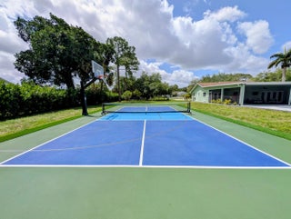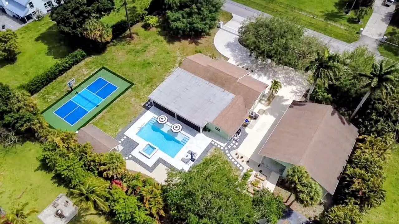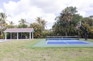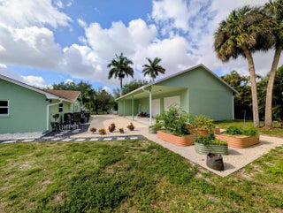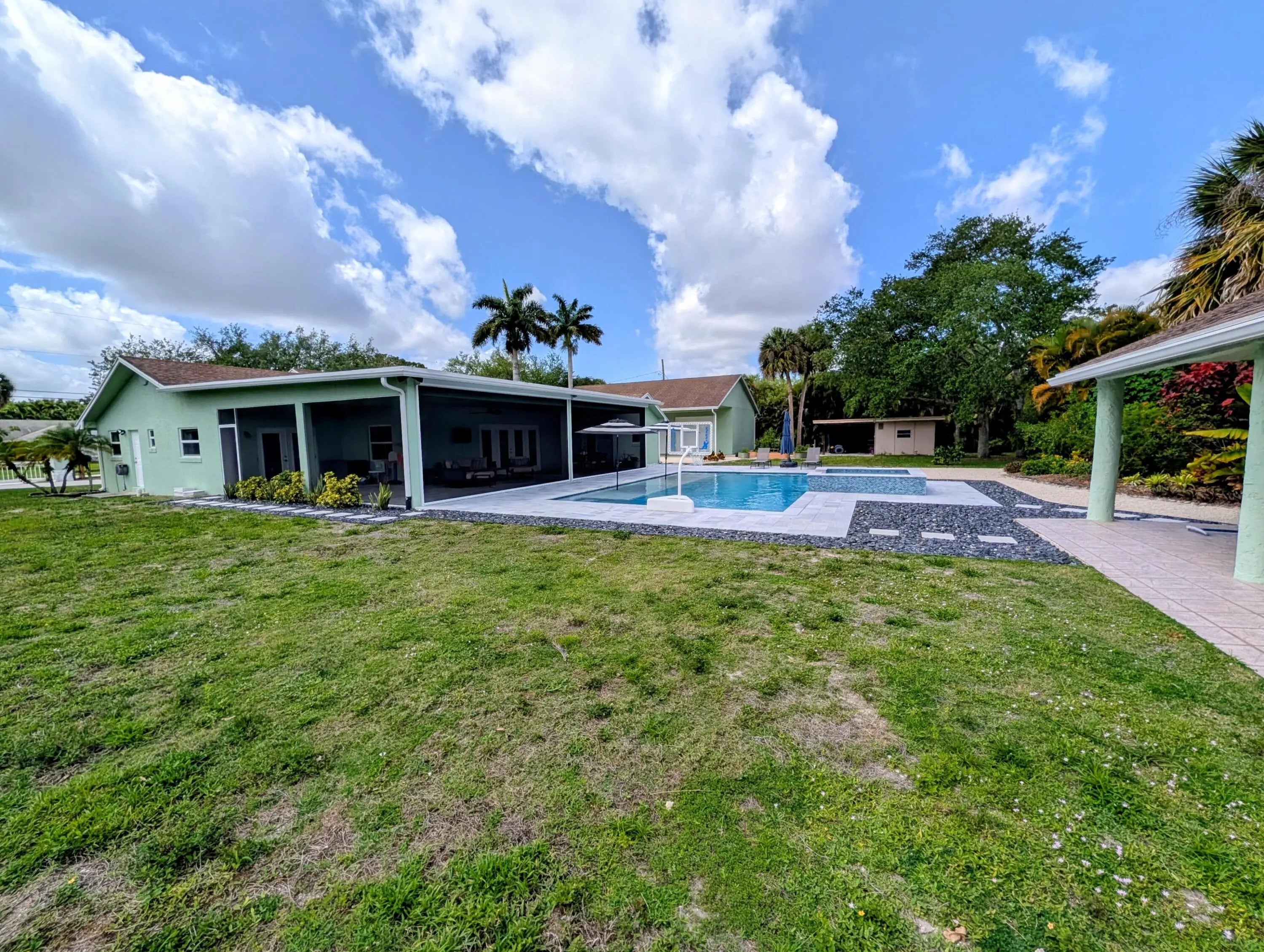 Welcome to your private acre retreat in the highly sought after Palm Beach Ranchettes, one of the few no HOA communities with spacious properties just minutes from everything. This property features a resort style backyard with a brand new saltwater pool and spa, pickleball/basketball court, and private guest building that truly sets it apart. Situated on a fully fenced 1.01 acre lot, the property includes a 3-bedroom, 2-bath main home (2,155 sq ft) with an open living area, spacious kitchen with quartz countertops and a large island, and a split floorplan. The primary suite has a custom walk-in closet, barn door entry, and dual sinks, while the secondary bathroom was fully renovated in 2023. Impact windows and doors throughout provide added comfort and peace of mind. A separate 1,250 sq ft guest house with a large utility garage provides flexibility for guests, extended family, workspace, or creative use. Step outside to a fully screened, oversized L-shaped patio with motorized screens, opening to the custom saltwater sport pool (built in 2024) with marble decking and an above-ground spa, all app-controlled. The property also features a covered pavilion with electric, a professionally installed 30' x 60' pickleball/basketball court, six organic garden beds with irrigation, and a variety of mature fruit trees. Additional highlights include an oversized concrete driveway with room for multiple vehicles, boats, and recreational equipment, all secured by dual electronic gates. Located just minutes from The Mall at Wellington Green, Whole Foods, Trader Joe's, Florida's Turnpike, and A-rated schools, this home gives the rare opportunity to enjoy acreage living with unmatched convenience. This one-of-a-kind property provides a lifestyle that's hard to find in South Florida.
