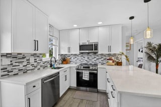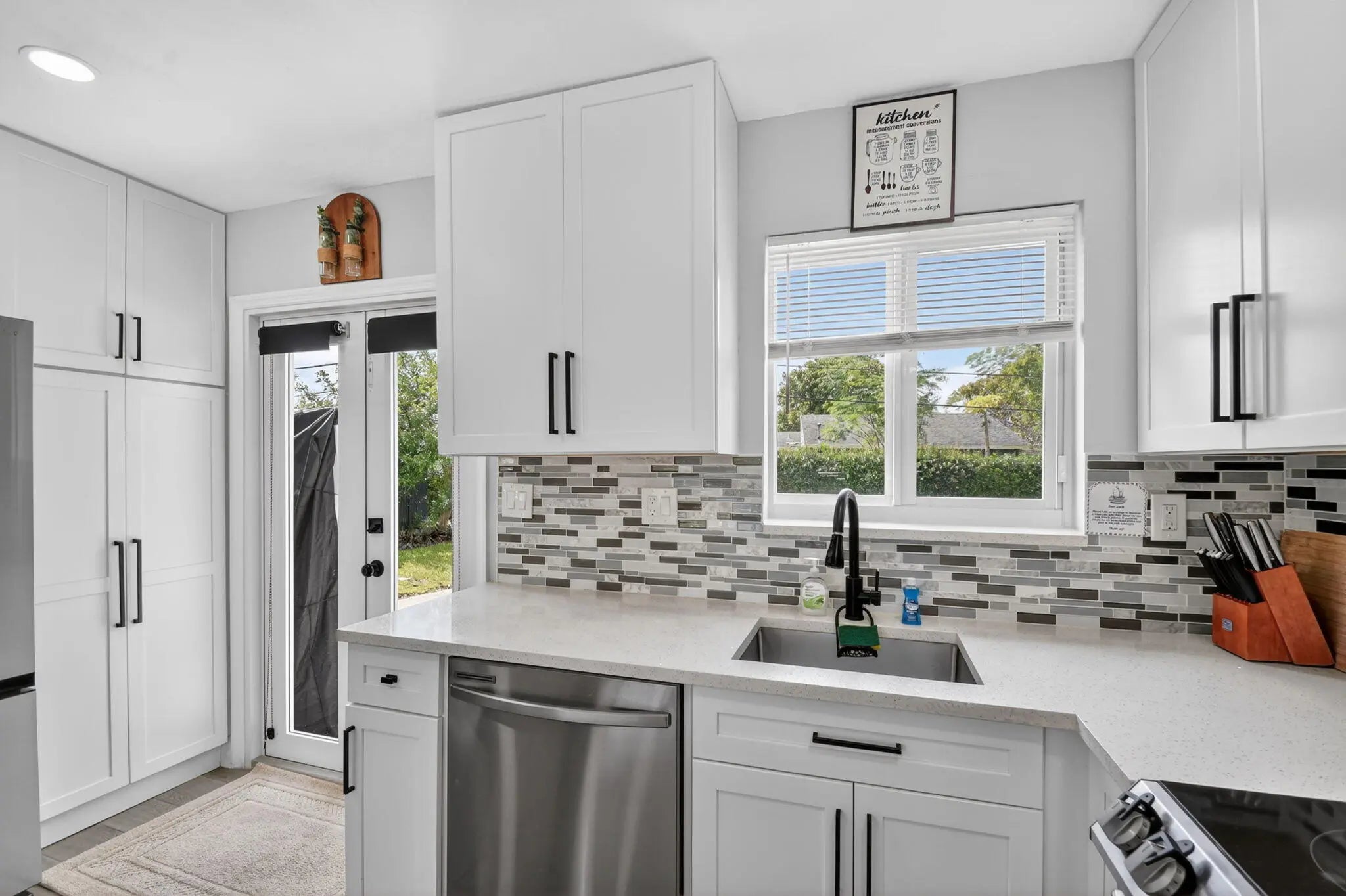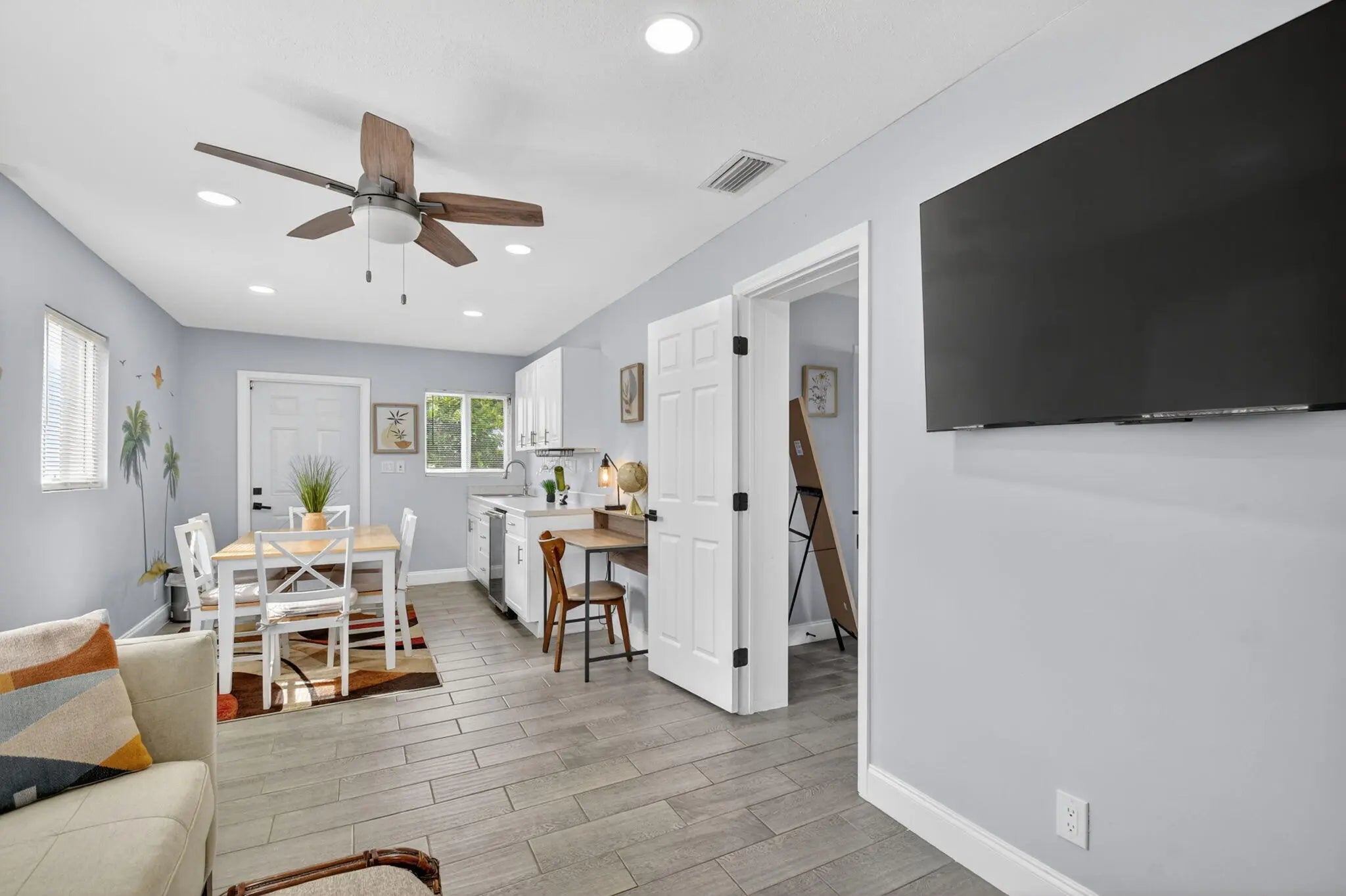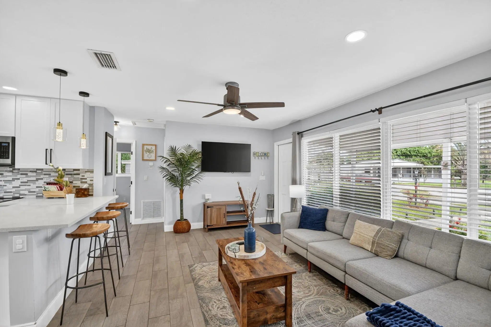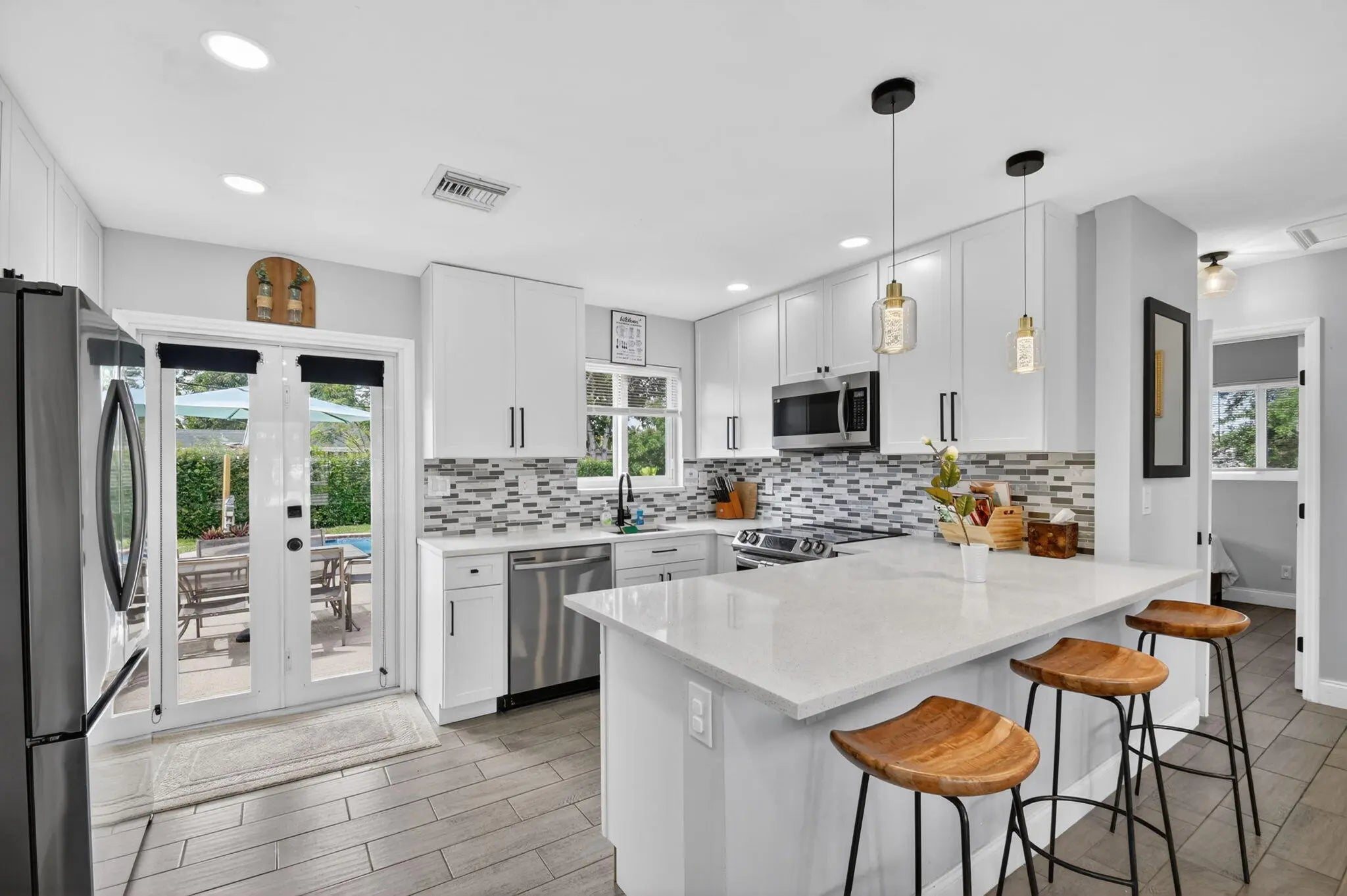 Beautifully renovated 3-bedroom, 2-bath home offering modern finishes and versatile living. The spacious primary suite features a private living area, its own kitchen, and full bath—ideal for guests, extended family, or rental potential. Stylish wood-look tile flooring runs throughout the home. The main kitchen boasts brand-new stainless steel appliances, quartz countertops, custom white shaker cabinetry, and a sleek full glass backsplash. Both bathrooms have been fully updated with floor-to-ceiling tiled showers and glass enclosures. Major updates include A/C, water heater, and electrical panel—all replaced within the last two years. Step outside to your own private oasis featuring a pool, lush landscaping, fire pit, and full privacy fence. Currently operating as a successful Airbnb income property. From front door to backyard, this home delivers a true resort-style experience—don't miss this opportunity!