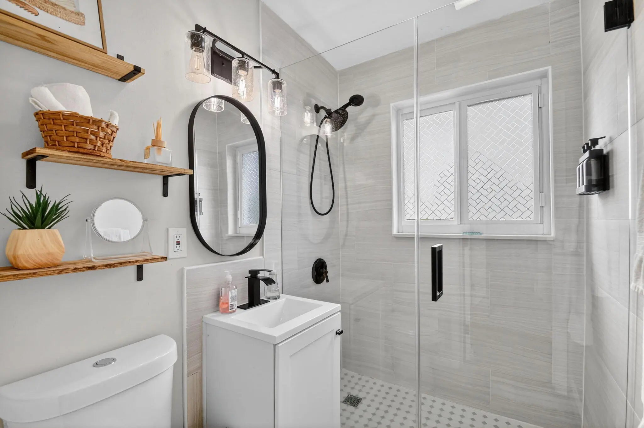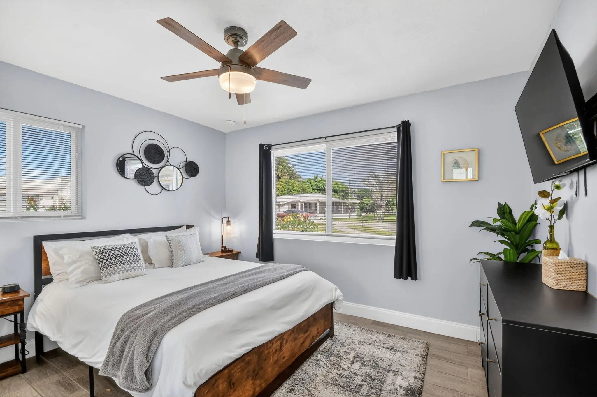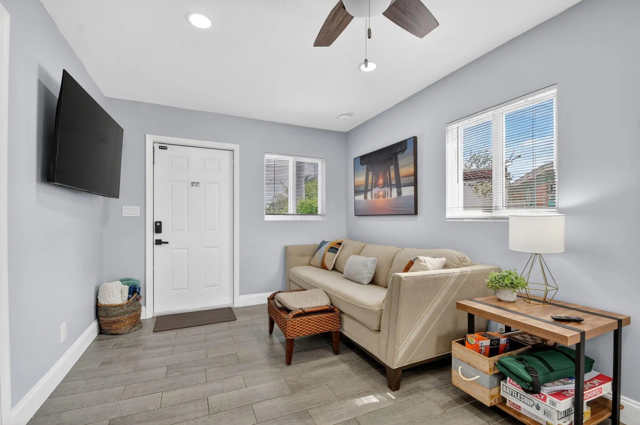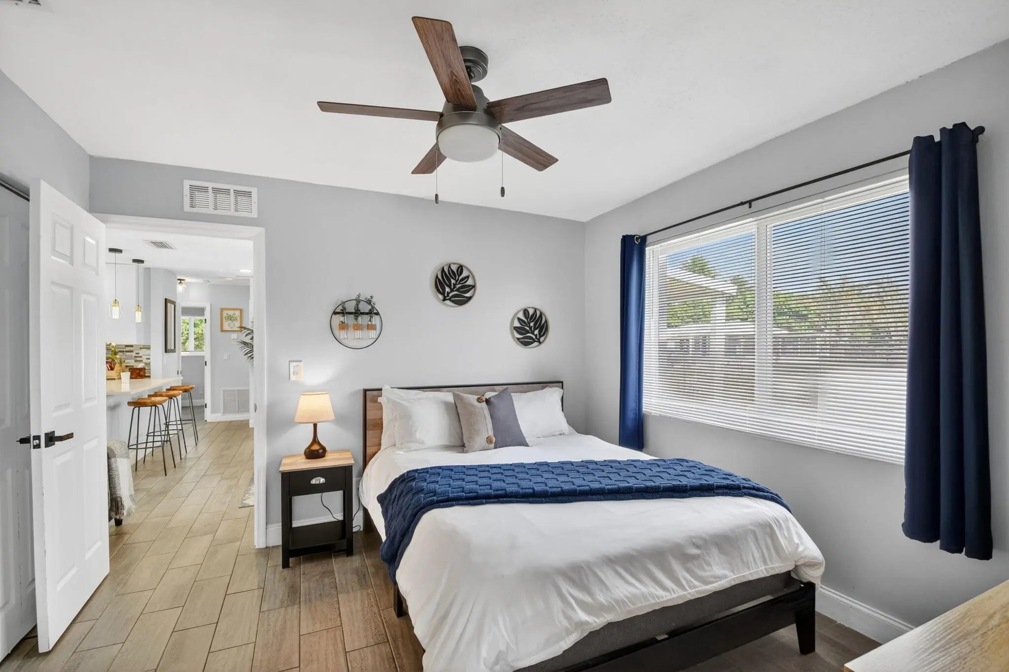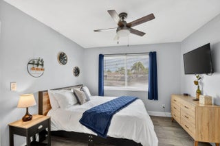 Beautifully renovated 3-bedroom, 2-bath home offering modern finishes and versatile living. The spacious primary suite features a private living area, its own kitchen, and full bath—ideal for guests, extended family, or rental potential. Stylish wood-look tile flooring runs throughout the home. The main kitchen boasts brand-new stainless steel appliances, quartz countertops, custom white shaker cabinetry, and a sleek full glass backsplash. Both bathrooms have been fully updated with floor-to-ceiling tiled showers and glass enclosures. Major updates include A/C, water heater, and electrical panel—all replaced within the last two years. Step outside to your own private oasis featuring a pool, lush landscaping, fire pit, and full privacy fence. Currently operating as a successful Airbnb income property. From front door to backyard, this home delivers a true resort-style experience—don't miss this opportunity!