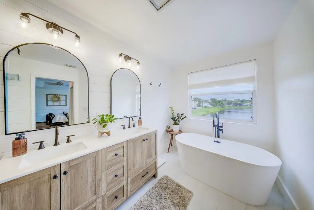 Beautifully updated LAKEFRONT and move-in ready, this 3-bedroom, 2.5-bathroom home with a 2-car garage offers 1,857 square feet of stylish and functional living space. This home has a NEW ROOF and is located in the desirable Nautica Isles, this manned-gated, family-friendly community offers an exceptional lifestyle with resort-style amenities. From the moment you enter, you're welcomed by a bright open foyer with soaring 10-foot ceilings, abundant natural light, and sleek vinyl flooring that flows seamlessly throughout the home. The upgraded kitchen features crisp white countertops, stainless steel appliances, a brand new refrigerator (2026), and a butcher block island with seating for three. A charming bay window nook offers built-in seating with generous storage beneath. Upstairs, the spacious primary suite includes a walk-in closet and a fully upgraded, spa-style bathroom complete with a freestanding soaking tub, walk-in shower, and dual vanity with soft-close cabinetry. Additional features include freshly painted bedrooms (2026), Roman shades for the perfect balance of light and privacy, ceiling fans throughout, a stylish half bath with wood accent wall, and a large-capacity front-load washer and dryer. Major systems have been well maintained, including a 2019 A/C (recently serviced in 2026) and 2019 water heater. Step outside to enjoy your private outdoor retreat, featuring a low-maintenance turf backyard, a porcelain tile sitting area overlooking the lake, and a screened-in patio with a high-speed fan. Ideal for year-round Florida living! The home's exterior was painted in 2018 and is topped with a brand new roof (2025) for added peace of mind. The spacious 2-car garage is a standout, complete with upgraded epoxy flooring, built-in storage, and a custom plank accent wall with industrial hooks. The extended driveway accommodates up to four vehicles. For added security, the home is equipped with a Vivint system and exterior cameras. This home perfectly blends modern upgrades, thoughtful design, and low-maintenance living. The community amenities include a central clubhouse, a swimming pool with sundeck, fitness center, tennis, basketball, and soccer courts, playgrounds, and scenic walking and biking trails. Select sections also offer 24-hour security, adding an extra layer of comfort and peace of mind.