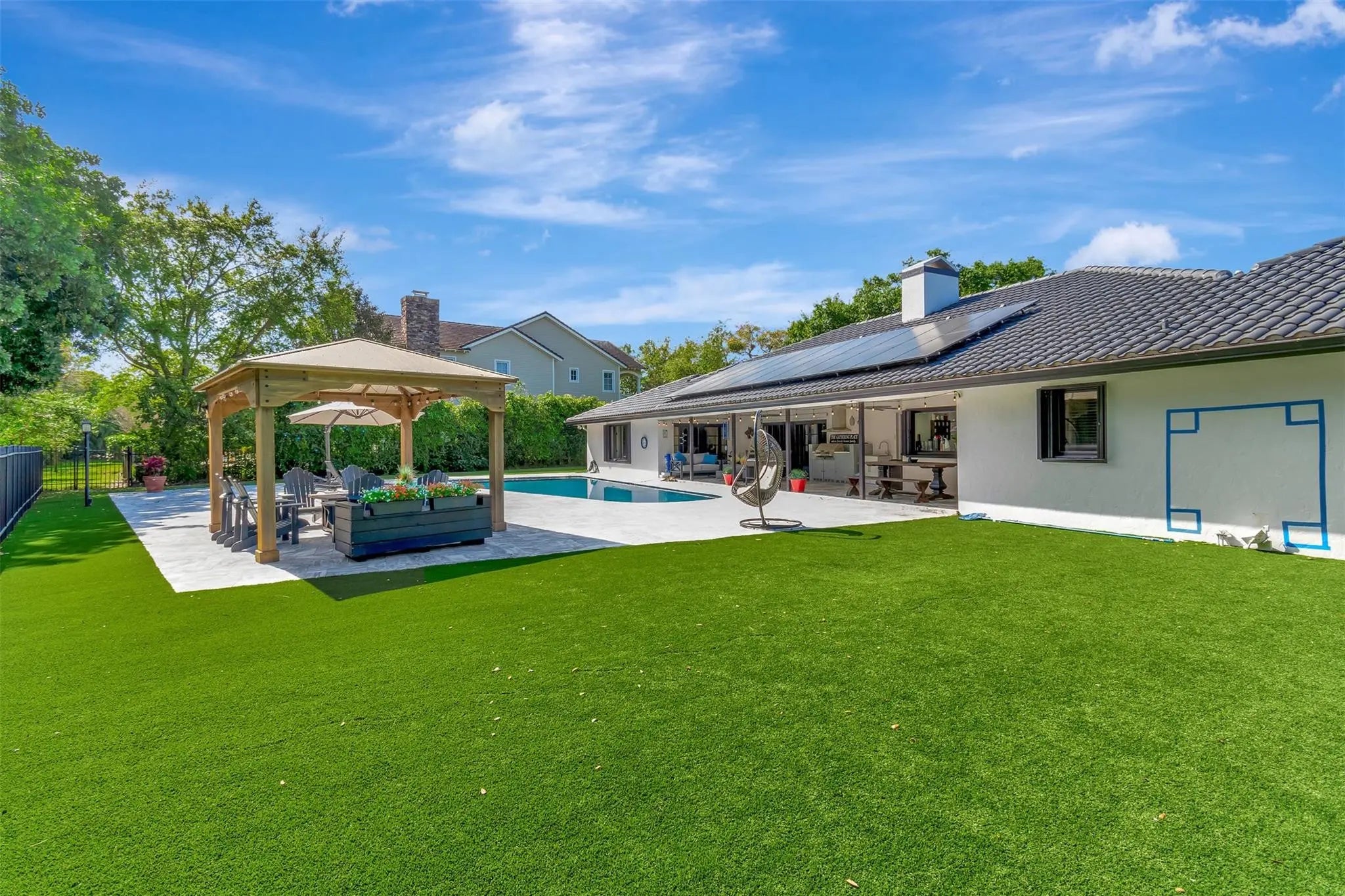 One of the best lots at Prestigious Pine Tree Golf Club - NO membership required! Come enjoy your privacy and views of the golf course! This property sits on a Cul de sac in an expansive 0.60-acre lot in the estate section of man gated Pine Tree community in the heart of Boynton Beach close to some of the best restaurants, shopping and beaches. This estate is a totally upgraded 4 bd /4bth + Den + office,3 CG one was converted as a bd. The renovations are extensive and include a completely redesigned kitchen with high-end Wolf appliances, 3 new AC units,2 new water heaters, solar panels ($29 monthly bill), built in electric BBQ grill, all new electrical, square D electrical panel, travertine tile, saltwater pool large, fenced backyard to entertain & enjoy your day & beautiful sunsets.