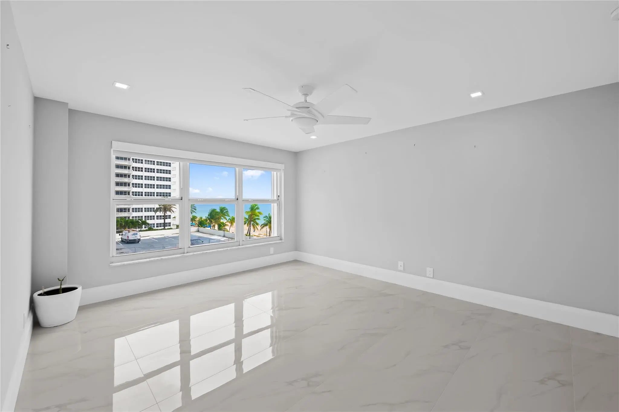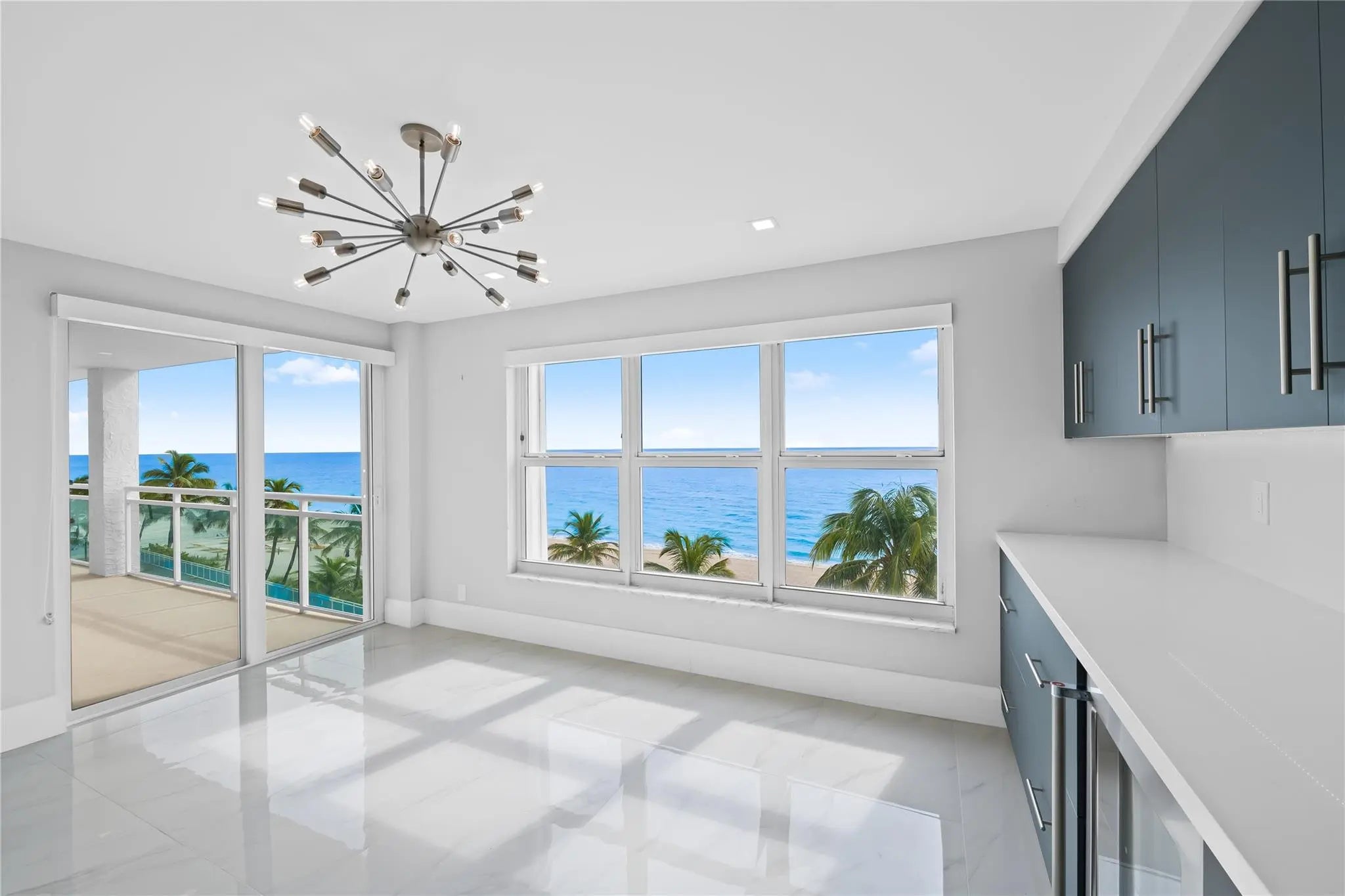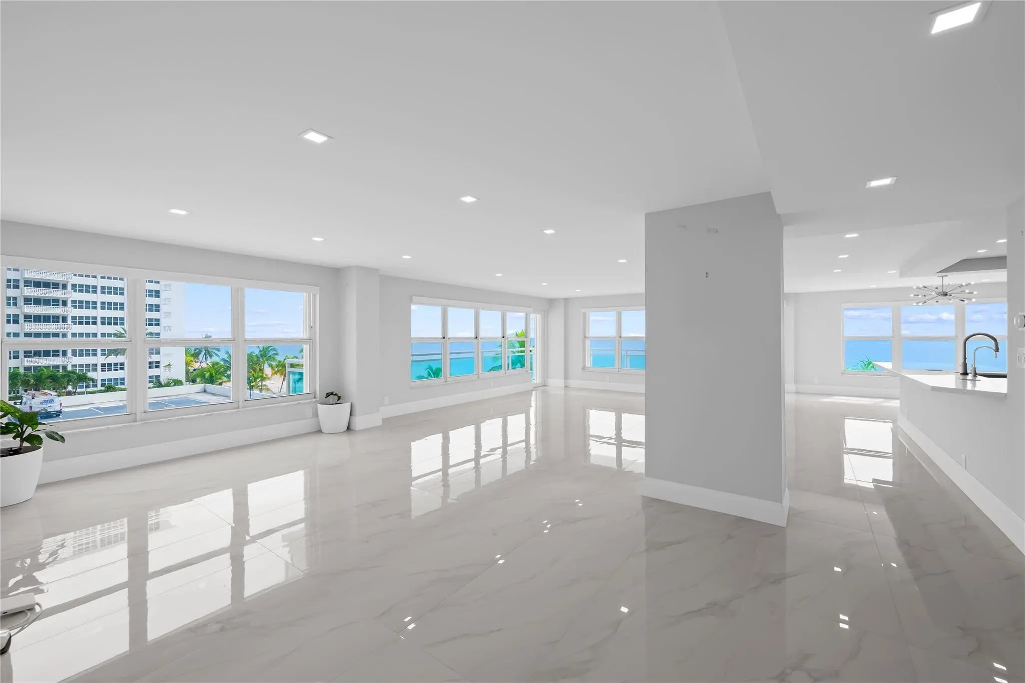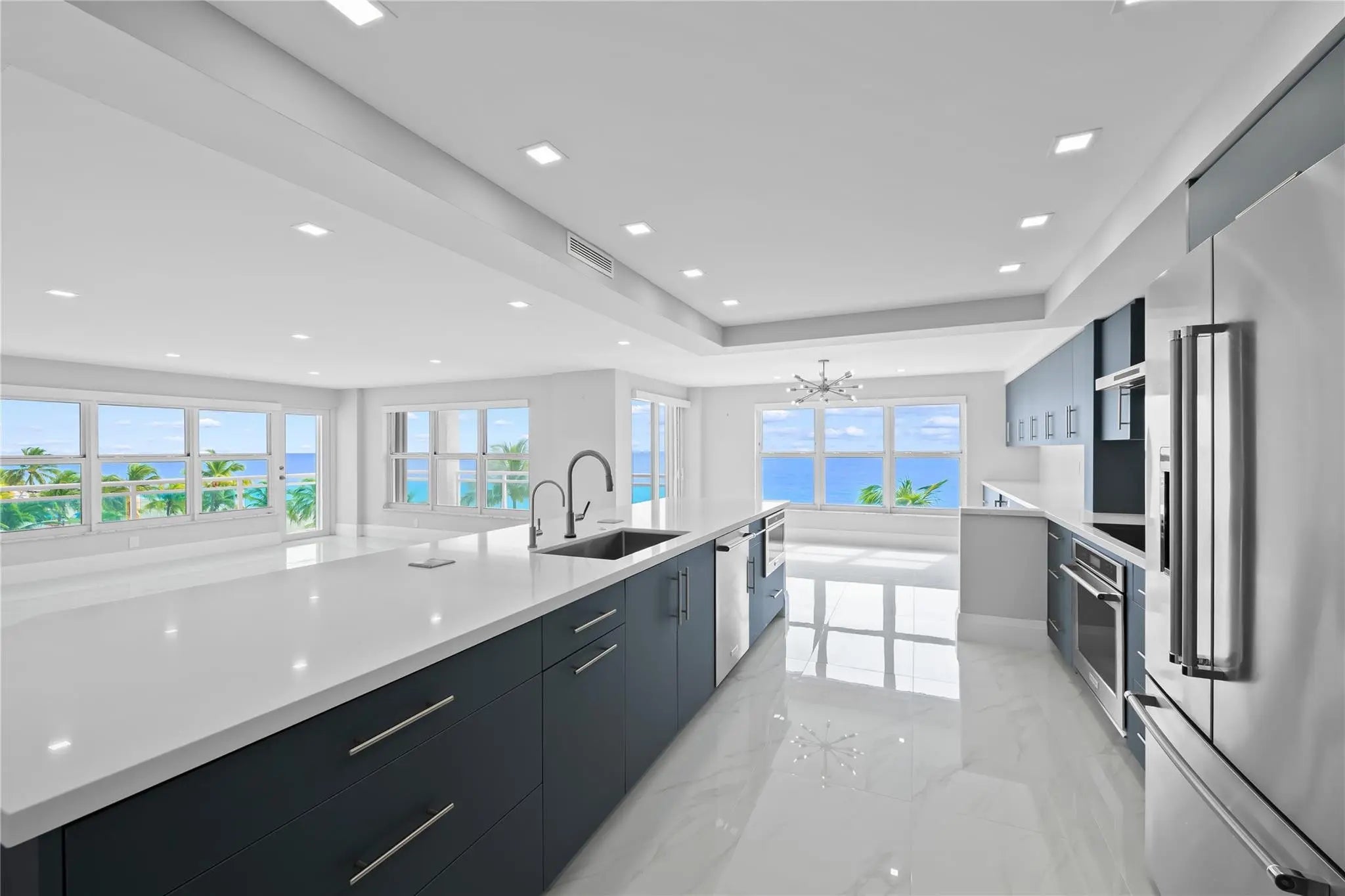 This rarely available turnkey NE corner residence showcases sweeping, unobstructed ocean views from every room. Fully remodeled with premium finishes, the open-concept kitchen is ideal for entertaining, highlighted by elegant tile flooring throughout. Impact-resistant windows and doors—plus an extra slider—maximize light and provide seamless access to the expansive wraparound glass balcony. The primary suite features generous walk-in closets and a spacious double-sink bath with large shower. Added conveniences include a full laundry room with sink, tandem garage parking, and storage. Resort-style amenities offer 3 gyms, a community lounge, heated pool, sundeck, direct beach access, bike storage & more—steps to cafés, shops, and worship.