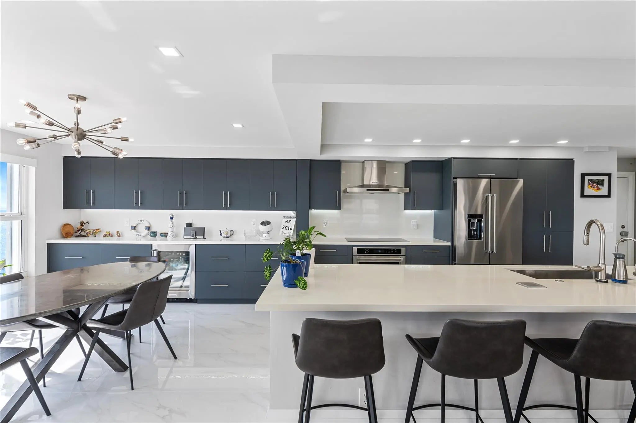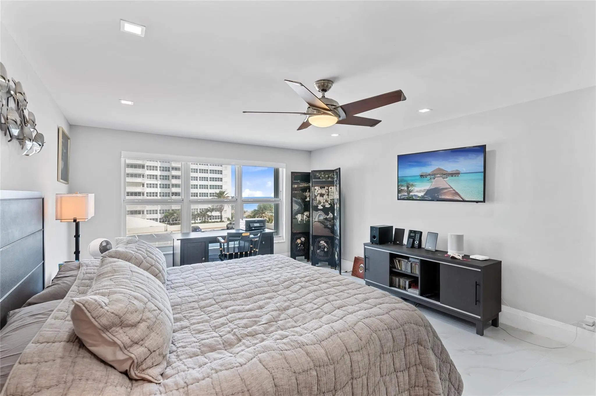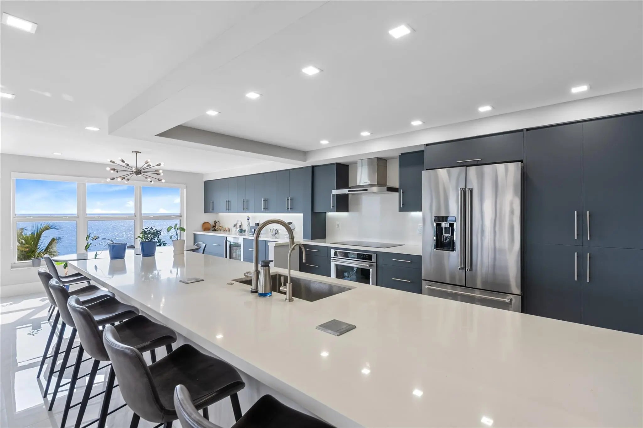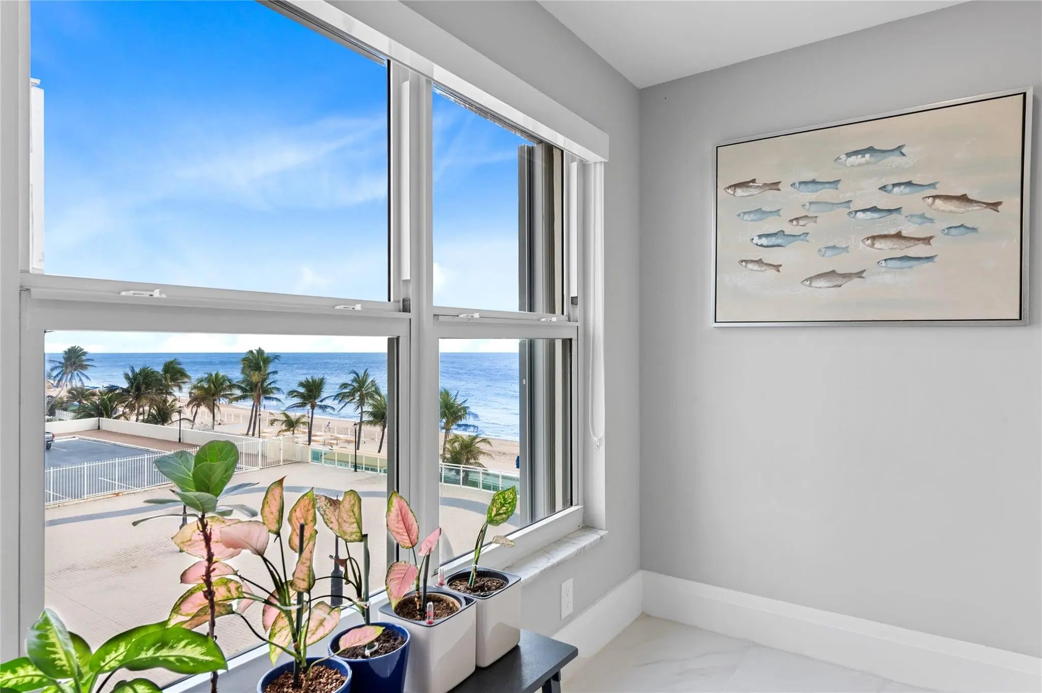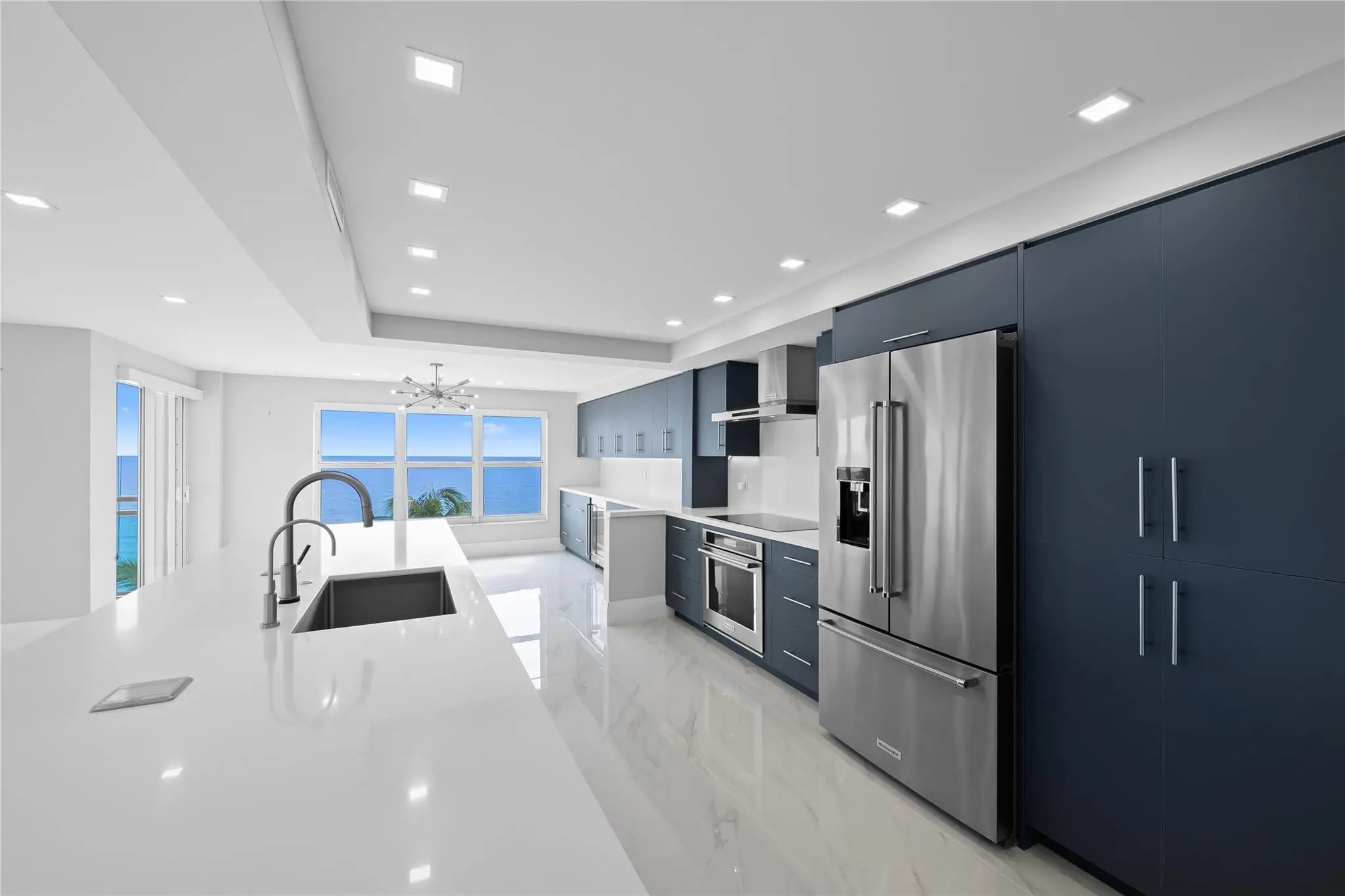 This rarely available turnkey NE corner residence showcases sweeping, unobstructed ocean views from every room. Fully remodeled with premium finishes, the open-concept kitchen is ideal for entertaining, highlighted by elegant tile flooring throughout. Impact-resistant windows and doors—plus an extra slider—maximize light and provide seamless access to the expansive wraparound glass balcony. The primary suite features generous walk-in closets and a spacious double-sink bath with large shower. Added conveniences include a full laundry room with sink, tandem garage parking, and storage. Resort-style amenities offer 3 gyms, a community lounge, heated pool, sundeck, direct beach access, bike storage & more—steps to cafés, shops, and worship.