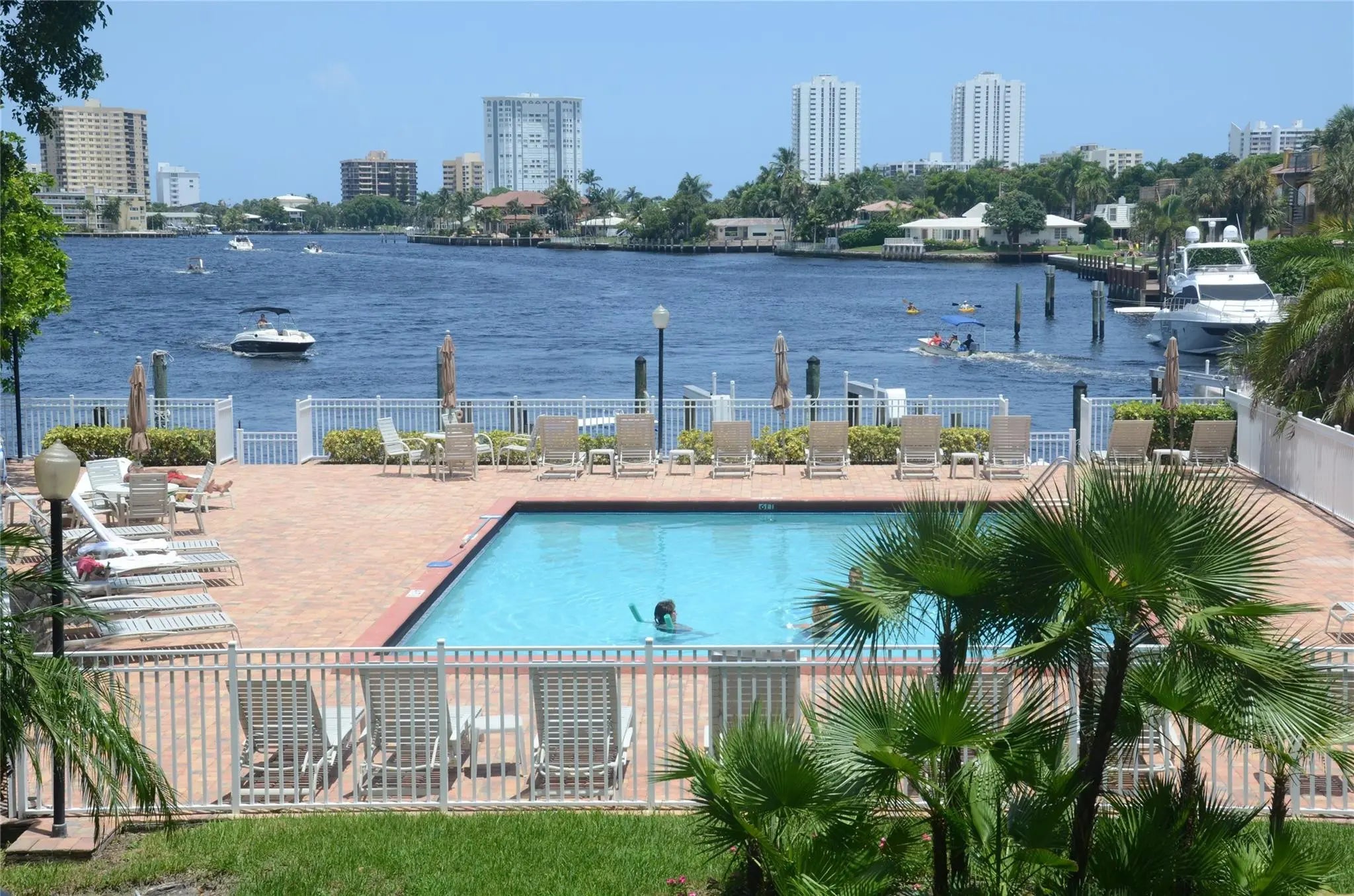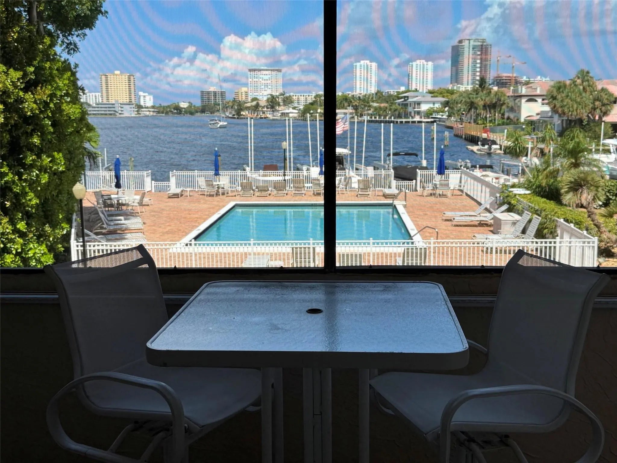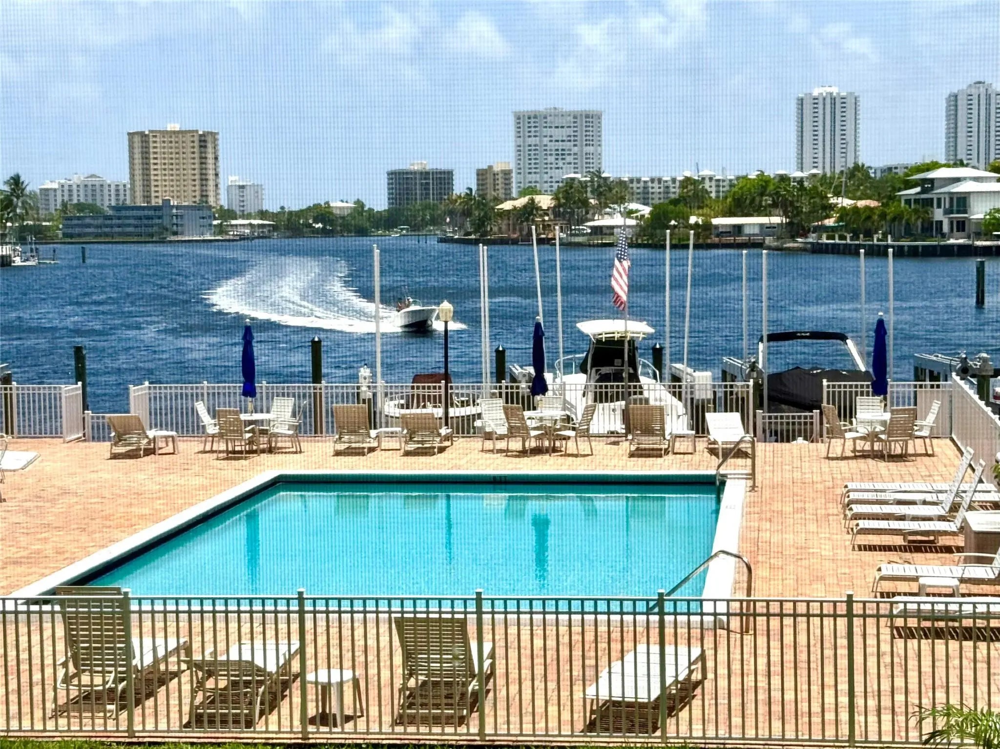 Enjoy direct water views from every room of the pool, marina, and ICW/Lake Santa Barbara! This spacious 2-bedroom, 2-bathroom unit boasts a 40-foot screened-in balcony accessible from the living room and both bedrooms, featuring impact windows and high-end sliding shutters.Inside, you'll find floor-to-ceiling sliders in the living room and bedrooms, custom blackout shades in the bedrooms, and large, neutral porcelain floor tiles throughout the living, dining, and kitchen areas. Both bedrooms have Berber carpet. This unit offers one of the largest 2/2 floor plans in the building, plus extra closet space and the largest covered parking space. Small pets ok. This mid-rise building offers two elevators and secure key-fob entry to the lobby and gym. Residents enjoy a large, heated/cooled swimming pool, well-kept grounds, a dock with deeded marina slips, and a BBQ area. The building also features an extensive number of guest parking spaces, a party room with a bar, library, pool table, dance floor, and large-screen TV, a gym, and a bicycle storage room.