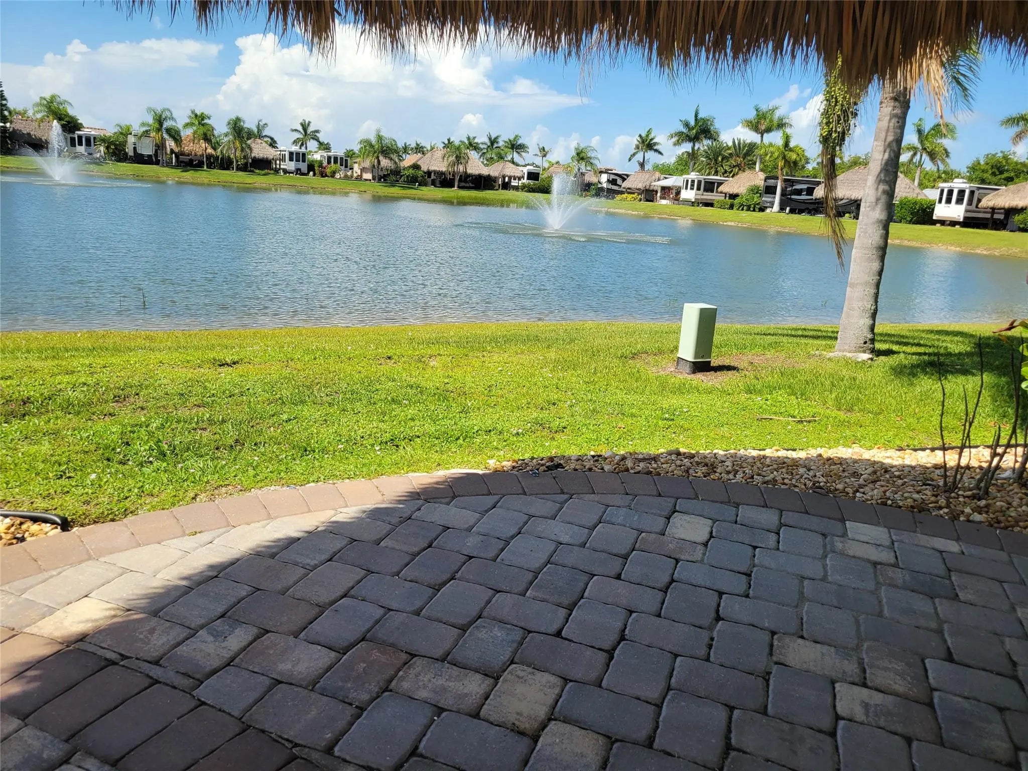 Amazing lakefront lot located in Silver Palms Rv Resort, a 5 star gated community 1/4 mile from Lake Okeechobee. Lot features a unique custom designed octagon tiki with roll down shades overlooking the lake and fountains. 12X14 casita with 1/2 bath, ac, washer/dryer ,fridge ,queen size murphy bed, pantry and kitchen countertop. Retractable awning from casita provides additional shade for outdoor cooking. Excellent opportunity for year round or seasonal use. Lot can be rented when not being used. Daily activities, clubhouse, card, billiard, library and fitness center Poolside cafe with live music. and so much more awaits you at this well maintained and active community. Escape the cold every year and see why Silver Palms is the place to be.