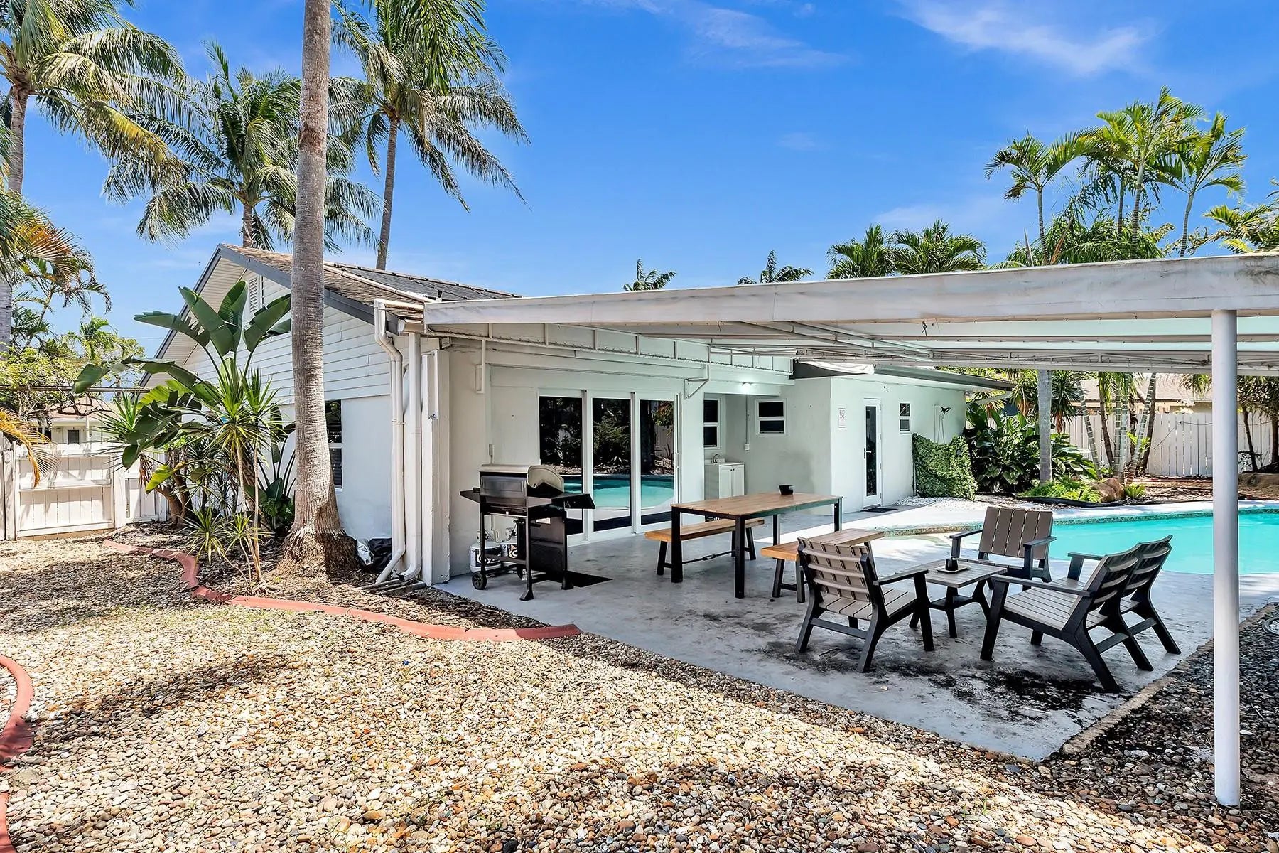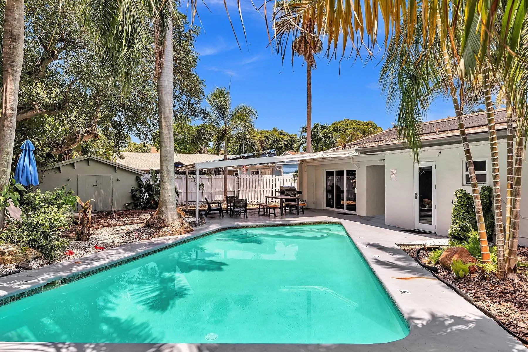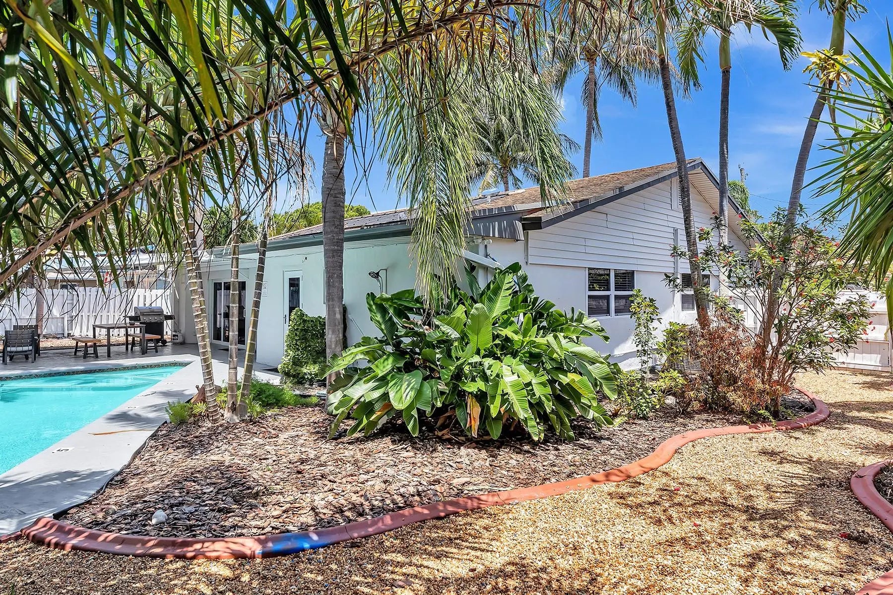 Welcome to tropical living in this beautifully updated East Fort Lauderdale home on an expansive 10,000+ sq. ft. double lot. The open layout features hurricane-impact windows and doors, recessed lighting, and stylish tile flooring throughout. The kitchen is enhanced with quartz countertops, stainless appliances, and custom cabinetry. Two flexible rooms offer options for a fourth bedroom, office, or guest suite. Step outside to a private fenced yard with vibrant landscaping, a solar-heated pool, and a covered patio perfect for relaxing or entertaining. Offered fully furnished and move-in ready—ideal for living, vacationing, or investment.