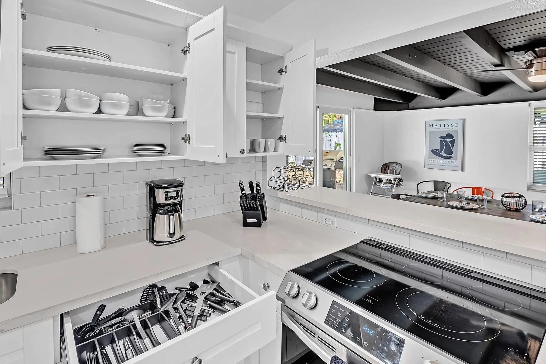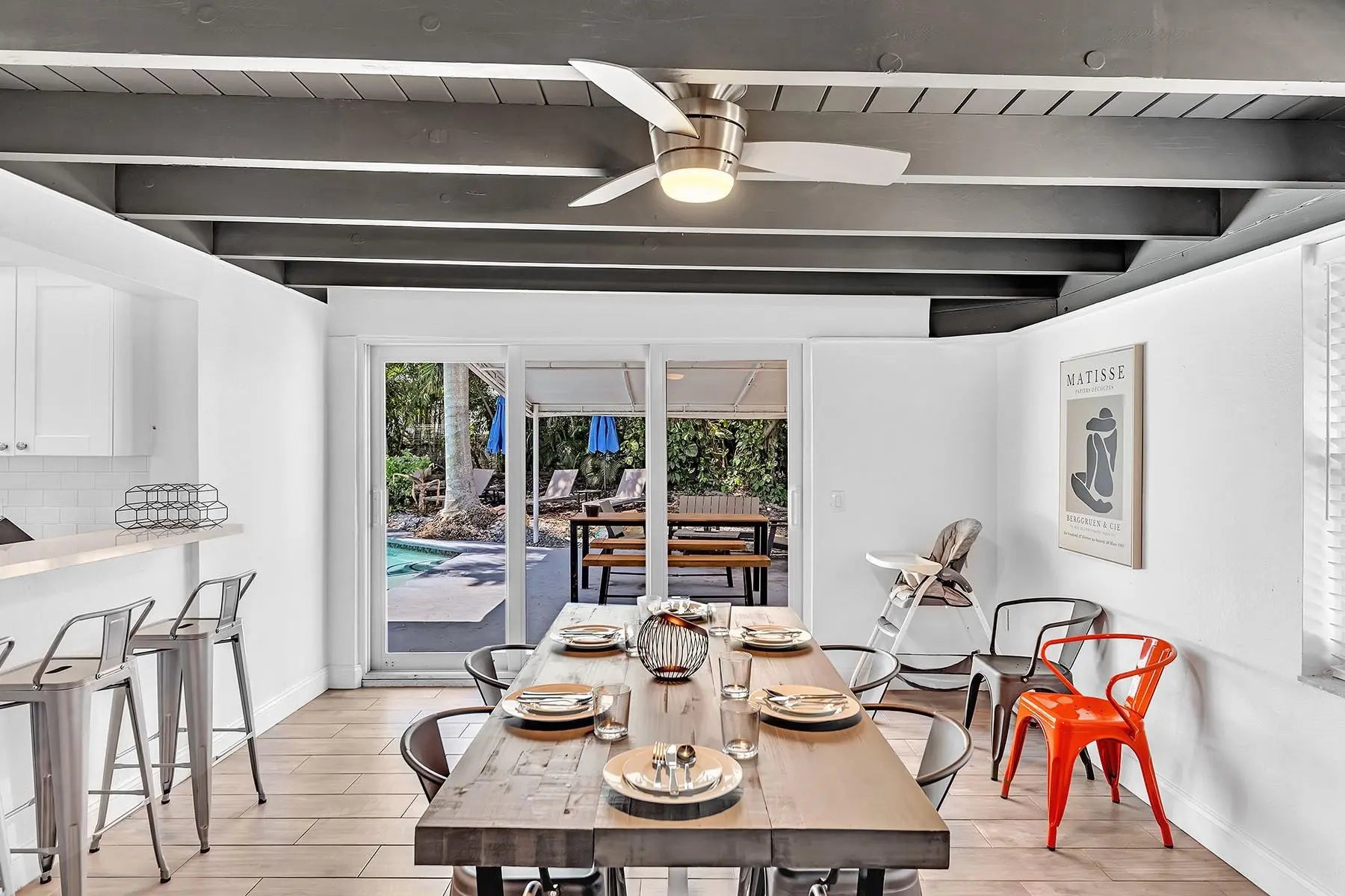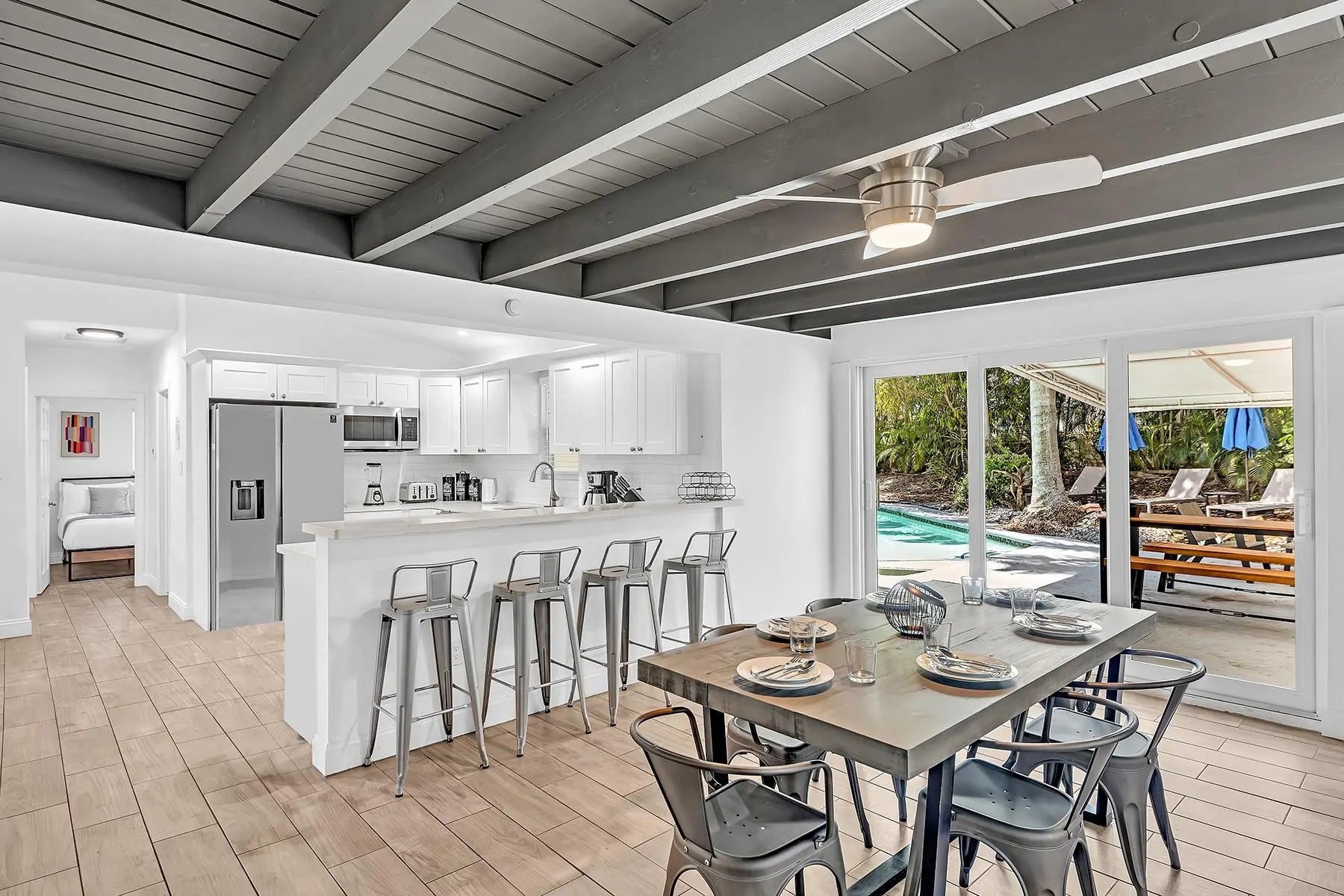 Welcome to tropical living in this beautifully updated East Fort Lauderdale home on an expansive 10,000+ sq. ft. double lot. The open layout features hurricane-impact windows and doors, recessed lighting, and stylish tile flooring throughout. The kitchen is enhanced with quartz countertops, stainless appliances, and custom cabinetry. Two flexible rooms offer options for a fourth bedroom, office, or guest suite. Step outside to a private fenced yard with vibrant landscaping, a solar-heated pool, and a covered patio perfect for relaxing or entertaining. Offered fully furnished and move-in ready—ideal for living, vacationing, or investment.