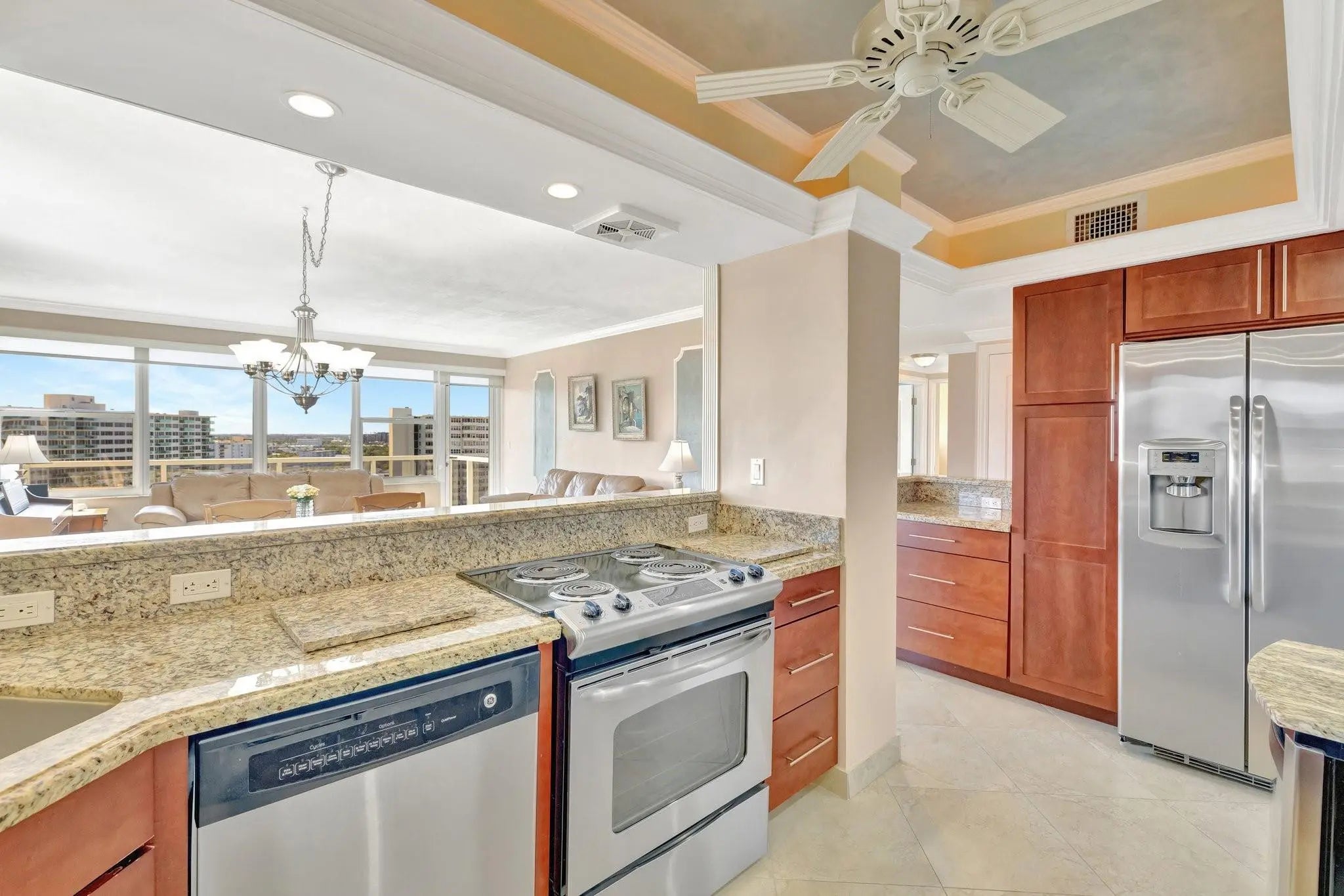 Luxurious corner residence with OCEAN, INTRACOASTAL AND POOL VIEWS. Why settle for just one view, when here you can get all three? Chef's kitchen with granite countertops and tray ceiling adorned with venetian stucco design. Sprawling 2 bedroom with all updates desired. Primary bedroom features seating area, huge walk in closet and expanded bathroom. Tankless water heater. A+ RATED BUILDING WITH SOLD FINANCIALS. IntraCoastal Clubhouse with dock for all your parties. 55+ community with fitness center, bocce ball court, 24/7 security, 5 acres of lush landscaping and HUGE heated pool. Cash only + $97,632 income required. Maintenance includes water, sewer, trash, high speed fiber optic internet and basic cable