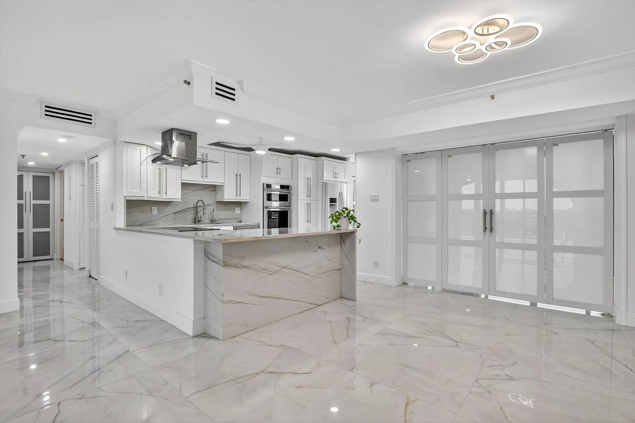 Amazing Condo with spectacular Views, Vistas, and Sunsets. Spacious Primary bedroom-bathroom suite. Large walk-in. Third bedroom currently a den / office, can easily be converted to 3rd bedroom. Three FULL bathrooms. Recently, completely updated, new AC, water-heater, Bosch cook-top, stacked clothes washer and dryer combo, Kitchen-aid wall oven with microwave, and new Bosch dishwasher. Both patios glassed / screened in bringing the floor-plan under AC to 2150sqft. Use of updated private pool cabana, private pool, hot-tub, exercise room, and card room. Upfront parking and storage area. Optional Membership at the Boca Pointe club.