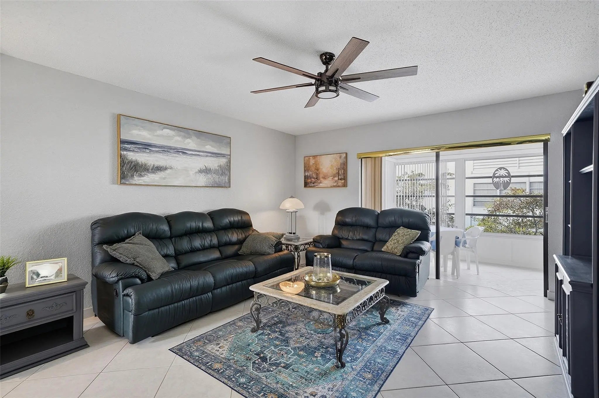 Move-in ready 2BR/2BA condo in the desirable Topaz South 55+ community. This spacious unit features tile flooring throughout, a large living and dining area, and an enclosed Florida room for added living space. Interior freshly painted with all new ceiling fans. Building has passed the 50-year inspection and offers a new roof, freshly painted exterior, and no upcoming assessments. Split-bedroom layout provides privacy with ample closet and storage space. Enjoy amenities including a heated pool, tennis courts, clubhouse, and fitness room. Conveniently located near shopping, dining, and major roadways. Low monthly fee includes water, insurance, trash, lawn, and pest control. Furniture is negotiable. The association has a great budget. The association requires only 10% down. The low monthly maintenance makes this an awesome opportunity.
