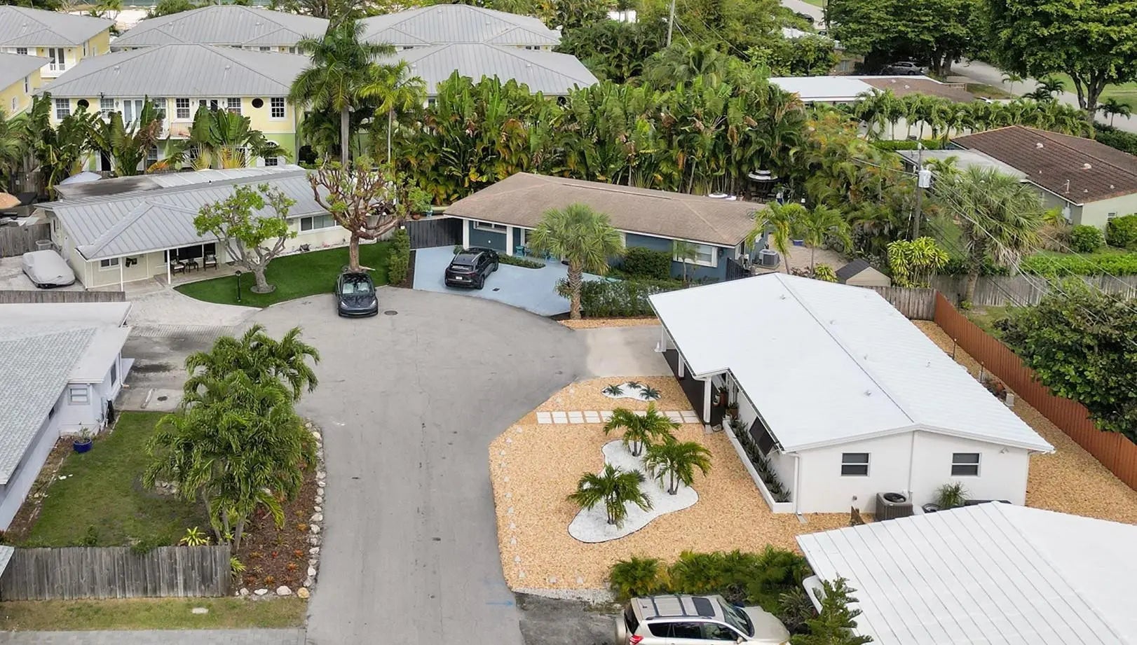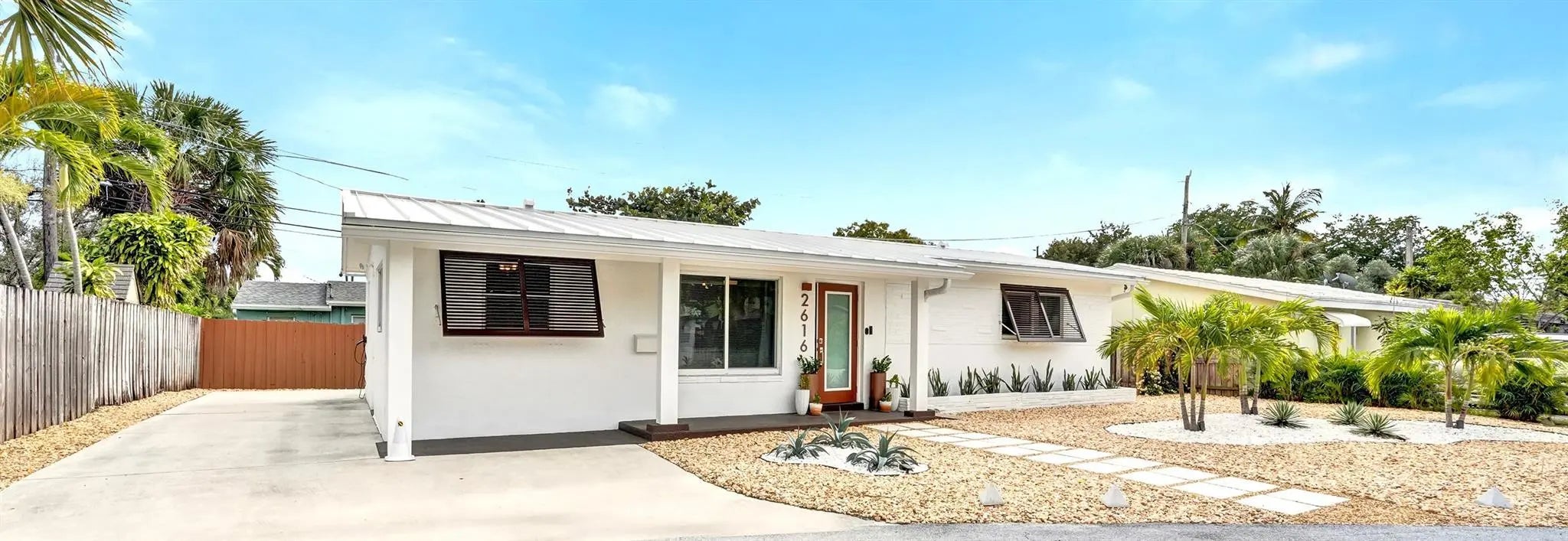 Location, Location, Location! Just steps to "The Drive's" restaurants, bars, shops, Publix & CVS. This charming open concept 3 bedroom, 1 bath home is nestled on a secluded cul-de-sac. All impact windows & doors. Re-engineered with precision in 2025 inside & outside. White metal roof (2025) with roof to wall tie downs giving maximum HURRICANE PROTECTION & maximum electricity savings. Updated kitchen & bathroom. New exterior paint, Bahama shutters, PVC columns, rain gutters. Professionally landscaped Palm Springs style yard for easy, low cost maintenance! Updated electric including outdoor motion sensor security lighting. Newer central AC. 9'x9' indoor laundry/storage room with space for a 2nd bathroom. Be the lucky owner/investor to have a carefree & close to everything lifestyle!