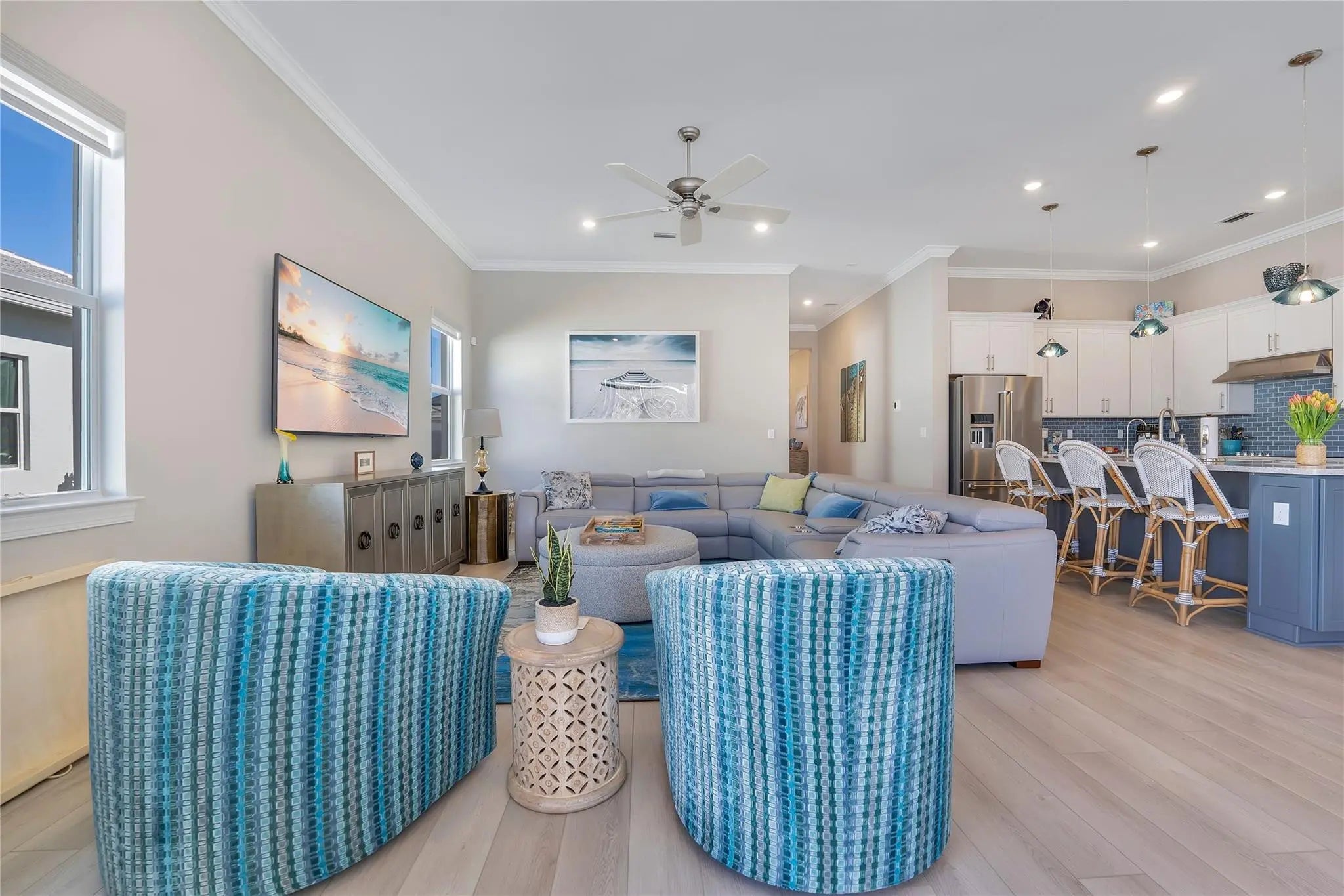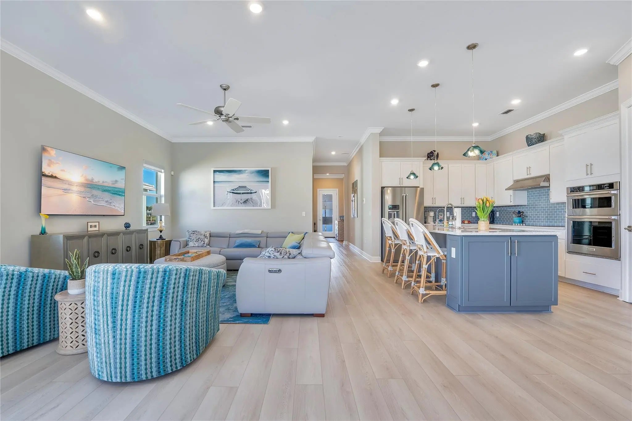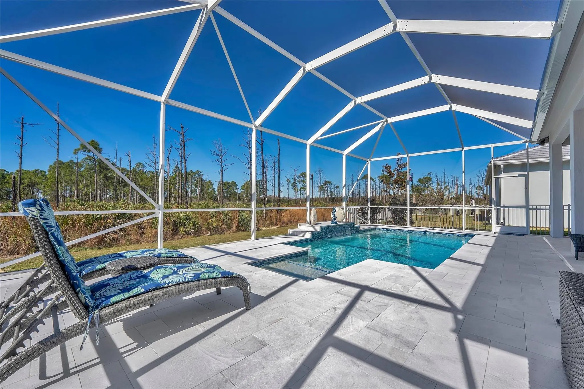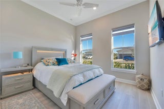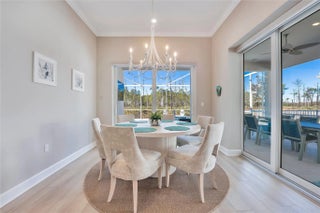 Beautifully upgraded new construction home with over $265,000 in builder and post-closing upgrades. The open layout features a built-in kitchen with upgraded cabinetry, countertops, backsplash, KitchenAid appliances, and pendant pre-wiring, flowing into the gathering room. Zero-corner sliding doors open to an extended covered lanai and private pool for seamless indoor-outdoor living. Interior upgrades include luxury vinyl plank flooring, 8' solid-core doors, crown molding, recessed LED lighting, and two-tone paint. Split floor plan offers 3 bedrooms, 3 baths, a private den, upgraded laundry room, custom closets, motorized window treatments, outdoor speakers, security system, and garage upgrades. Move-in ready.All furniture was purchased at Haverty's for $60k basically brand new included.