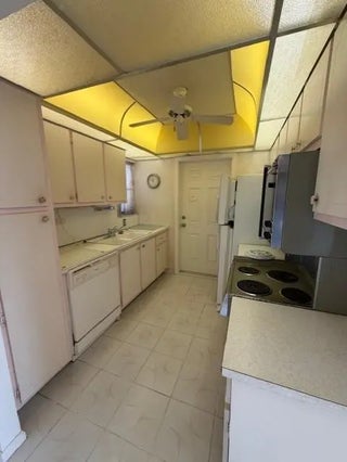 Corner unit in need of a complete refurbishing in a meticulously maintained complex. Endless possibilities. Lots of space. Master has an in bedroom full bathroom and access to a balcony/patio. Walk-in closets. Dining area off kitchen. Spacious, light filled living room. Impact doors. On site laundry. Apartment is priced to attract a Buyer who will purchase & update. Association says minimum 55 years of age. NO renting permitted. Secure fencing surrounds the building.