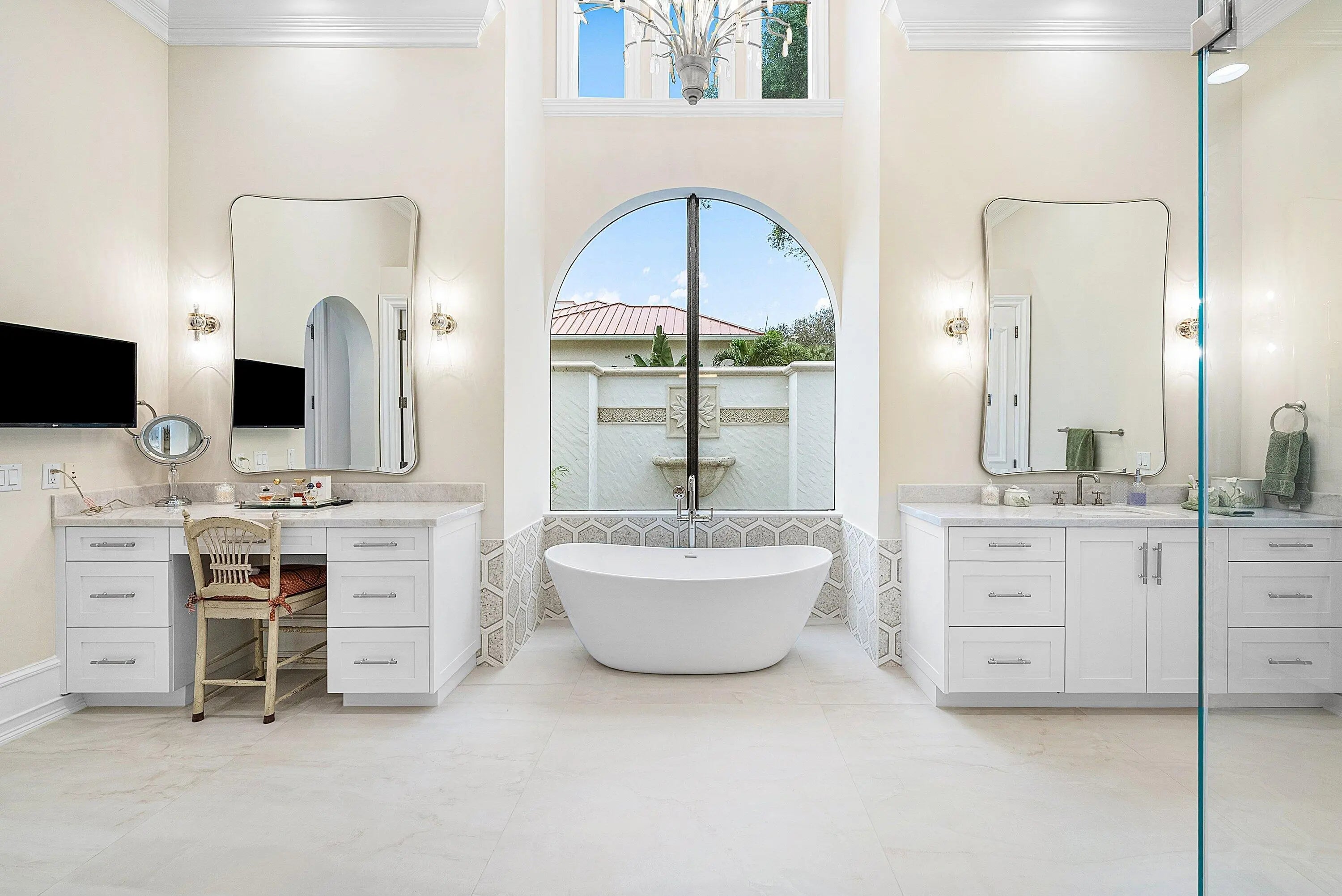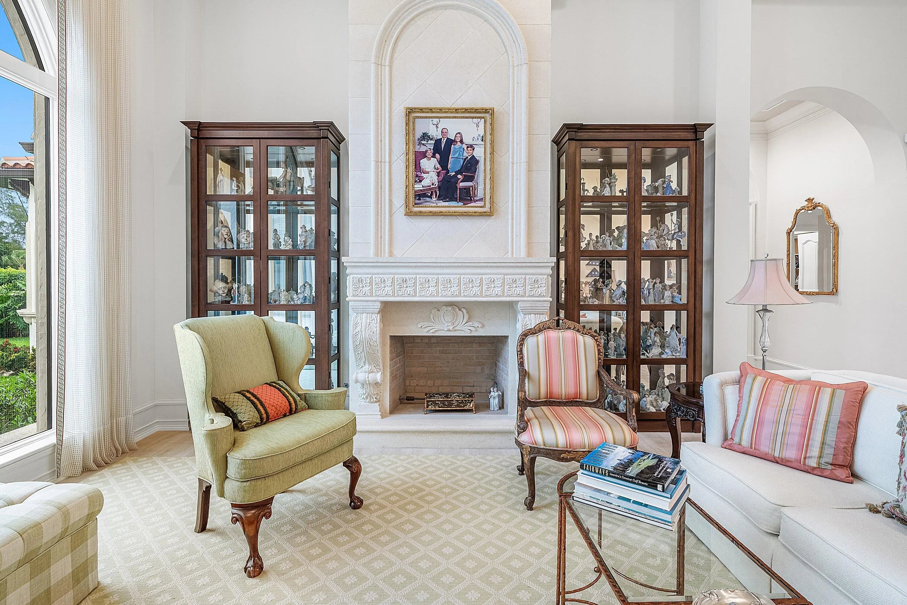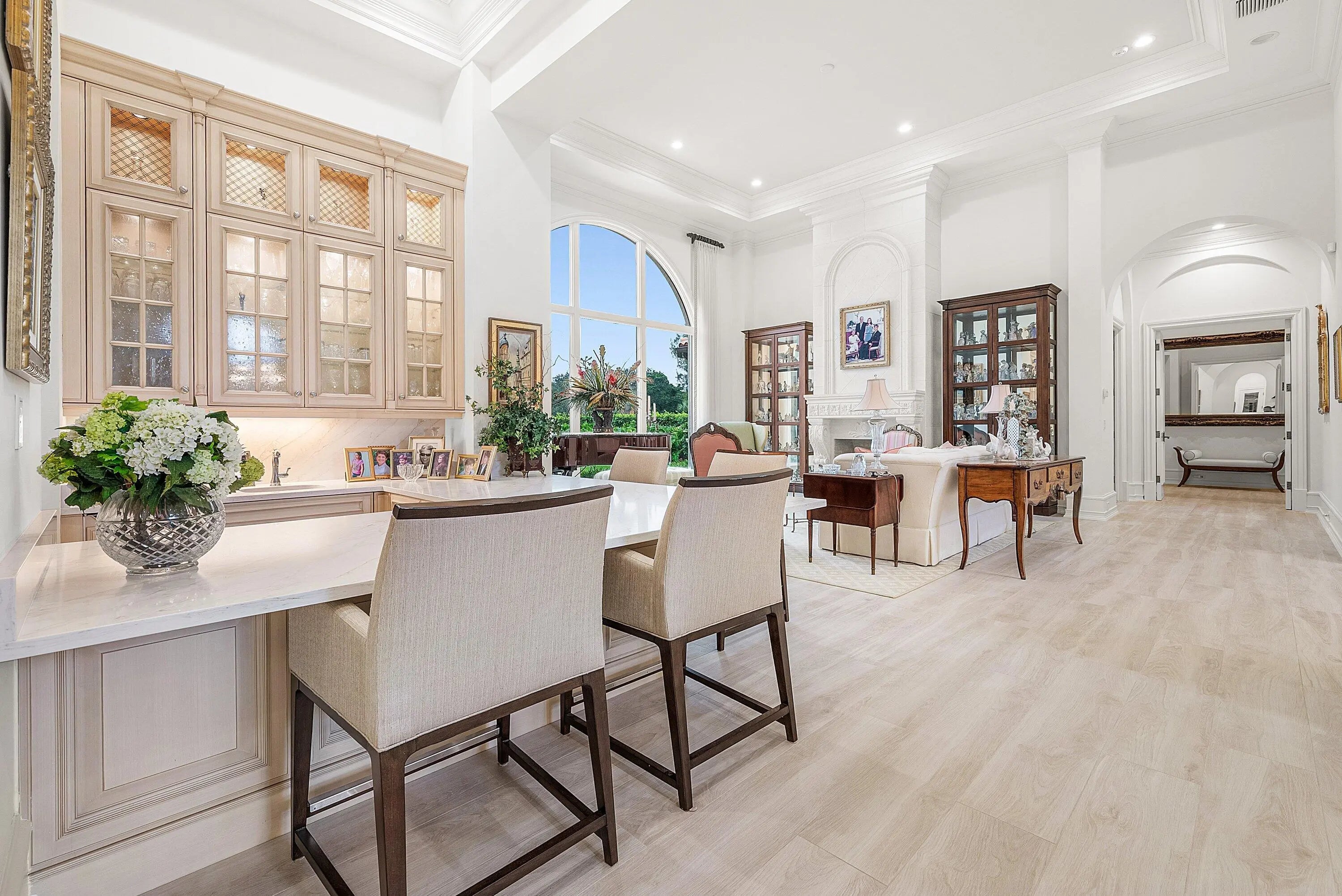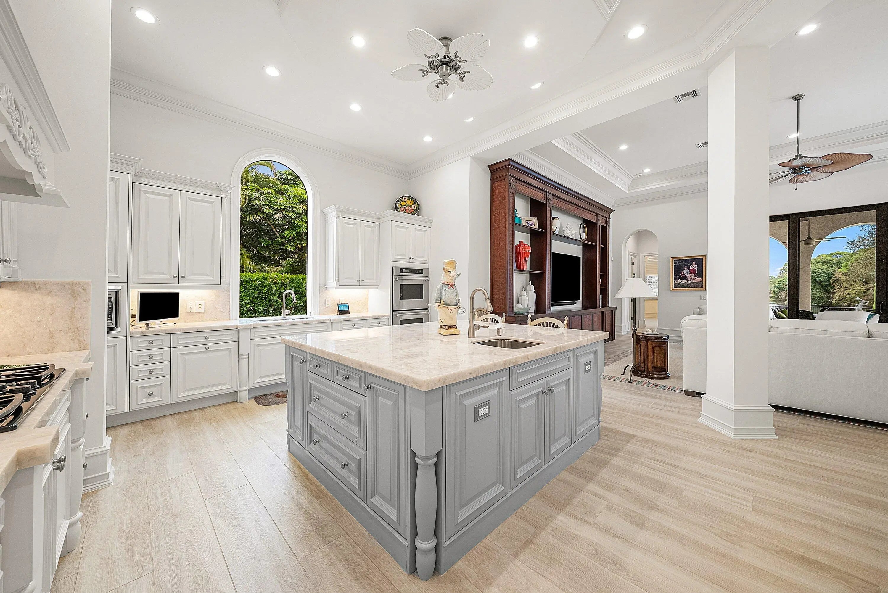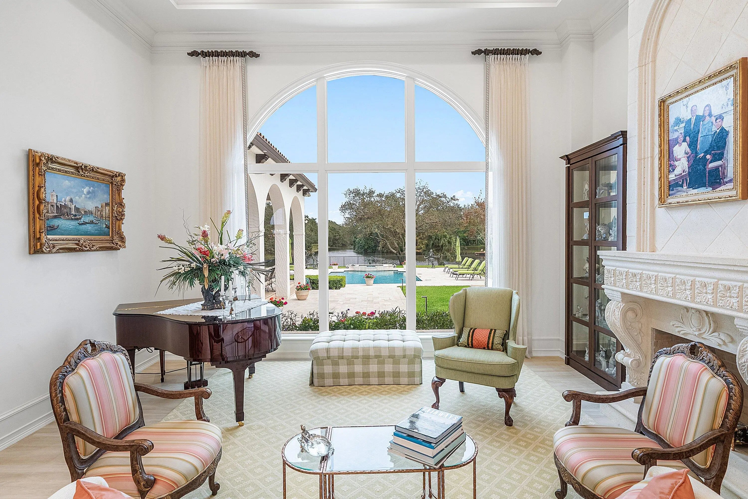 Discover exceptional luxury and stunning water views from this 7,200 sq. ft. Sabatello Signature estate, set on a full acre in the highly sought-after Steeplechase community. Thoughtfully designed and beautifully finished, the home offers 5 bedrooms, 6.5 baths, a refined library/office, a generous media or bonus room, a second-floor loft with sitting and study areas, and a four-car air conditioned garage. From the moment you enter, the grand foyer—with its intricate ironwork and soaring ceilings—sets the tone for the craftsmanship found throughout. Custom millwork enhances every space, while the first floor features brand-new porcelain tile, an office, a bonus room, and the primary suite. The primary suite is a true private retreat, complete with a spacious sitting area framed by arched windows that capture serene lake views. Two newly updated primary en-suite bathrooms featuring sleek glass showers, a soaking tub with a picturesque window view, new vanities, and updated flooring. The suite also includes an exercise or hobby area with a juice bar and two large custom walk-in closets. The gourmet kitchen, upgraded in 2022, is a chef's dream, boasting rich wood cabinetry, granite countertops, expansive center island and top-of-the-line appliances including Sub-Zero, Thermador, Bosch, and Dacor. Offering Florida indoor/outdoor living, steps away see the wall of sliders spanning the rear of the home to allow effortless entertaining in the expansive covered loggia with a summer kitchen, gas BBQ, and Sub-Zero fridge, all overlooking the stunning pool, spa, and cascading water features enhancing the serene experience. New pool, summer kitchen, waterfall and patio in 2022. With lush landscaping, a circular brick-paved driveway with a tiered fountain, and stunning wide water views, this estate offers the perfect blend of elegance, privacy, and convenience. Complete impact windows throughout, including front and garage doors, whole house generator, air conditioned garages, Four-zone A/C and modern automation systems complete this exceptional property. A true masterpiece in one of Palm Beach Gardens' most sought-after communities! Schedule your private showing and experience this extraordinary home for yourself.