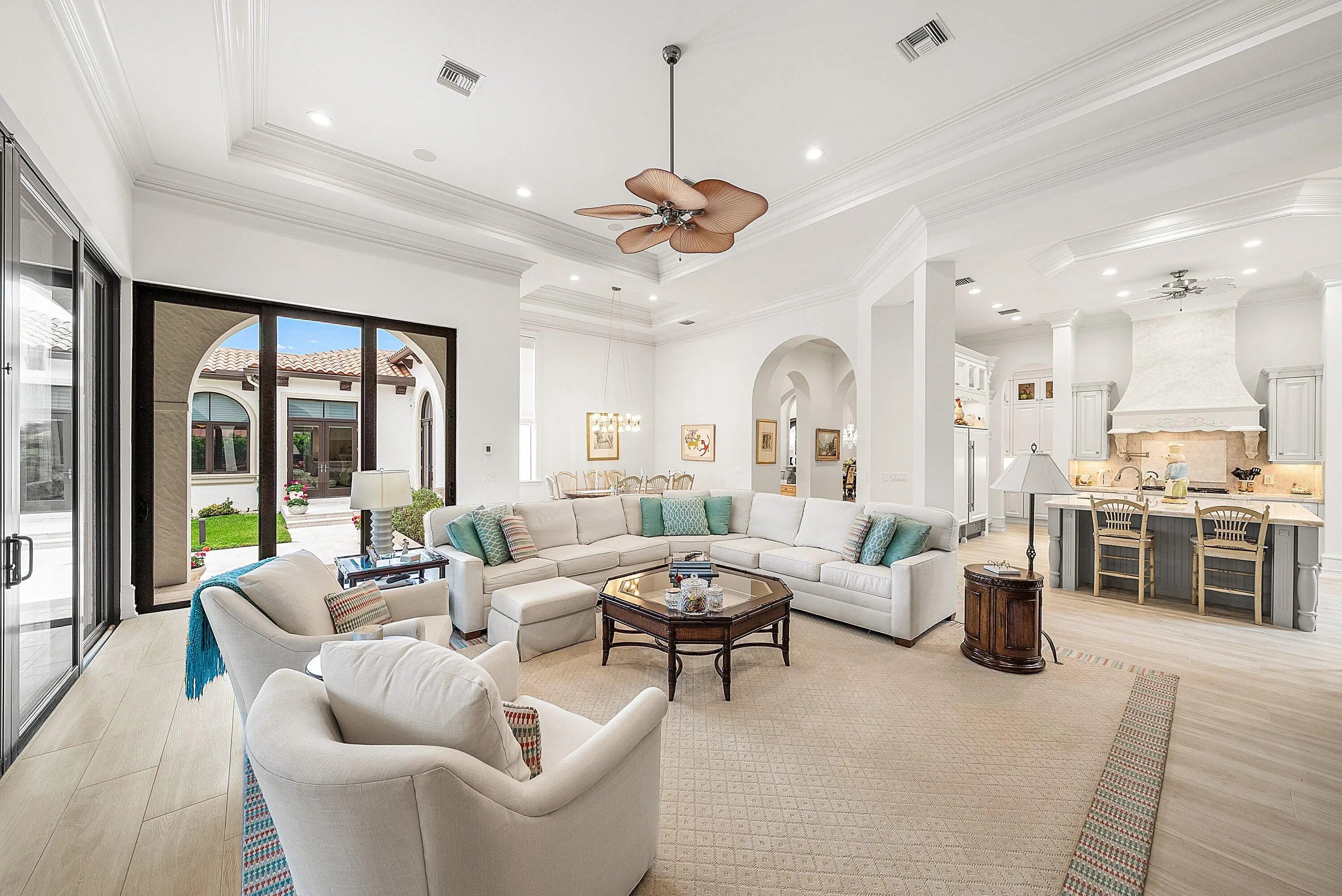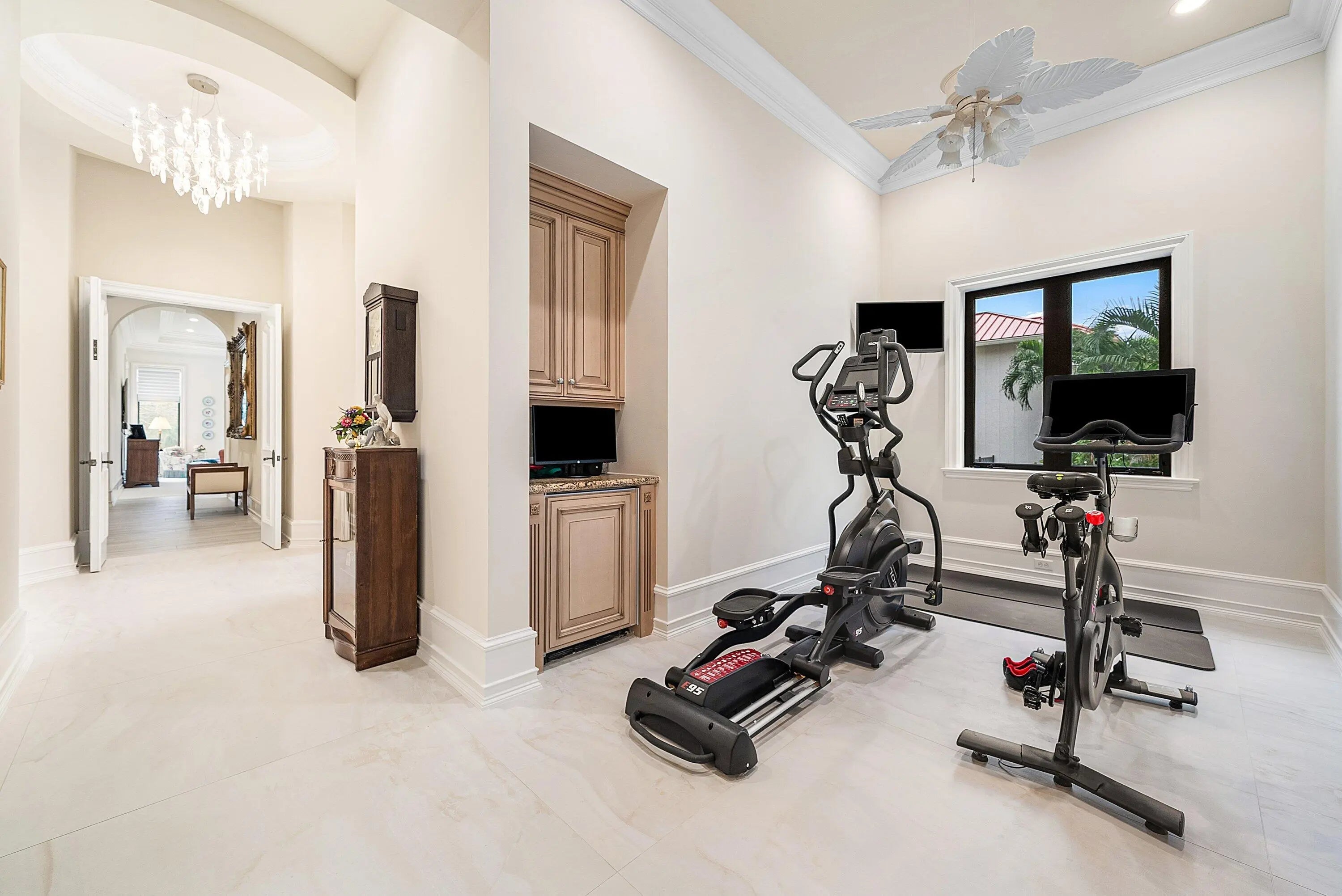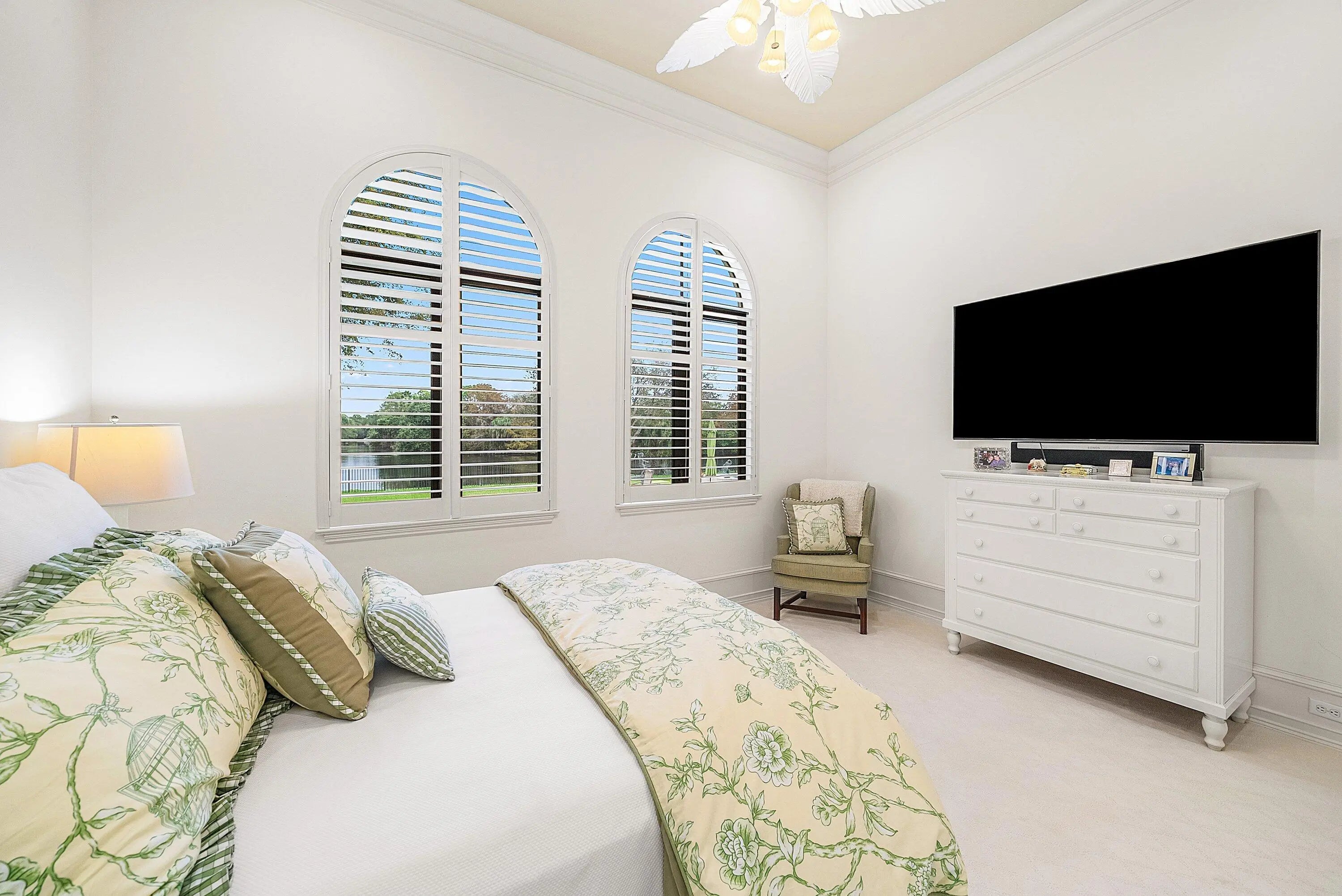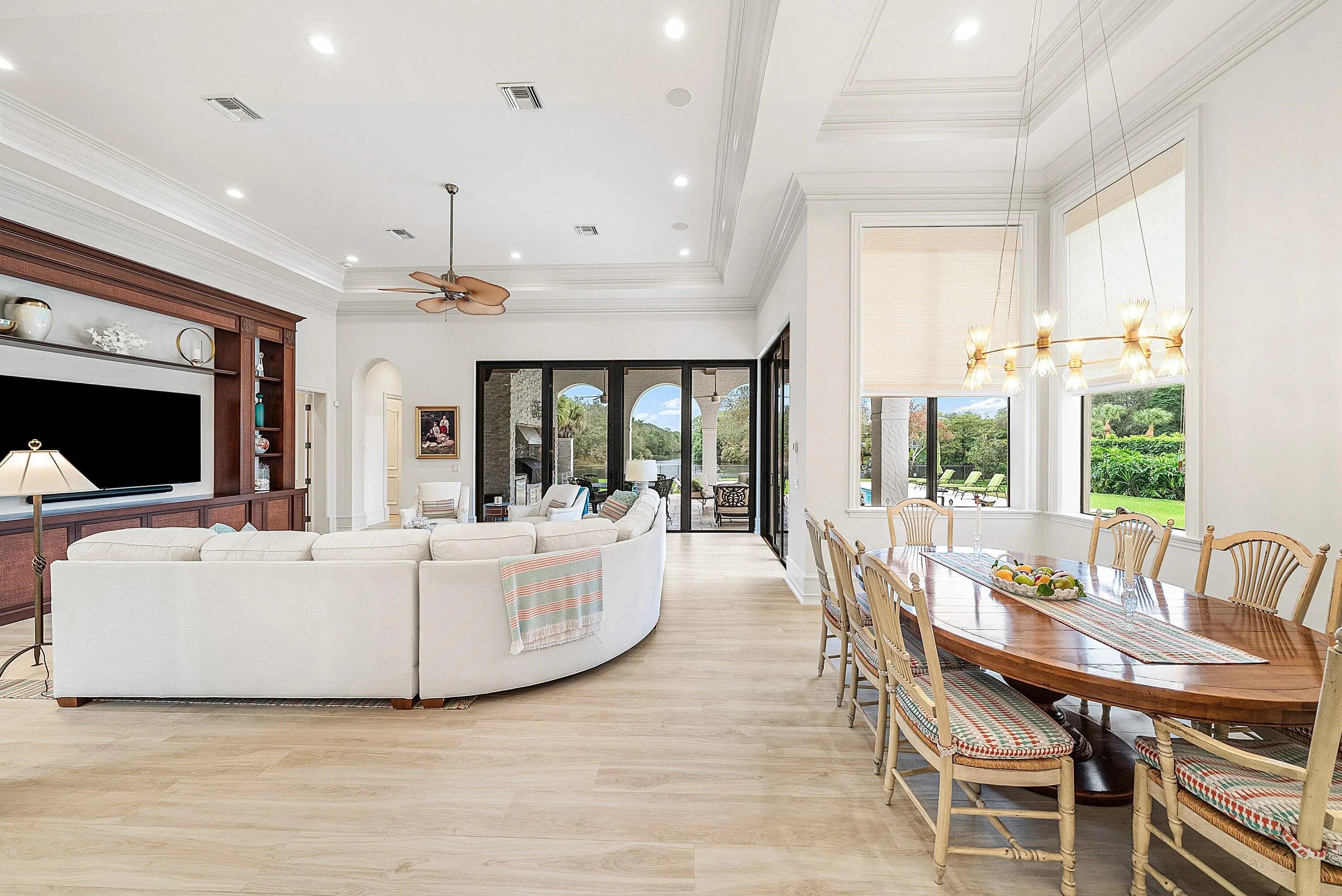 Discover exceptional luxury and stunning water views from this 7,200 sq. ft. Sabatello Signature estate, set on a full acre in the highly sought-after Steeplechase community. Thoughtfully designed and beautifully finished, the home offers 5 bedrooms, 6.5 baths, a refined library/office, a generous media or bonus room, a second-floor loft with sitting and study areas, and a four-car air conditioned garage. From the moment you enter, the grand foyer—with its intricate ironwork and soaring ceilings—sets the tone for the craftsmanship found throughout. Custom millwork enhances every space, while the first floor features brand-new porcelain tile, an office, a bonus room, and the primary suite. The primary suite is a true private retreat, complete with a spacious sitting area framed by arched windows that capture serene lake views. Two newly updated primary en-suite bathrooms featuring sleek glass showers, a soaking tub with a picturesque window view, new vanities, and updated flooring. The suite also includes an exercise or hobby area with a juice bar and two large custom walk-in closets. The gourmet kitchen, upgraded in 2022, is a chef's dream, boasting rich wood cabinetry, granite countertops, expansive center island and top-of-the-line appliances including Sub-Zero, Thermador, Bosch, and Dacor. Offering Florida indoor/outdoor living, steps away see the wall of sliders spanning the rear of the home to allow effortless entertaining in the expansive covered loggia with a summer kitchen, gas BBQ, and Sub-Zero fridge, all overlooking the stunning pool, spa, and cascading water features enhancing the serene experience. New pool, summer kitchen, waterfall and patio in 2022. With lush landscaping, a circular brick-paved driveway with a tiered fountain, and stunning wide water views, this estate offers the perfect blend of elegance, privacy, and convenience. Complete impact windows throughout, including front and garage doors, whole house generator, air conditioned garages, Four-zone A/C and modern automation systems complete this exceptional property. A true masterpiece in one of Palm Beach Gardens' most sought-after communities! Schedule your private showing and experience this extraordinary home for yourself.